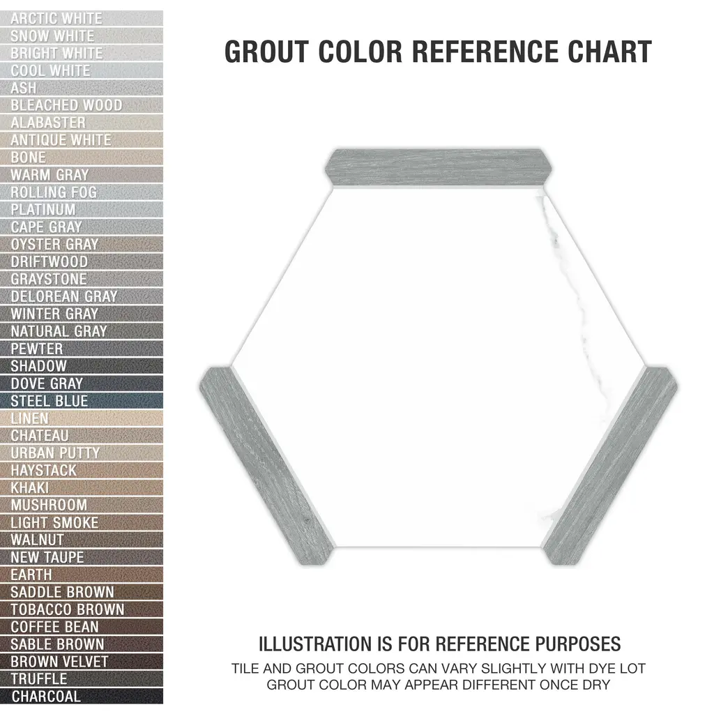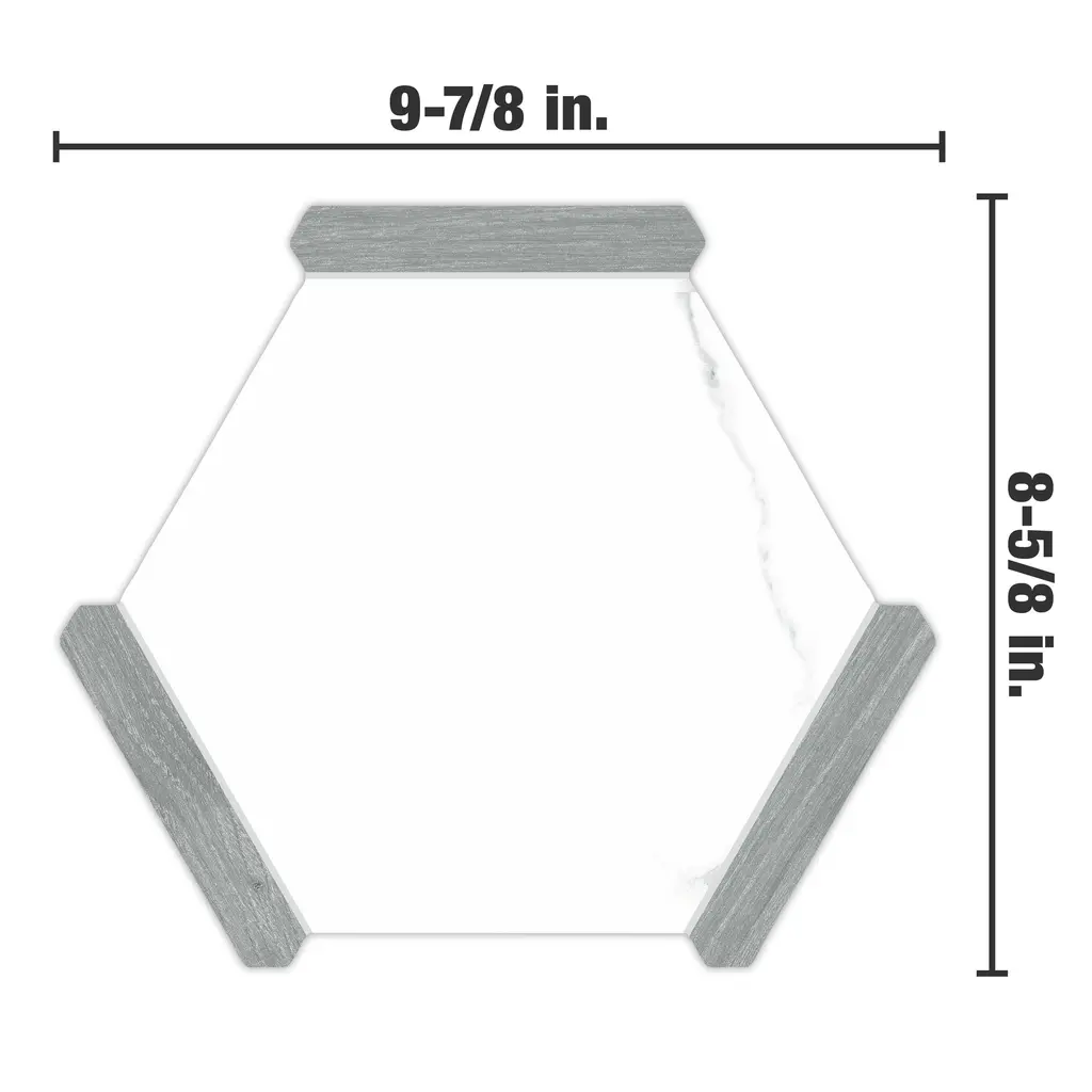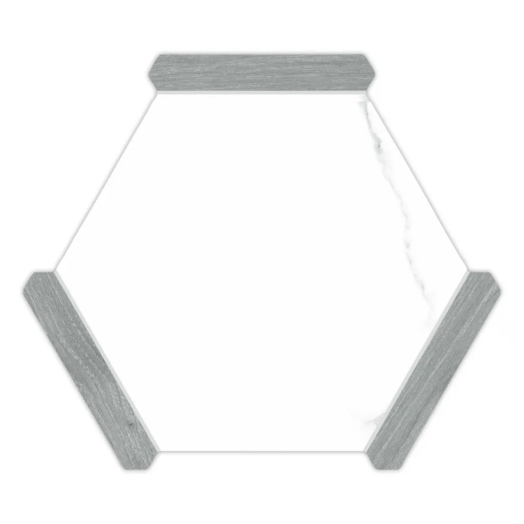 Capturing the appearance of a marble look, our Marwood Panal Calacatta with Grey Picket Porcelain Floor and Wall Tile features a smooth, matte finish, providing decorative appeal that adapts to a variety of stylistic contexts. The Marwood Porcelain Tile collection is inspired by medieval Spanish architecture, with its interlocking hexagons with pickets and a blend of white marble and wood, creating a sophisticated and dramatic space. Containing 24 different print variations that are randomly distributed throughout each case, this white specialty tile offers a one-of-a-kind look. With its impervious, frost-resistant features, this tile is an ideal selection for both indoor and outdoor commercial and residential installations, including kitchens, bathrooms, backsplashes, showers, hallways, entryways, patios and fireplace facades. This tile is a perfect choice on its own or paired with other products in the Marwood Collection. Tile is the better choice for your space! 8.06 square feet, 18 pieces per case. Case weight is 29.43 lbs. Grade 1, first-quality porcelain tile for floor and wall use 8.63 in. width x 9.88 in. length x 0.31 in. thick Glazed, smooth finish with a low sheen and moderate variation in tone PEI Rating IV has high resistance to abrasion and is suitable for heavy-duty residential and commercial kitchens, hotels, exhibition and sales rooms with some dirt conditions Impervious tiles have a water absorption of less than 0.5% for indoor and outdoor use and are frost resistant This tile is ADA approved for slip resistance with a DCOF value of 0.42 or higher. Completely frost resistant for indoor or outdoor applications; use a latex-modified thinset for acceptable bond strength Please note: A sample of this product may be a partial piece cut from the full size tile in order to provide an affordable and convenient way for customers to judge the quality and finish of this item. Samples are not returnable.