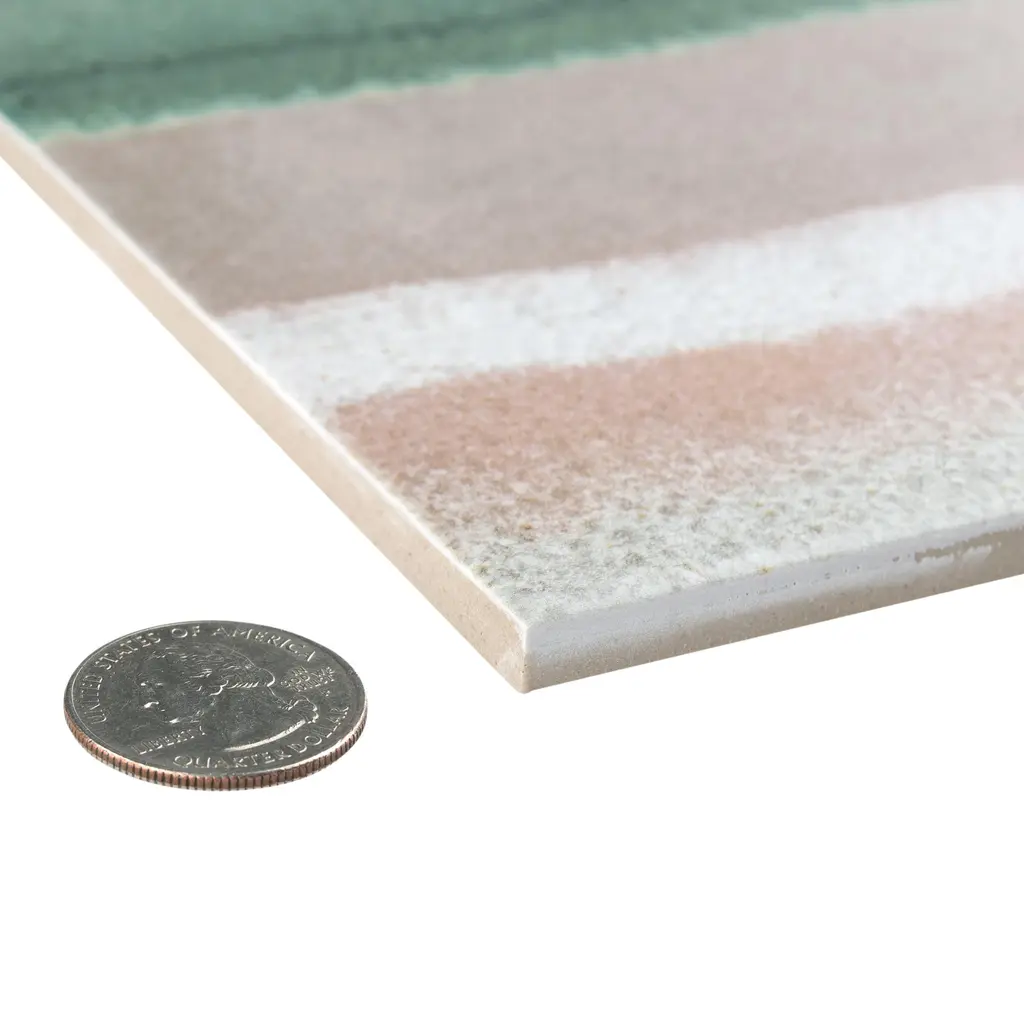 Reinterpreting the beauty of land and sea from an artist's viewpoint, our Matter Canvas Taupe Green Porcelain Floor and Wall Tile offers a highly personal and unique view of nature's most beautiful landscapes. This square tile features brushstroke patterns in soft pink, beige, green and white tones that echo the look and feel of sandy beaches, rolling waves and endless horizons. As a result of refined digital inkjet techniques and color blending, this tile offers exquisite depth and dimension that is further enhanced by its textured, mixed finish surface. Available in thirty print variations that are randomly distributed throughout each case, this tile offers a truly one-of-a-kind look. Its impervious, frost-resistant, and durable features make it an ideal choice for both indoor and outdoor commercial and residential installations including kitchens, bathrooms, backsplashes, showers, and pools. This tile is an ideal choice on its own or paired with other products in our Matter Collection to create a customized installation. Tile is the better choice for your space. This tile is made from natural ingredients, making it a healthy choice as it is free from allergens, VOCs, formaldehyde, and PVC. 6.5 square feet, 25 pieces per case. Case weight is 22.5 lbs. Grade 1, first-quality porcelain tile for floor and wall use 6 in. width x 6 in. length x 0.31 in. thick Glazed, slightly textured finish with a mixed finish and random variation in tone PEI Rating IV has high resistance to abrasion and is suitable for heavy-duty residential and commercial kitchens, hotels, exhibition and sales rooms with some dirt conditions Impervious tiles have a water absorption of less than 0.5% for indoor and outdoor use and are frost resistant This tile is ADA approved for slip resistance with a DCOF value of 0.42 or higher. Completely frost resistant for indoor or outdoor applications; use a latex-modified thinset for acceptable bond strength Please note: A sample of this product may be a partial piece cut from the full size tile in order to provide an affordable and convenient way for customers to judge the quality and finish of this item. Samples are not returnable.