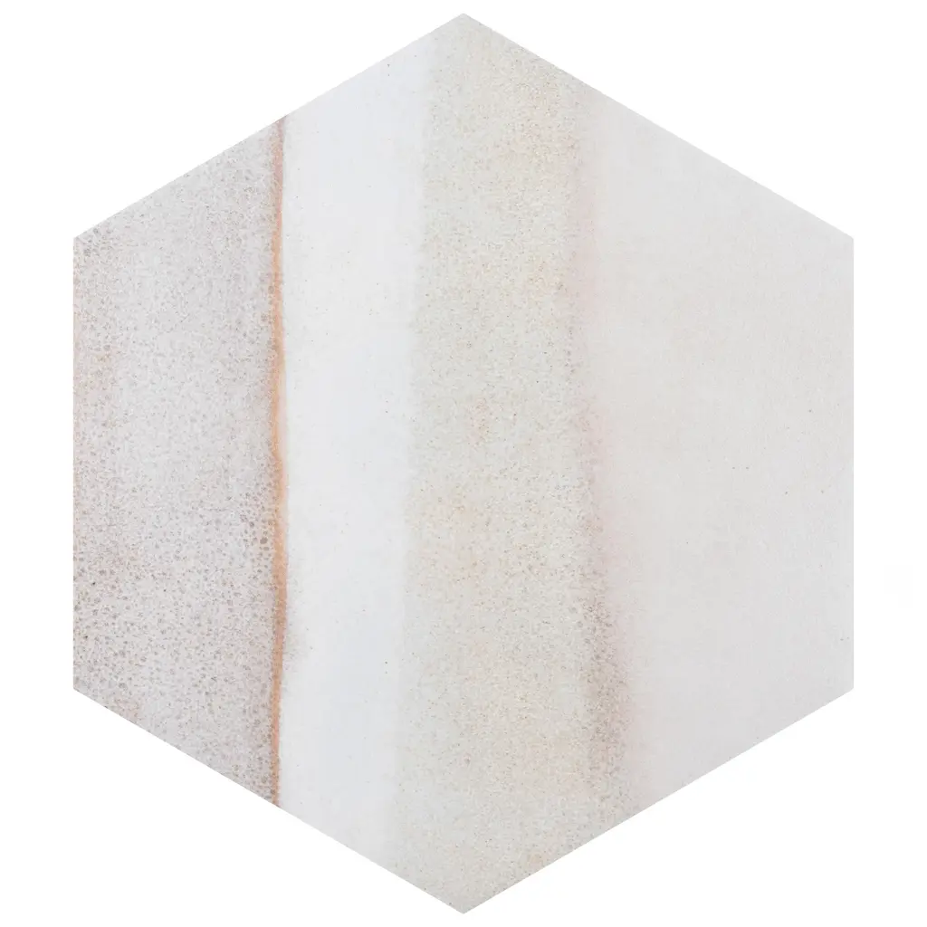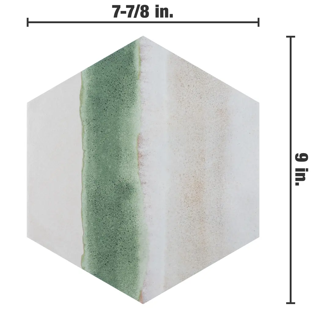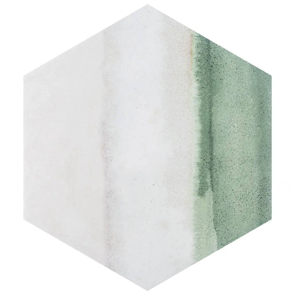 Reinterpreting the beauty of land and sea from an artist's viewpoint, our Matter Canvas Hex Bone Green Porcelain Floor and Wall Tile offers a highly personal and unique view of nature's most beautiful landscapes. This hexagon tile features brushstroke patterns in soft pink, beige, green and white tones that echo the look and feel of sandy beaches, rolling waves and endless horizons. As a result of refined digital inkjet techniques and color blending, this tile offers exquisite depth and dimension that is further enhanced by its textured, mixed finish surface. Available in twenty-six print variations that are randomly distributed throughout each case, this tile offers a truly one-of-a-kind look. Its impervious, frost-resistant, and durable features make it an ideal choice for both indoor and outdoor commercial and residential installations including kitchens, bathrooms, backsplashes, showers, and pools. This tile is an ideal choice on its own or paired with other products in our Matter Collection to create a customized installation. Tile is the better choice for your space. This tile is made from natural ingredients, making it a healthy choice as it is free from allergens, VOCs, formaldehyde, and PVC. 3.8 square feet, 10 pieces per case. Case weight is 14.77 lbs. Grade 1, first-quality porcelain tile for floor and wall use 7.88 in. width x 9 in. length x 0.31 in. thick Glazed, slightly textured finish with a mixed finish and random variation in tone PEI Rating V is suitable for both residential and high-traffic commercial use including extra heavy-duty floors and areas subject to severe pedestrian traffic over sustained periods with some dirt such as shopping centers, airport concourses, public walkways and industrial applications Impervious tiles have a water absorption of less than 0.5% for indoor and outdoor use and are frost resistant This tile is ADA approved for slip resistance with a DCOF value of 0.42 or higher. Completely frost resistant for indoor or outdoor applications; use a latex-modified thinset for acceptable bond strength Please note: A sample of this product may be a partial piece cut from the full size tile in order to provide an affordable and convenient way for customers to judge the quality and finish of this item. Samples are not returnable.