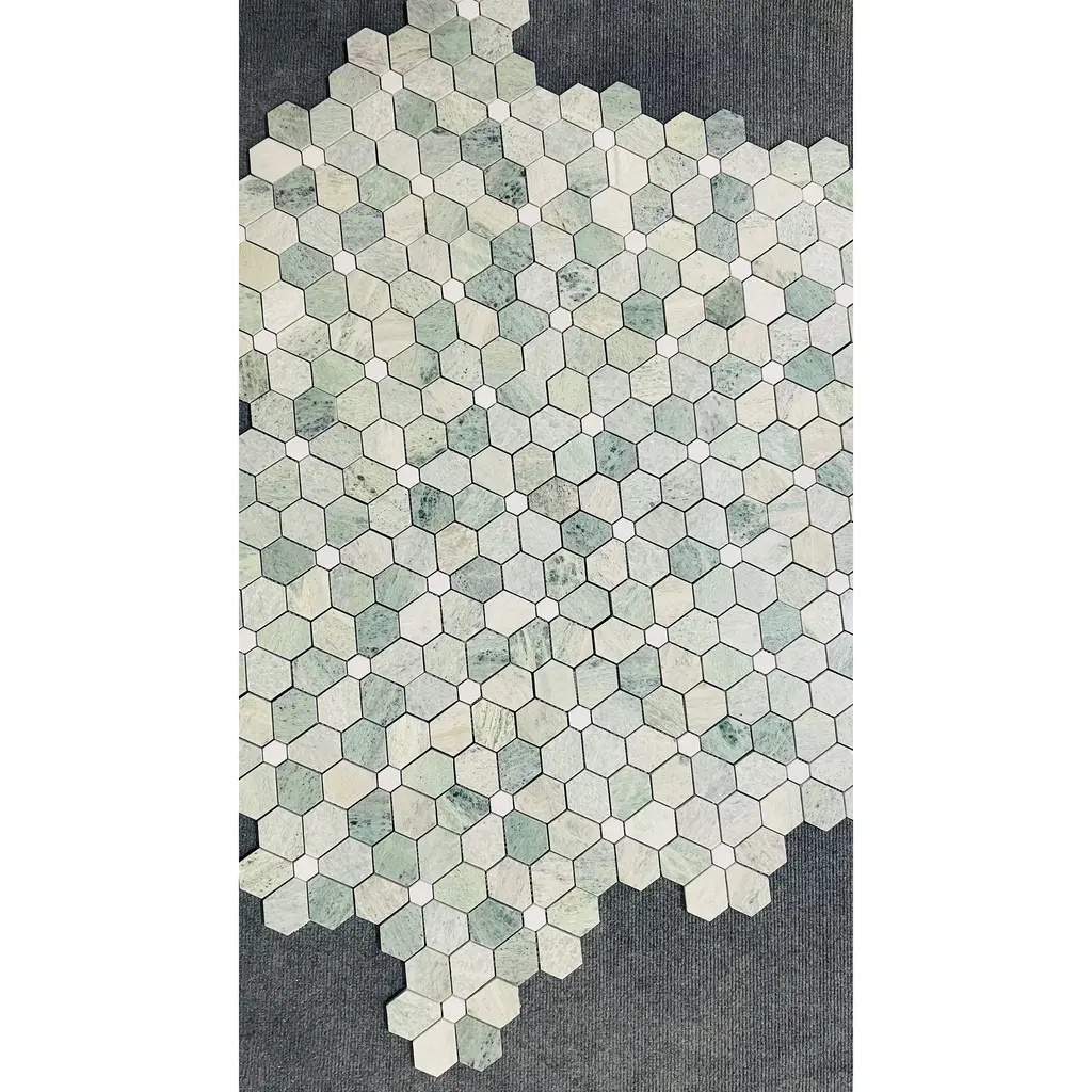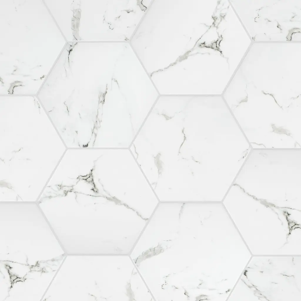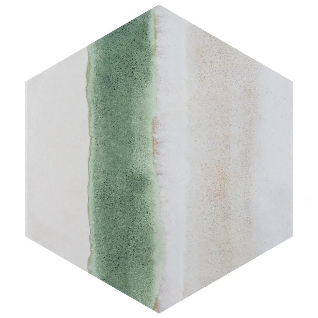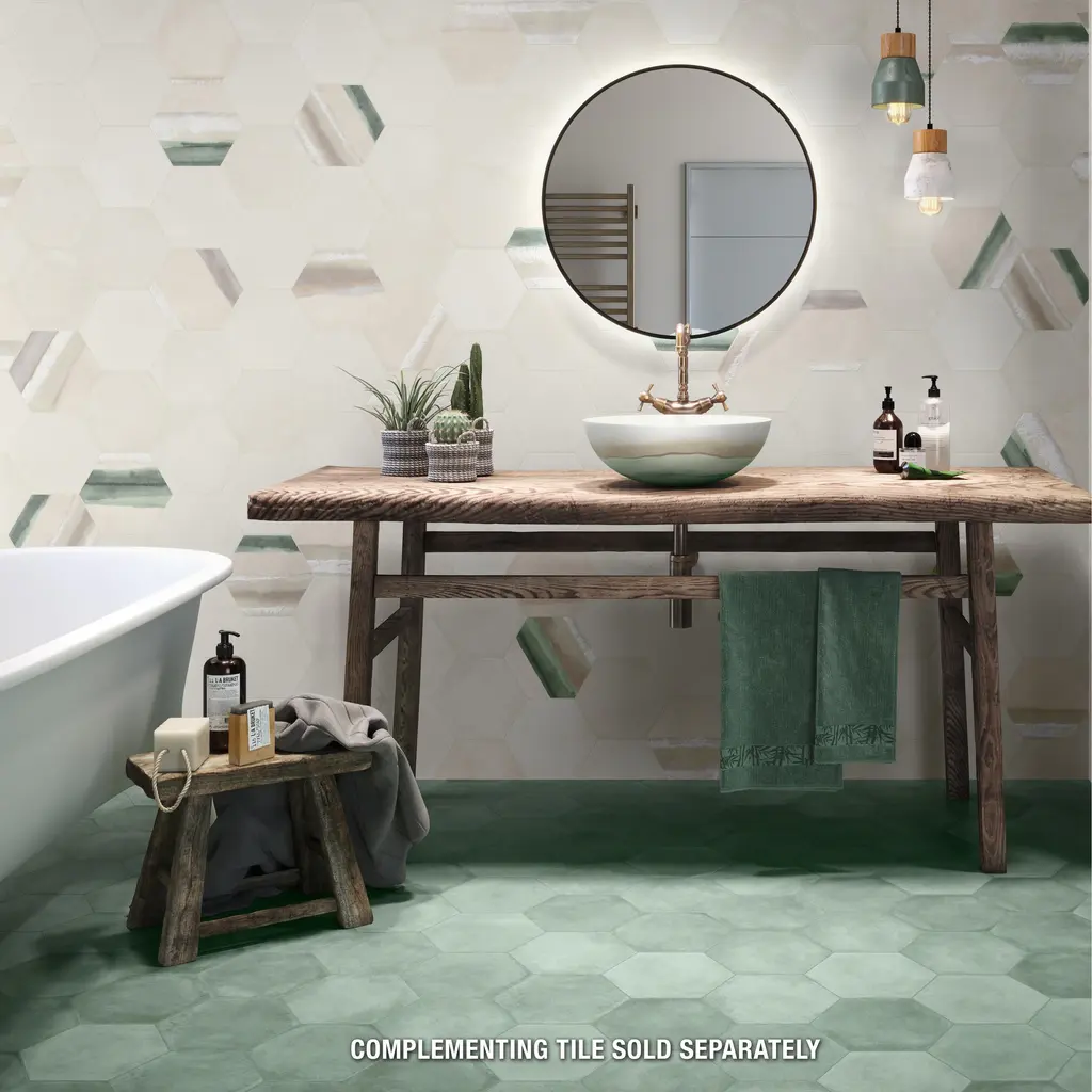 Reinterpreting the beauty of land and sea from an artist's viewpoint, our Matter Canvas Hex Bone Green Porcelain Floor and Wall Tile offers a highly personal and unique view of nature's most beautiful landscapes. This hexagon tile features brushstroke patterns in soft pink, beige, green and white tones that echo the look and feel of sandy beaches, rolling waves and endless horizons. As a result of refined digital inkjet techniques and color blending, this tile offers exquisite depth and dimension that is further enhanced by its textured, mixed finish surface. Available in twenty-six print variations that are randomly distributed throughout each case, this tile offers a truly one-of-a-kind look. Its impervious, frost-resistant, and durable features make it an ideal choice for both indoor and outdoor commercial and residential installations including kitchens, bathrooms, backsplashes, showers, and pools. This tile is an ideal choice on its own or paired with other products in our Matter Collection to create a customized installation. Tile is the better choice for your space. This tile is made from natural ingredients, making it a healthy choice as it is free from allergens, VOCs, formaldehyde, and PVC. 3.8 square feet, 10 pieces per case. Case weight is 14.77 lbs. Grade 1, first-quality porcelain tile for floor and wall use 7.88 in. width x 9 in. length x 0.31 in. thick Glazed, slightly textured finish with a mixed finish and random variation in tone PEI Rating V is suitable for both residential and high-traffic commercial use including extra heavy-duty floors and areas subject to severe pedestrian traffic over sustained periods with some dirt such as shopping centers, airport concourses, public walkways and industrial applications Impervious tiles have a water absorption of less than 0.5% for indoor and outdoor use and are frost resistant This tile is ADA approved for slip resistance with a DCOF value of 0.42 or higher. Completely frost resistant for indoor or outdoor applications; use a latex-modified thinset for acceptable bond strength Please note: A sample of this product may be a partial piece cut from the full size tile in order to provide an affordable and convenient way for customers to judge the quality and finish of this item. Samples are not returnable.