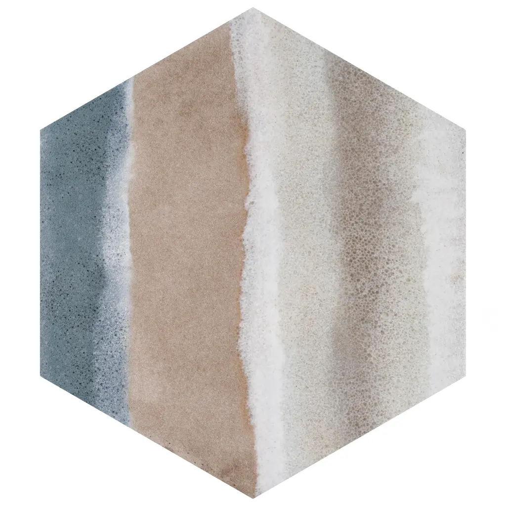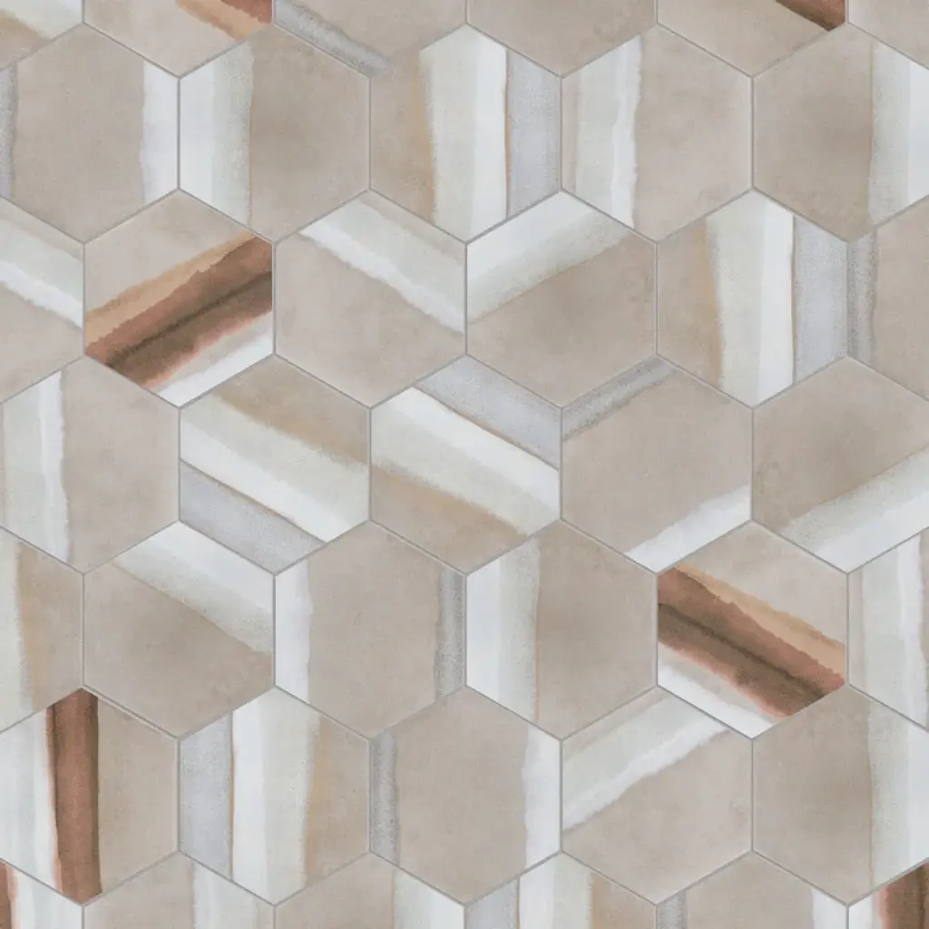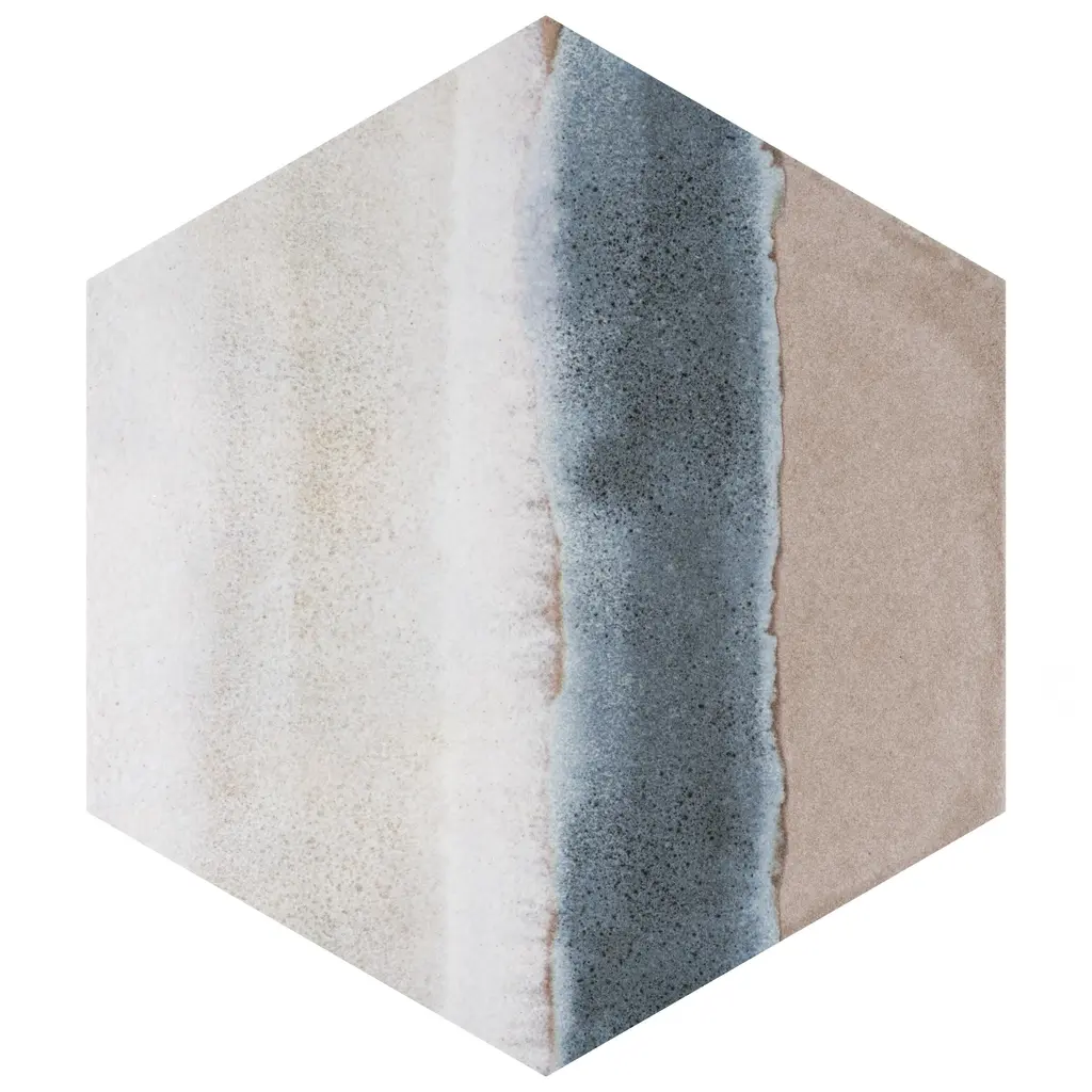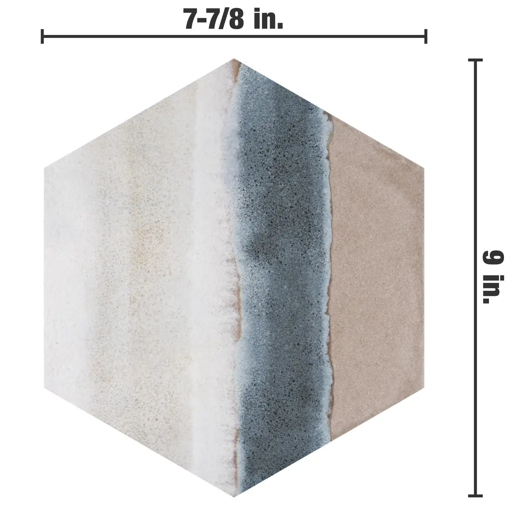 Reinterpreting the beauty of land and sea from an artist's viewpoint, our Matter Canvas Hex Taupe Blue Porcelain Floor and Wall Tile offers a highly personal and unique view of nature's most beautiful landscapes. This hexagon tile features brushstroke patterns in soft pink, beige, blue and white tones that echo the look and feel of sandy beaches, rolling waves and endless horizons. As a result of refined digital inkjet techniques and color blending, this tile offers exquisite depth and dimension that is further enhanced by its textured, mixed finish surface. Available in twenty-six print variations that are randomly distributed throughout each case, this tile offers a truly one-of-a-kind look. Its impervious, frost-resistant, and durable features make it an ideal choice for both indoor and outdoor commercial and residential installations including kitchens, bathrooms, backsplashes, showers, and pools. This tile is an ideal choice on its own or paired with other products in our Matter Collection to create a customized installation. Tile is the better choice for your space. This tile is made from natural ingredients, making it a healthy choice as it is free from allergens, VOCs, formaldehyde, and PVC. 3.8 square feet, 10 pieces per case. Case weight is 14.77 lbs. Grade 1, first-quality porcelain tile for floor and wall use 7.88 in. width x 9 in. length x 0.31 in. thick Glazed, slightly textured finish with a mixed finish and random variation in tone PEI Rating V is suitable for both residential and high-traffic commercial use including extra heavy-duty floors and areas subject to severe pedestrian traffic over sustained periods with some dirt such as shopping centers, airport concourses, public walkways and industrial applications Impervious tiles have a water absorption of less than 0.5% for indoor and outdoor use and are frost resistant This tile is ADA approved for slip resistance with a DCOF value of 0.42 or higher. Completely frost resistant for indoor or outdoor applications; use a latex-modified thinset for acceptable bond strength Please note: A sample of this product may be a partial piece cut from the full size tile in order to provide an affordable and convenient way for customers to judge the quality and finish of this item. Samples are not returnable.