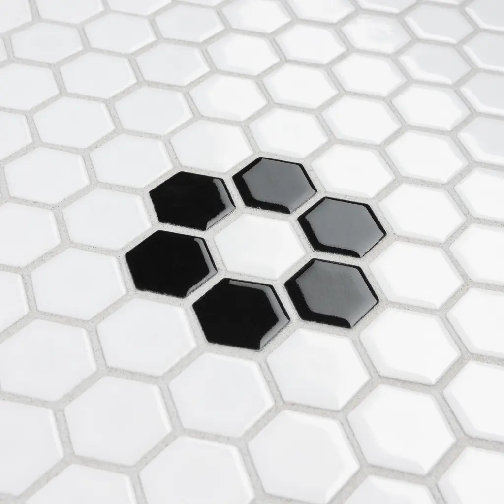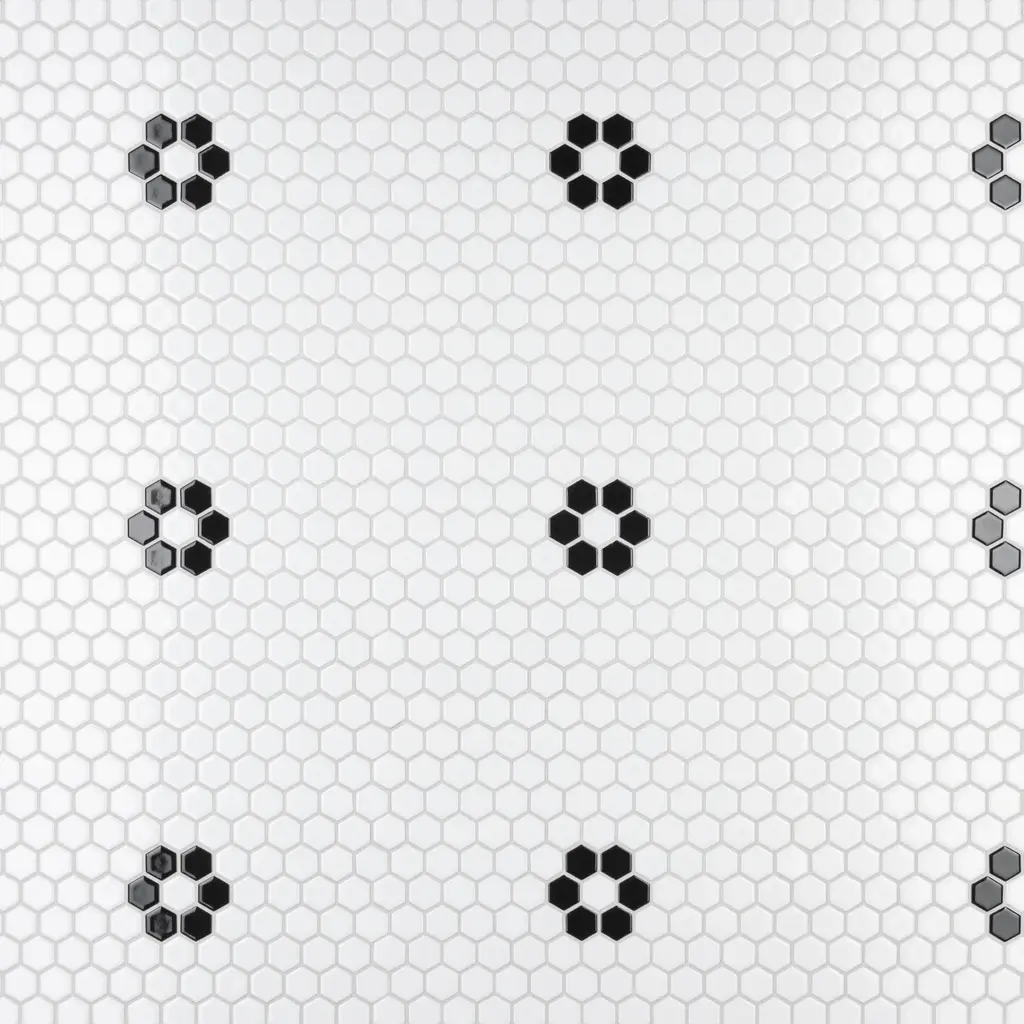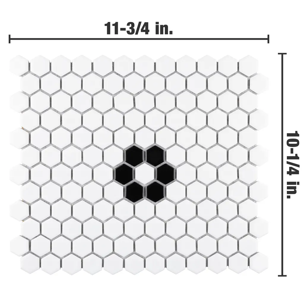 Transform your space into a tribute to retro design with our Metro Hex Glossy White with Single Flower Porcelain Floor and Wall Mosaic Tile. As a modern deviation from the classic mosaic, this fresh option is a throwback to traditional retro design with a contemporary feel. Glossy white hexagons are accented by contrasting glossy black hexagons arranged into the shape of a flower on an interlocking mesh to create a seamless installation. This minimalistic geometric porcelain mosaic is unique yet simplistic enough to integrate into any design, ranging from traditional style renovations to modern home projects. Its impervious and frost-resistant features make this an ideal tile for both indoor and outdoor residential use, including backsplashes, bathrooms, showers, kitchens and fireplace facades. This tile is a perfect choice on its own or paired with other products in the Metro Collection. Tile is the better choice for your space. This tile is made from natural ingredients, making it a healthy choice as it is free from allergens, VOCs, formaldehyde and PVC. 8.6 square feet, 10 pieces per case. Case weight is 17.6 lbs. Grade 1, first-quality porcelain tile for floor and wall use 10.25 in. width x 11.88 in. length x 0.24 in. thick mesh-mounted mosaic Glazed, smooth finish with a high sheen and uniform appearance in tone PEI Rating II is suitable for all interior walls and light foot traffic such as powder rooms Impervious tiles have a water absorption of less than 0.5% for indoor and outdoor use and are frost resistant This tile has no available COF wet rating. This tile is not ADA approved for slip resistance. Completely frost resistant for indoor or outdoor applications; use a latex-modified thinset for acceptable bond strength Please note: A sample of this product may be a partial piece cut from the full size tile in order to provide an affordable and convenient way for customers to judge the quality and finish of this item. Samples are not returnable.