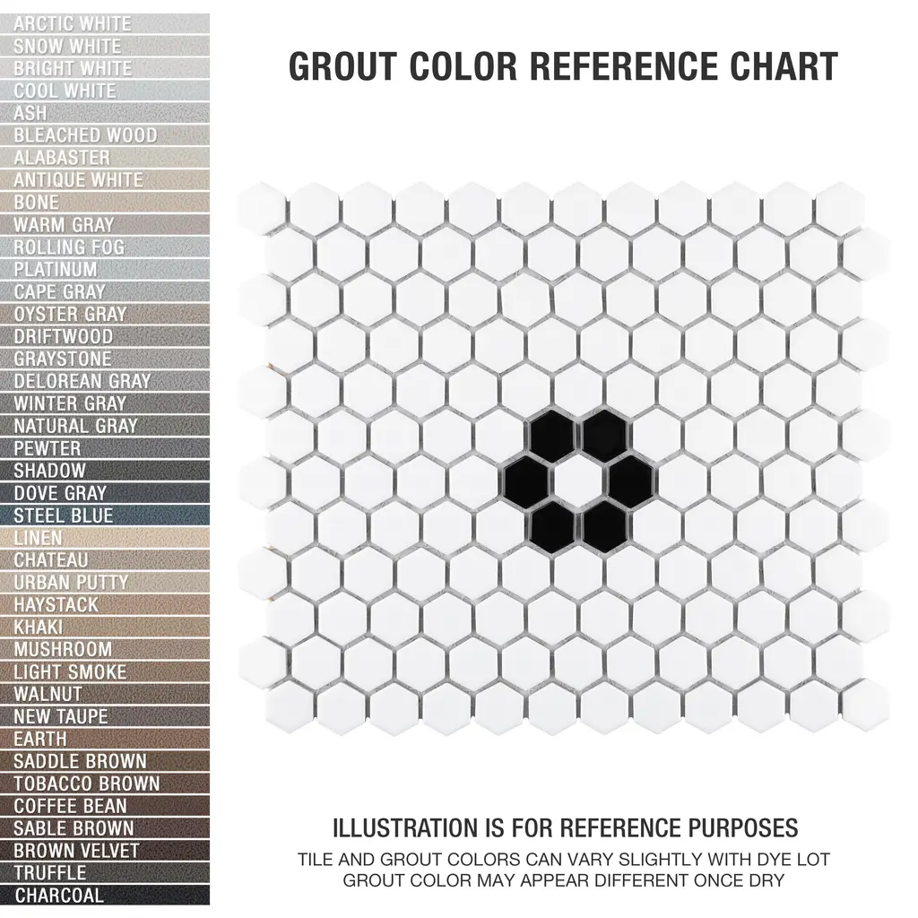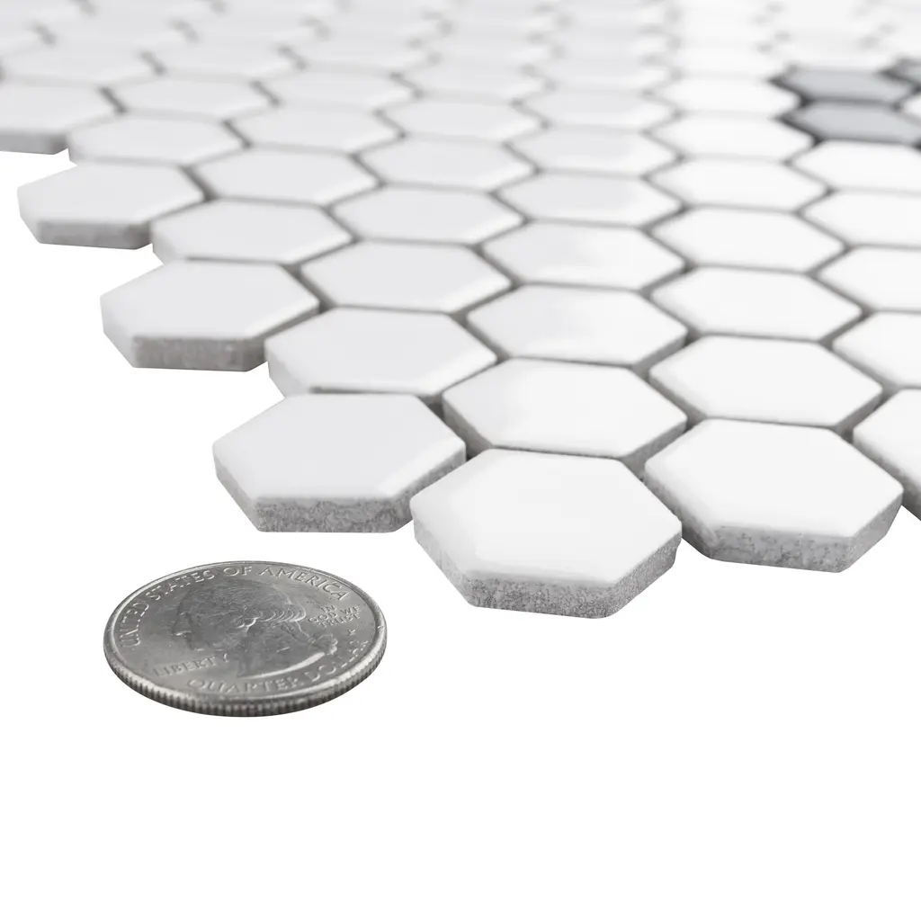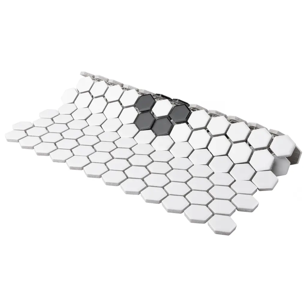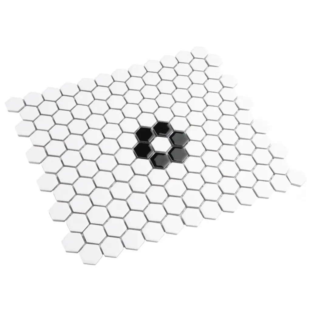 Transform your space into a tribute to retro design with our Metro Hex Glossy White with Single Flower Porcelain Floor and Wall Mosaic Tile. As a modern deviation from the classic mosaic, this fresh option is a throwback to traditional retro design with a contemporary feel. Glossy white hexagons are accented by contrasting glossy black hexagons arranged into the shape of a flower on an interlocking mesh to create a seamless installation. This minimalistic geometric porcelain mosaic is unique yet simplistic enough to integrate into any design, ranging from traditional style renovations to modern home projects. Its impervious and frost-resistant features make this an ideal tile for both indoor and outdoor residential use, including backsplashes, bathrooms, showers, kitchens and fireplace facades. This tile is a perfect choice on its own or paired with other products in the Metro Collection. Tile is the better choice for your space. This tile is made from natural ingredients, making it a healthy choice as it is free from allergens, VOCs, formaldehyde and PVC. 8.6 square feet, 10 pieces per case. Case weight is 17.6 lbs. Grade 1, first-quality porcelain tile for floor and wall use 10.25 in. width x 11.88 in. length x 0.24 in. thick mesh-mounted mosaic Glazed, smooth finish with a high sheen and uniform appearance in tone PEI Rating II is suitable for all interior walls and light foot traffic such as powder rooms Impervious tiles have a water absorption of less than 0.5% for indoor and outdoor use and are frost resistant This tile has no available COF wet rating. This tile is not ADA approved for slip resistance. Completely frost resistant for indoor or outdoor applications; use a latex-modified thinset for acceptable bond strength Please note: A sample of this product may be a partial piece cut from the full size tile in order to provide an affordable and convenient way for customers to judge the quality and finish of this item. Samples are not returnable.