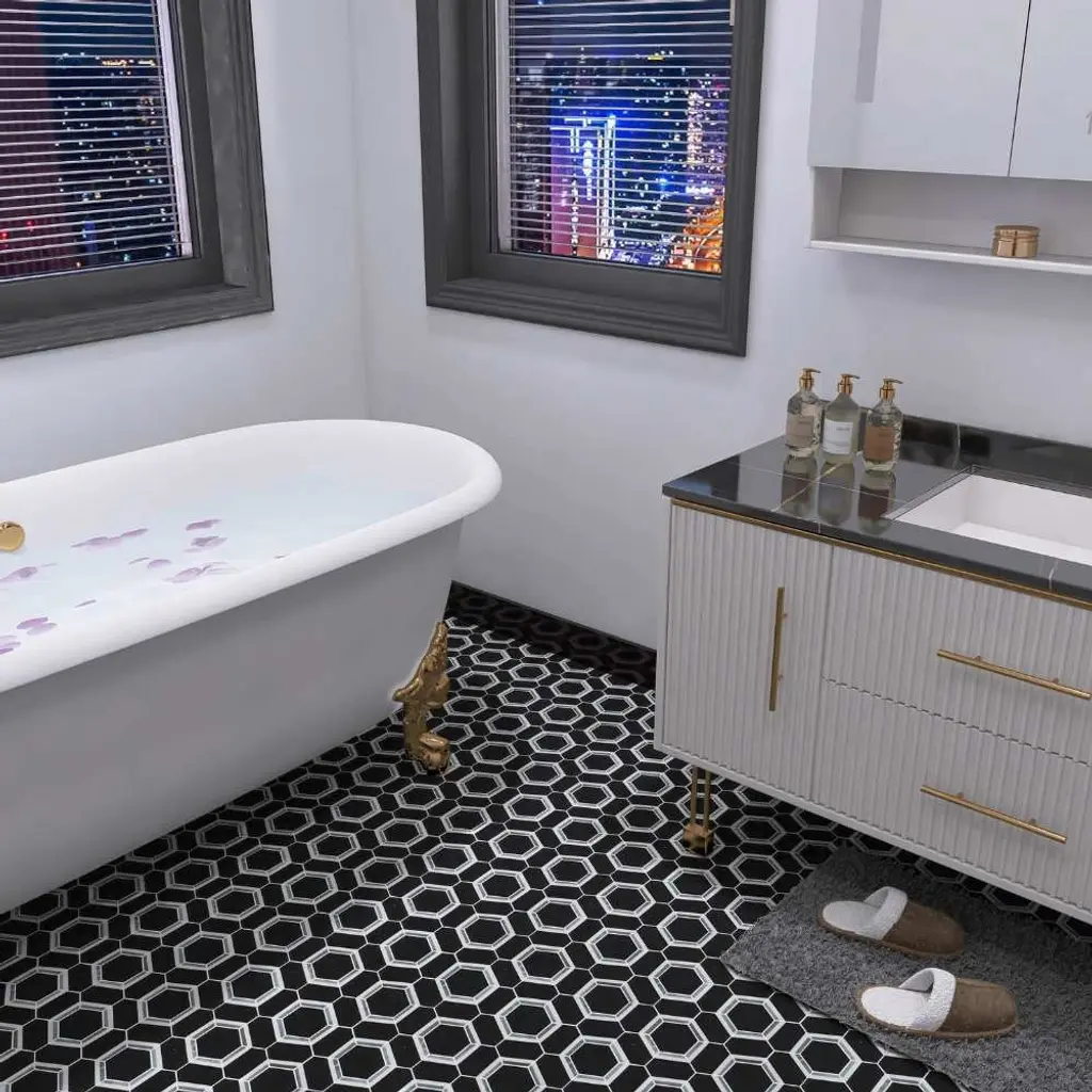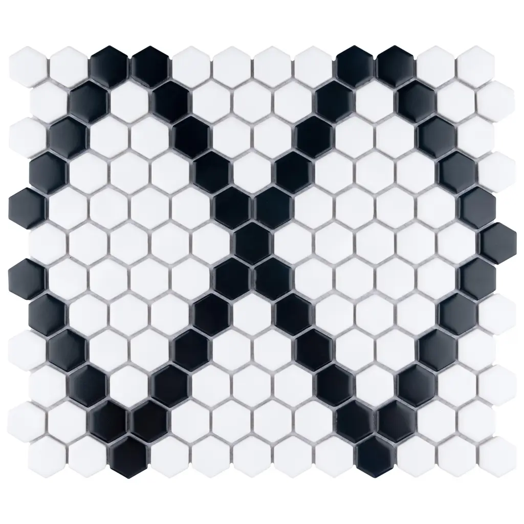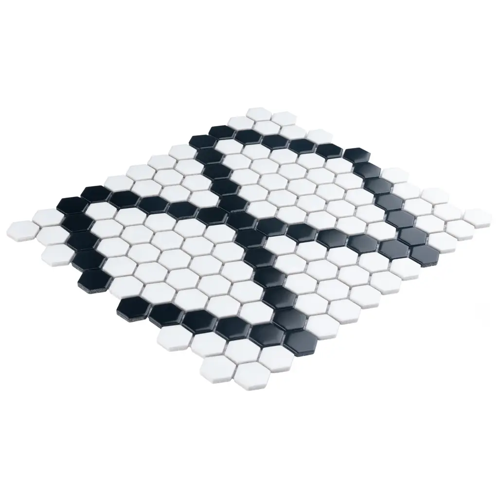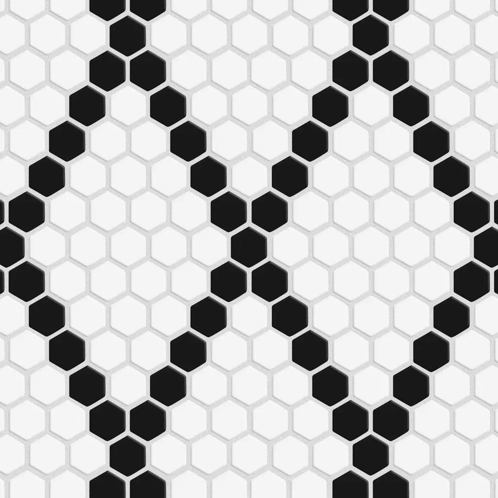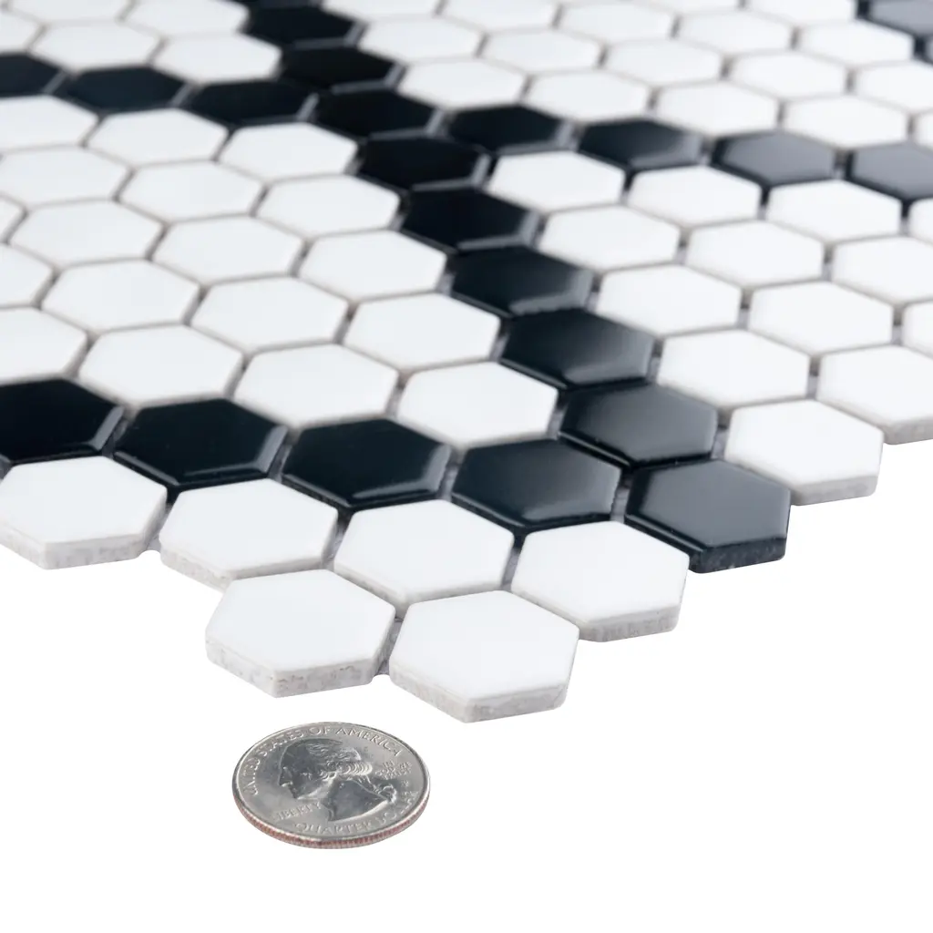 Offering a mosaic look, our Metro 1 in. Hex Matte White with Black Diamond Porcelain Floor and Wall Tile features a smooth, matte finish, providing decorative appeal that adapts to a variety of stylistic contexts. With its impervious, frost-resistant features, this mosaic is an ideal selection for both indoor and outdoor residential installations, including bathrooms, backsplashes, showers, hallways and fireplace facades. This tile is a perfect choice on its own or paired with other products in the Metro Collection. Tile is the better choice for your space! 8.6 square feet, 10 pieces per case. Case weight is 17.6 lbs. Grade 1, first-quality porcelain tile for floor and wall use 10.25 in. width x 11.88 in. length x 0.24 in. thick mesh-mounted mosaic Glazed, smooth finish with a low sheen and uniform appearance in tone PEI Rating II is suitable for all interior walls and light foot traffic such as powder rooms Impervious tiles have a water absorption of less than 0.5% for indoor and outdoor use and are frost resistant This tile is not ADA approved for slip resistance with a DCOF value less than 0.42. Completely frost resistant for indoor or outdoor applications; use a latex-modified thinset for acceptable bond strength Please note: Samples are not returnable