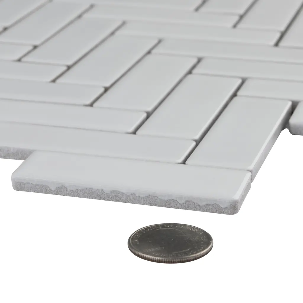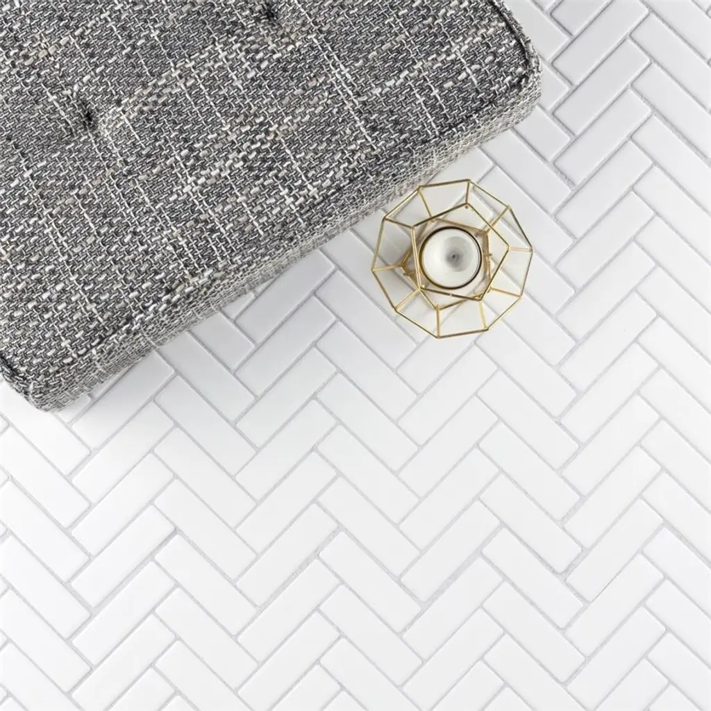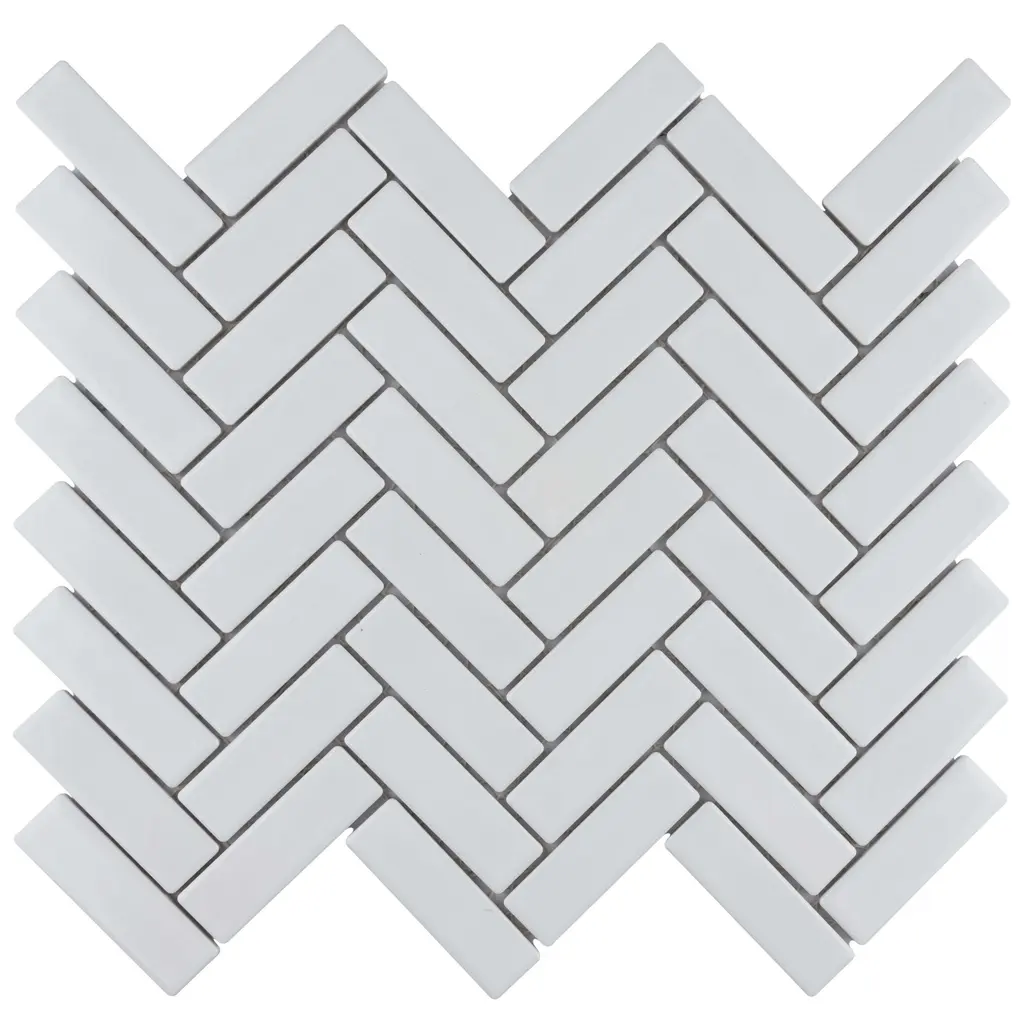 Our Metro Brick Herringbone Glossy Cool White Porcelain Floor and Wall Mosaic Tile instantly elevates spaces through a refreshing dose of timeless design. As an innovative twist on the classic mosaic, this floor and wall product is comprised of subway shaped chips in white with a smooth surface. Glossy rectangles are arranged in a herringbone pattern on an interlocking mesh to create a unique and seamless installation. This minimalistic geometric porcelain mosaic is unique yet simplistic enough to integrate into any design, ranging from traditional style renovations to modern home projects. Its impervious, frost-resistant and durable features make this an ideal tile for both indoor and outdoor commercial and residential use, including backsplashes, bathrooms, showers, kitchens, fireplace facades, entryways and patios. This tile is a perfect choice on its own or paired with other products in the Metro Brick Collection. Tile is the better choice for your space. This tile is made from natural ingredients, making it a healthy choice as it is free from allergens, VOCs, formaldehyde and PVC.