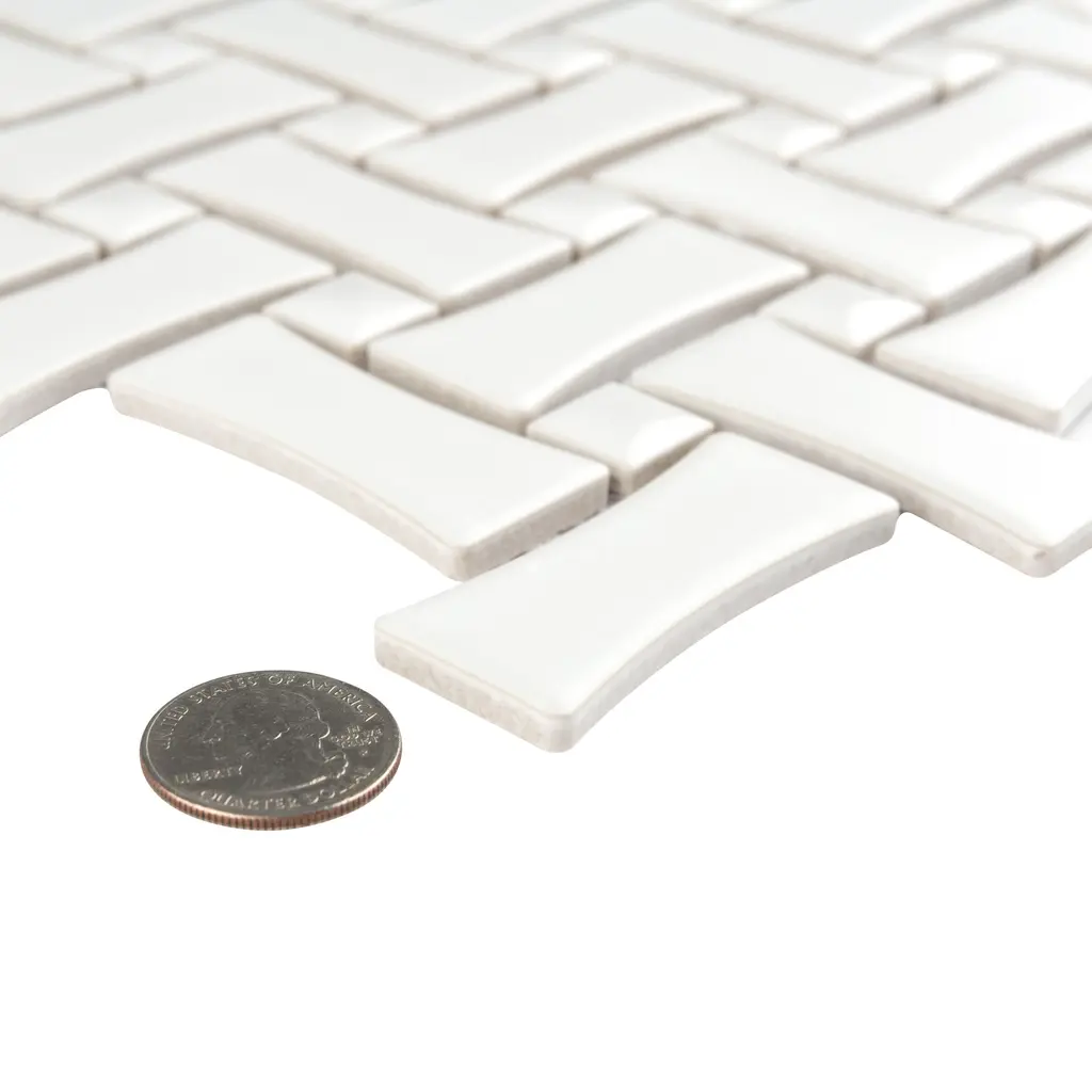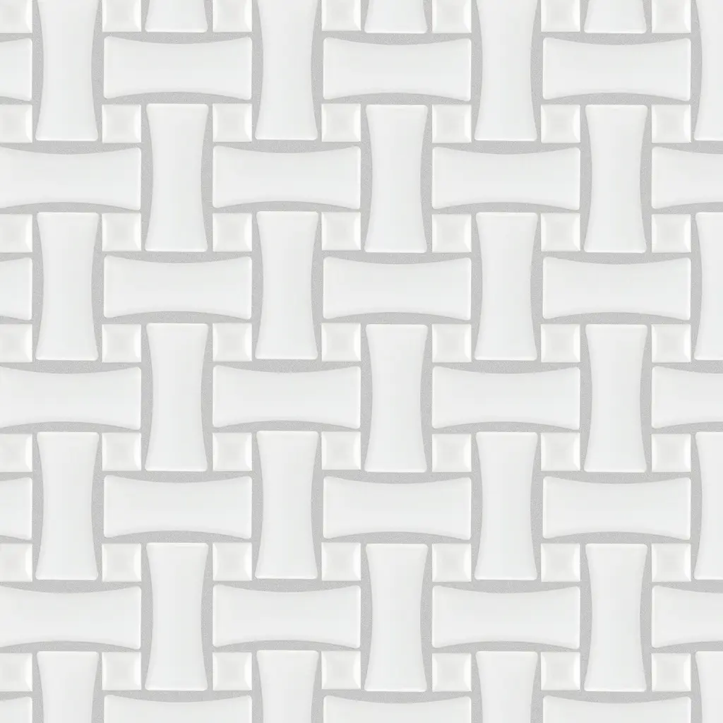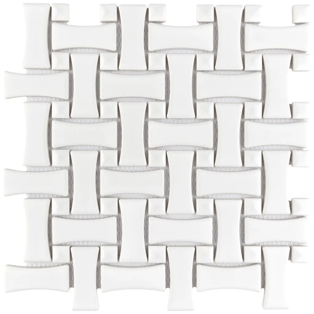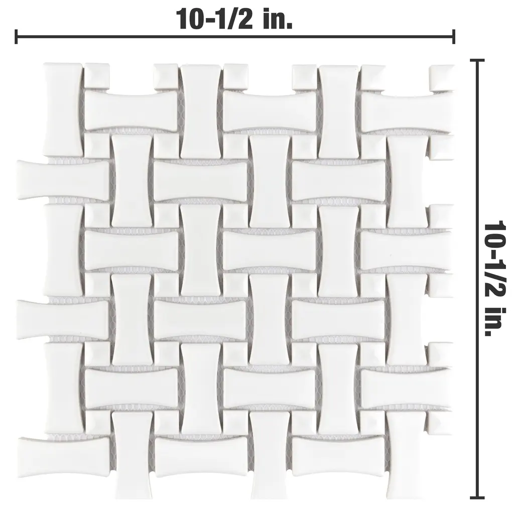 Transform your space into a tribute to retro design with our Metro Dog Bone Basket Weave Matte White with Glossy White Dot Porcelain Mosaic Floor and Wall Tile. As a modern deviation from the classic mosaic, this tile option is a throwback to traditional retro design with a contemporary feel. Matte white chips are accentuated by small glossy white dots that provide a woven illusion. These mosaic chips are precisely arranged on an interlocking mesh to create a seamless installation. This minimalistic geometric porcelain mosaic is unique yet simplistic enough to integrate into any design, ranging from traditional style renovations to modern home projects. Its impervious and glazed features make this an ideal tile for indoor and outdoor residential use, including backsplashes, bathrooms, showers, and kitchens. Tile is the better choice for your space. This tile is made from natural ingredients, making it a healthy choice as it is free from allergens, VOCs, formaldehyde, and PVC.7.1 square feet, 10 pieces per case. Case weight is 16 lbs.Grade 1, first-quality porcelain tile for floor and wall use10 in. width x 10 in. length x 0.19 in. thick mesh-mounted mosaicGlazed, slightly textured finish with a mixed finish and uniform appearance in tonePEI Rating II is suitable for all interior walls and light foot traffic such as powder roomsImpervious tiles have a water absorption of less than 0.5% for indoor and outdoor use and is frost resistantCOF rating less than or equal to 0.5 is considered to have a marginally low skid resistanceCompletely frost resistant for indoor or outdoor applications; use a latex-modified thinset for acceptable bond strengthResidential use onlyPlease note: A sample of this product may be a partial piece cut from the full size tile in order to provide an affordable and convenient way for customers to judge the quality and finish of this item. Samples are not returnable.