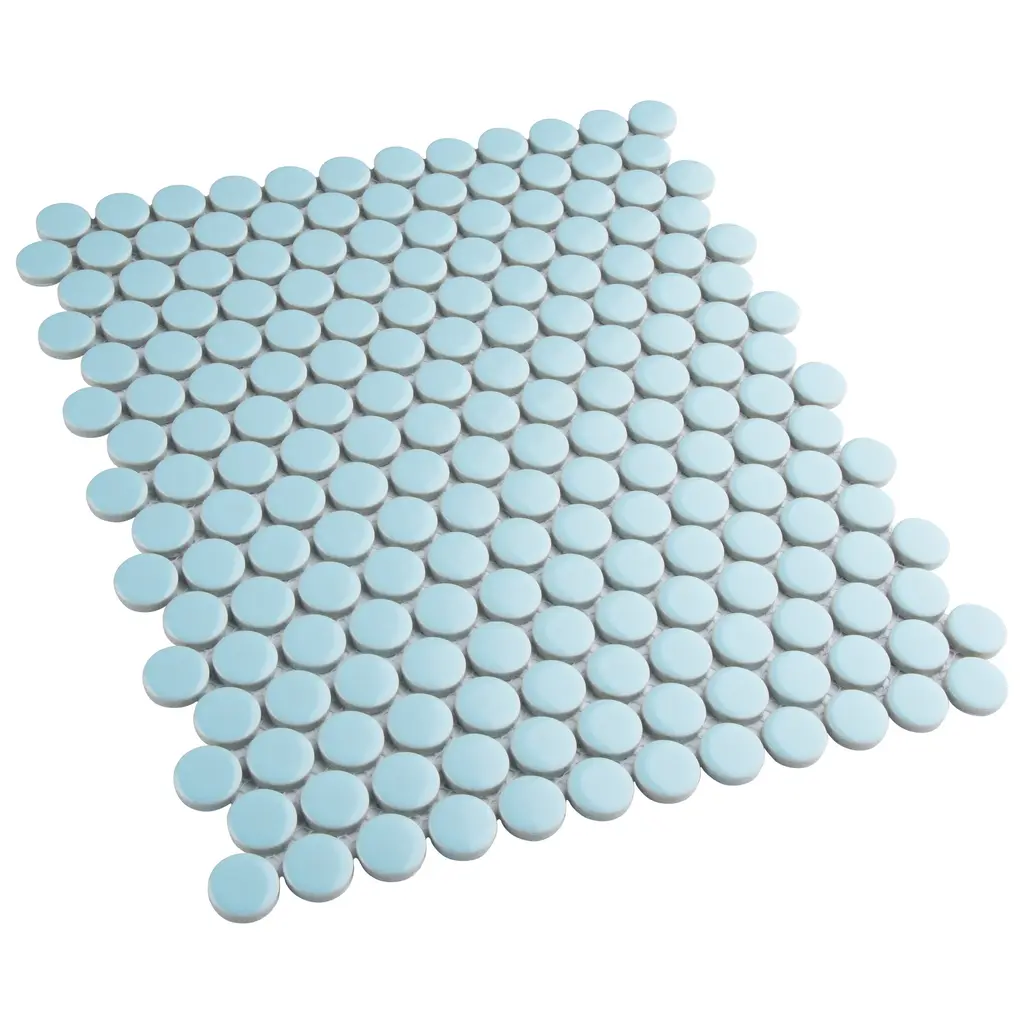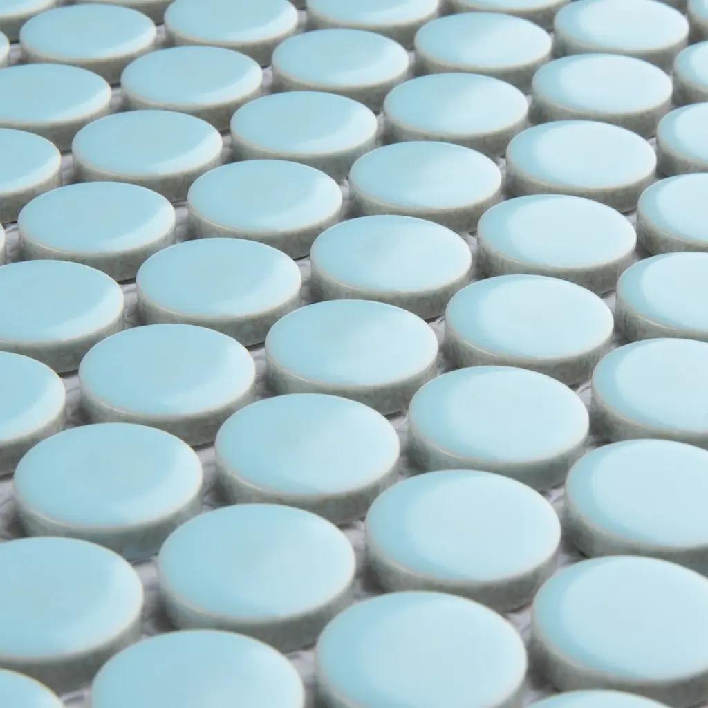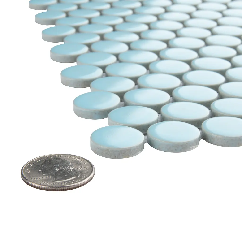 Transform your space into a tribute to retro design with our Metro Penny Matte Light Blue 9-3/4 in. x 11-1/2 in. Porcelain Floor and Wall Mosaic Tile. As a modern deviation from the classic mosaic, this fresh option is a throwback to traditional retro design with a contemporary feel. Matte light blue penny rounds are arranged on an interlocking mesh to create a seamless installation. This minimalistic geometric porcelain mosaic is unique yet simplistic enough to integrate into any design, ranging from traditional style renovations to modern home projects. Its ADA compliant, impervious and frost resistant features make this an ideal tile for residential indoor and outdoor use, including backsplashes, bathrooms, kitchens and floors that get light-duty foot traffic floors. Tile is the better choice for your space. This tile is made from natural ingredients, making it a healthy choice as it is free from allergens, VOCs, formaldehyde and PVC. 7.97 square feet, 10 pieces per case. Case weight is 14.88 lbs. Grade 1, first-quality porcelain tile for floor and wall use. 9.75 in. width x 11.5 in. length x 0.22 in. mm thick mesh-mounted mosaic. 0.75 in. W x 0.75 in. L pieces Sample Dimension: A sample of this product may be a partial piece cut from the full size tile in order to provide an affordable and convenient way for customers to judge the quality and finish of this item. Glazed smooth finish with a low sheen and uniform appearance in tone P.E.I. Rating II has high resistance to abrasion and is suitable for heavy-duty residential and commercial kitchens, hotels, exhibition and sales rooms with some dirt conditions all interior walls and light foot traffic such as powder rooms Impervious tiles have a water absorption of less than 0.5% for indoor and outdoor use and is frost resistant Completely frost resistant for indoor or outdoor applications; use a latex-modified thinset for acceptable bond strength Residential use onlyPlease note: A sample of this product may be a partial piece cut from the full size tile in order to provide an affordable and convenient way for customers to judge the quality and finish of this item. Samples are not returnable.Please note: A sample of this product may be a partial piece cut from the full size tile in order to provide an affordable and convenient way for customers to judge the quality and finish of this item. Samples are not returnable.