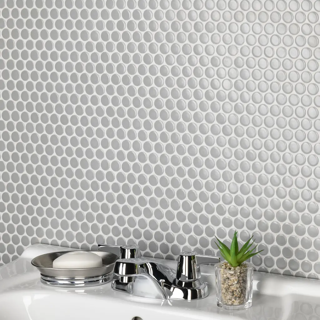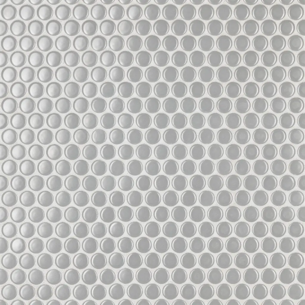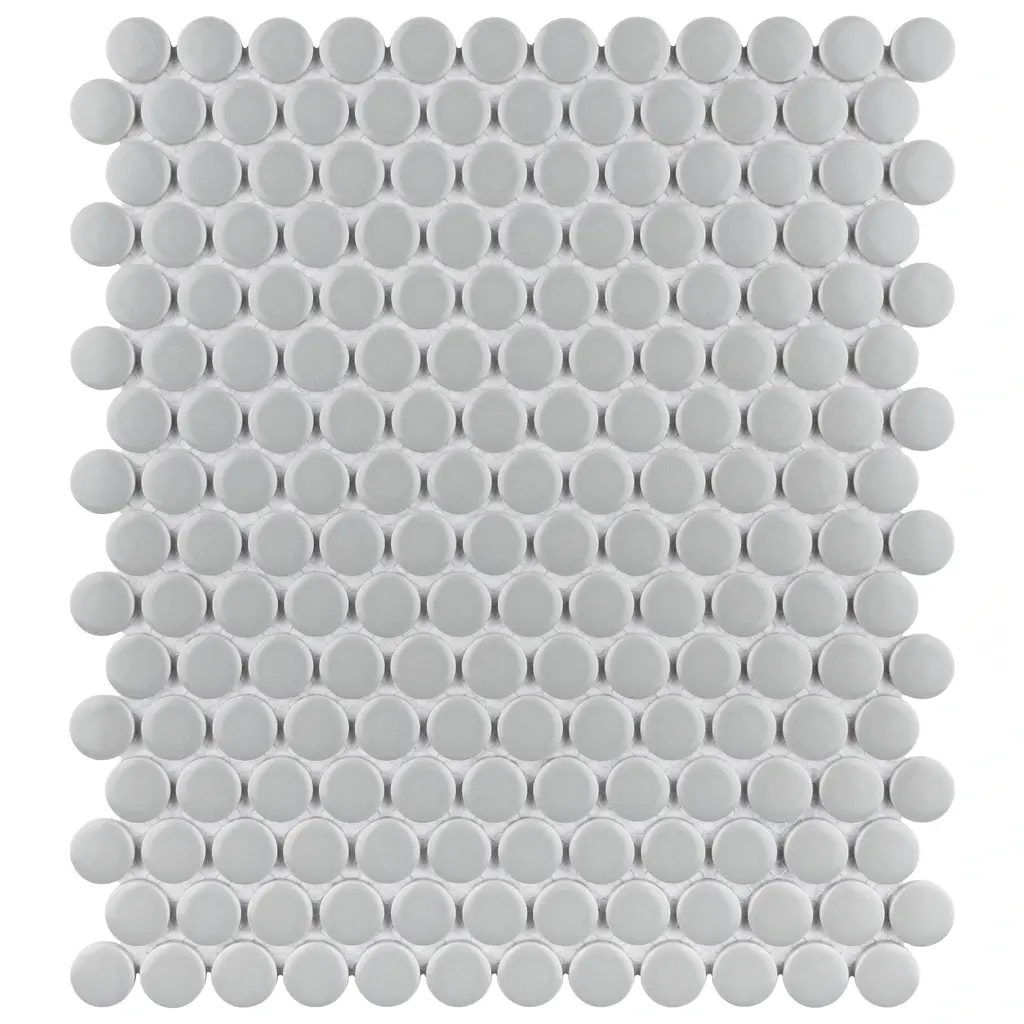 Transform your space into a tribute to retro design with our Metro Penny Matte Light Grey Porcelain Floor and Wall Mosaic Tile. As a modern deviation from the classic mosaic, this fresh option is a throwback to traditional retro design with a contemporary feel. Matte light grey penny rounds are arranged on an interlocking mesh to create a seamless installation. This minimalistic geometric porcelain mosaic is unique yet simplistic enough to integrate into any design, ranging from traditional style renovations to modern home projects. Its impervious and frost resistant features make this an ideal tile for residential indoor and outdoor use, including backsplashes, bathrooms, kitchens and floors that get light-duty foot traffic. Tile is the better choice for your space. This tile is made from natural ingredients, making it a healthy choice as it is free from allergens, VOCs, formaldehyde and PVC. 8.0 square feet, 10 pieces per case. Case weight is 14.9 lbs. Grade 1, first-quality porcelain tile for floor and wall use 9.75 in. width x 11.5 in. length x 0.24 in. thick mesh-mounted mosaic Glazed, smooth finish with a low sheen and uniform appearance in tone PEI Rating II is suitable for all interior walls and light foot traffic such as powder rooms Impervious tiles have a water absorption of less than 0.5% for indoor and outdoor use and are frost resistant This tile has no available COF wet rating. This tile is not ADA approved for slip resistance. Completely frost resistant for indoor or outdoor applications; use a latex-modified thinset for acceptable bond strength Please note: A sample of this product may be a partial piece cut from the full size tile in order to provide an affordable and convenient way for customers to judge the quality and finish of this item. Samples are not returnable.
