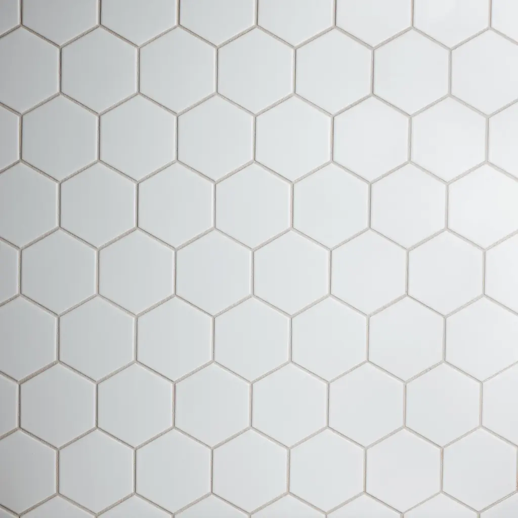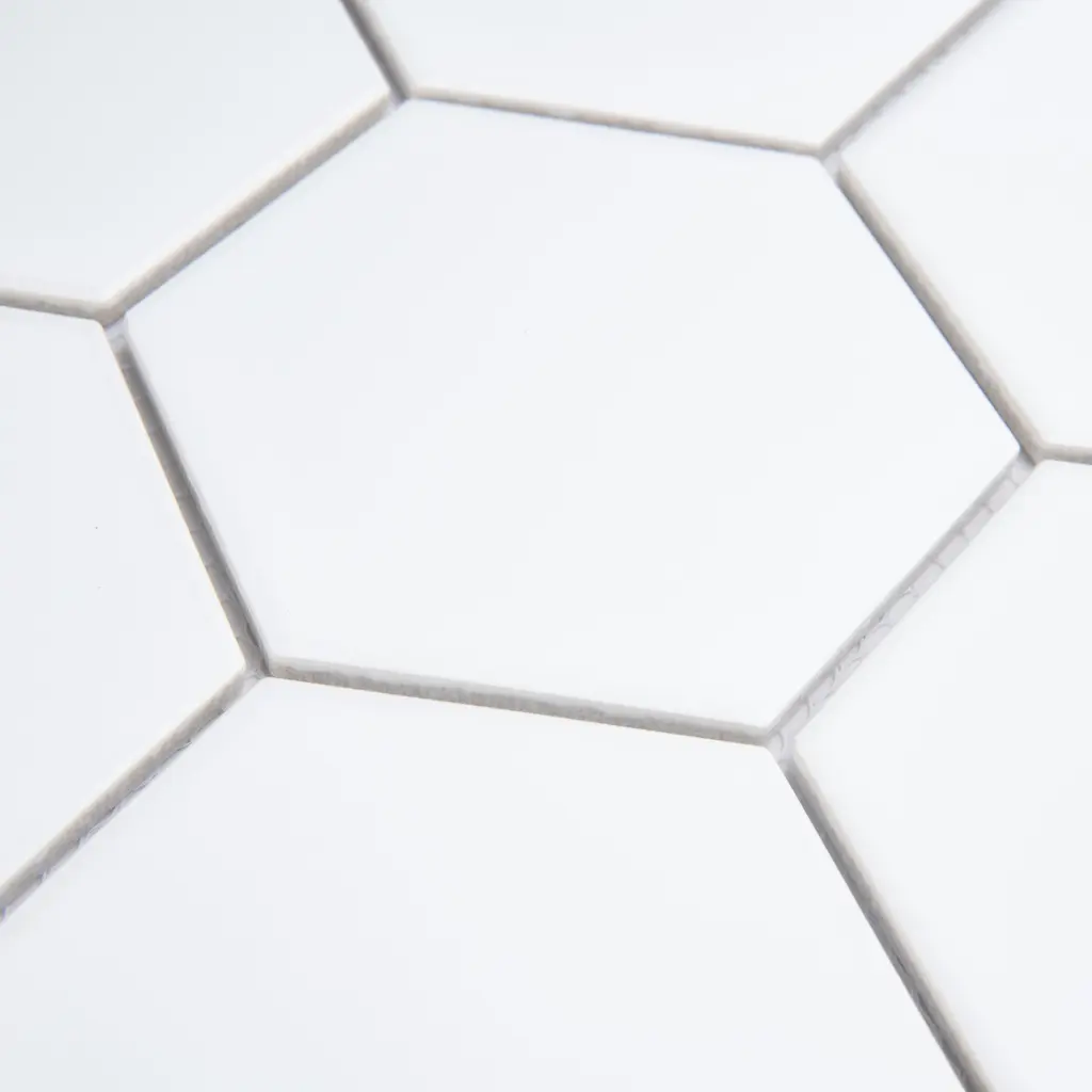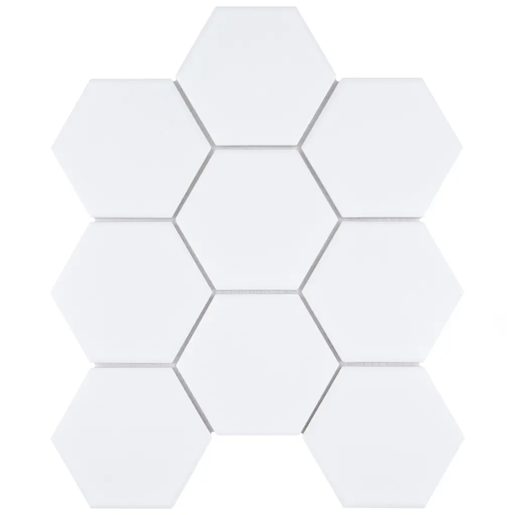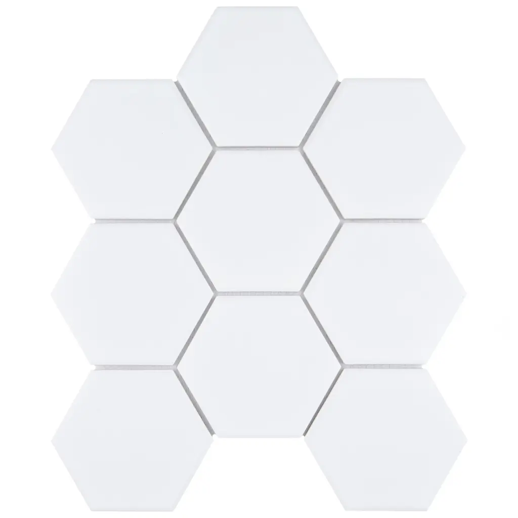 Transform your space into a tribute to retro design with our Metro Super Hex Matte White Porcelain Mosaic Tile. As a modern, enlarged deviation from the classic hexagon mosaic, this fresh option is a throwback to traditional retro design with a contemporary feel. Matte white hexagons are precisely arranged on an interlocking mesh to create a seamless installation. This minimalistic porcelain mosaic is frost-resistant and ADA-compliant, making this an excellent choice for a modern installation or historic renovation. Tile is the better choice for your space. This tile is made from natural ingredients, making it a healthy choice as it is free from allergens, VOCs, formaldehyde and PVC. 8.2 square feet, 10 pieces per case. Case weight is 20.9 lbs. Grade 1, first-quality porcelain tile for floor and wall use 10 in. width x 11.5 in. length x 0.25 in. thick mesh-mounted mosaic Glazed, smooth finish with a medium sheen and uniform appearance in tone PEI Rating II is suitable for all interior walls and light foot traffic such as powder rooms Impervious tiles have a water absorption of less than 0.5% for indoor and outdoor use and are frost resistant This tile has a COF wet rating less than or equal to 0.50 and is considered to have a marginally low skid resistance. This tile is ADA approved for slip resistance. Completely frost resistant for indoor or outdoor applications; use a latex-modified thinset for acceptable bond strength Please note: A sample of this product may be a partial piece cut from the full size tile in order to provide an affordable and convenient way for customers to judge the quality and finish of this item. Samples are not returnable.