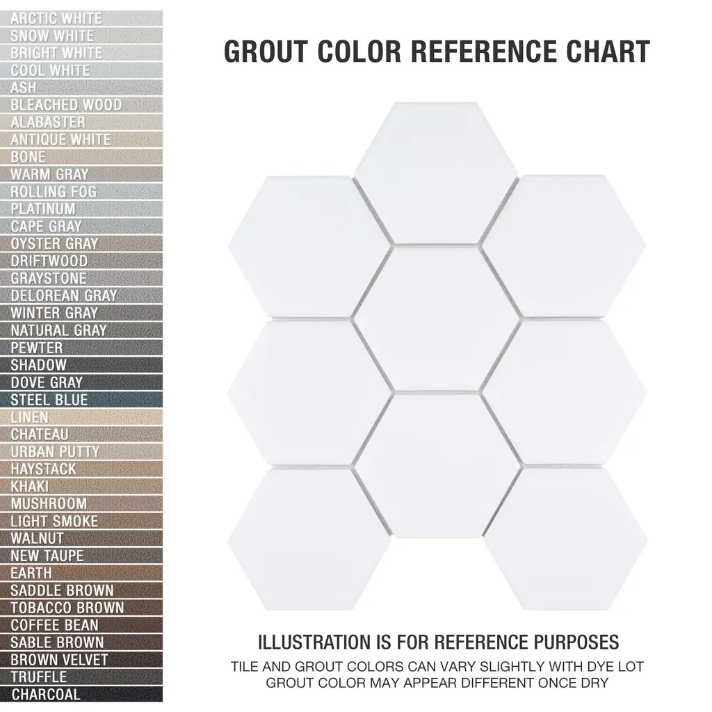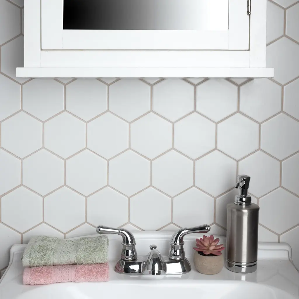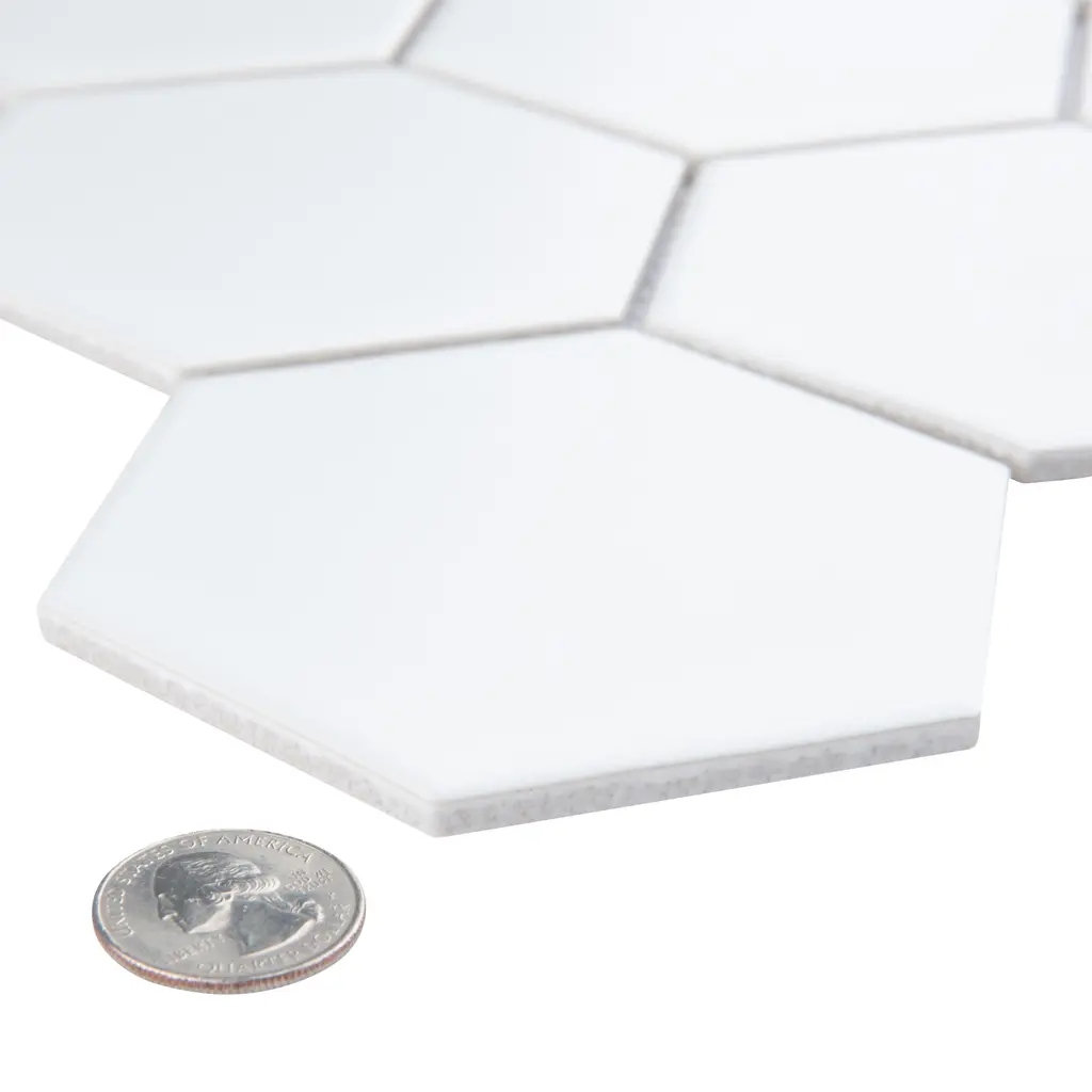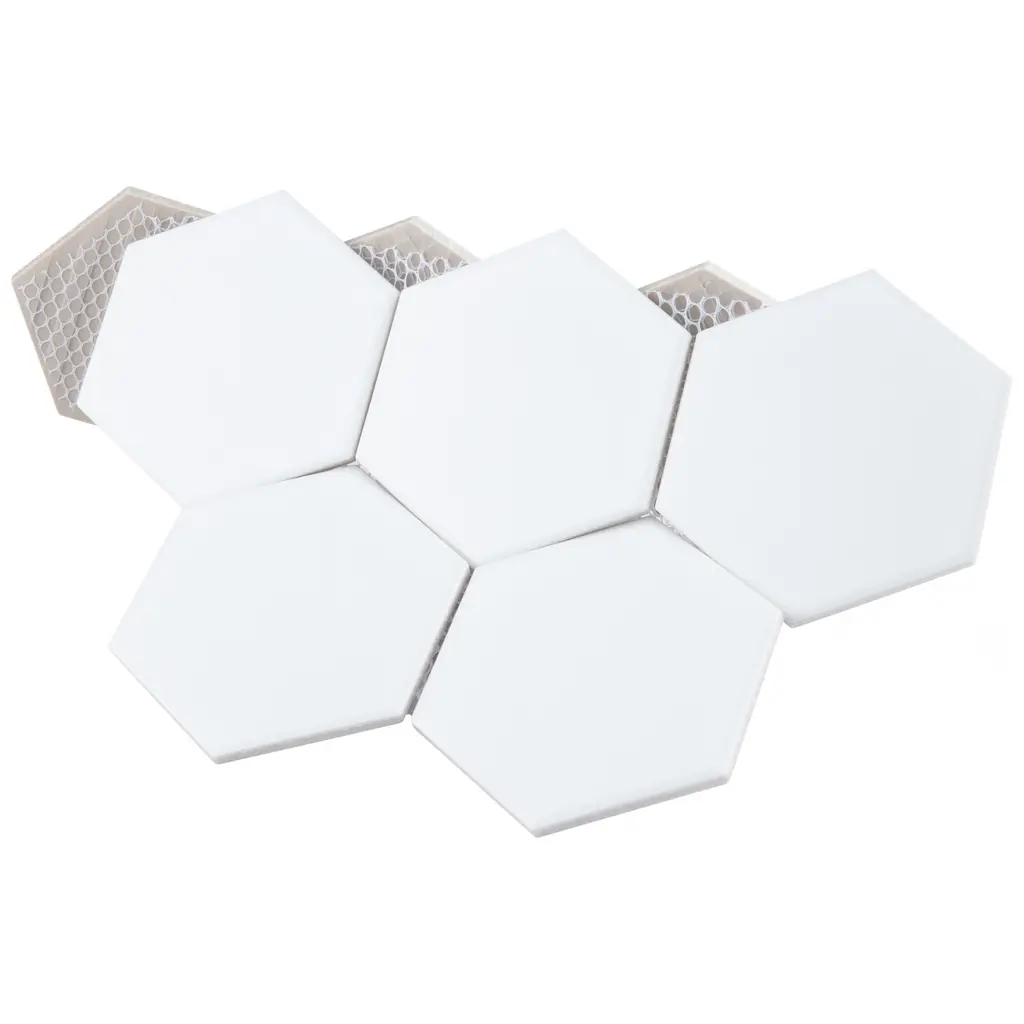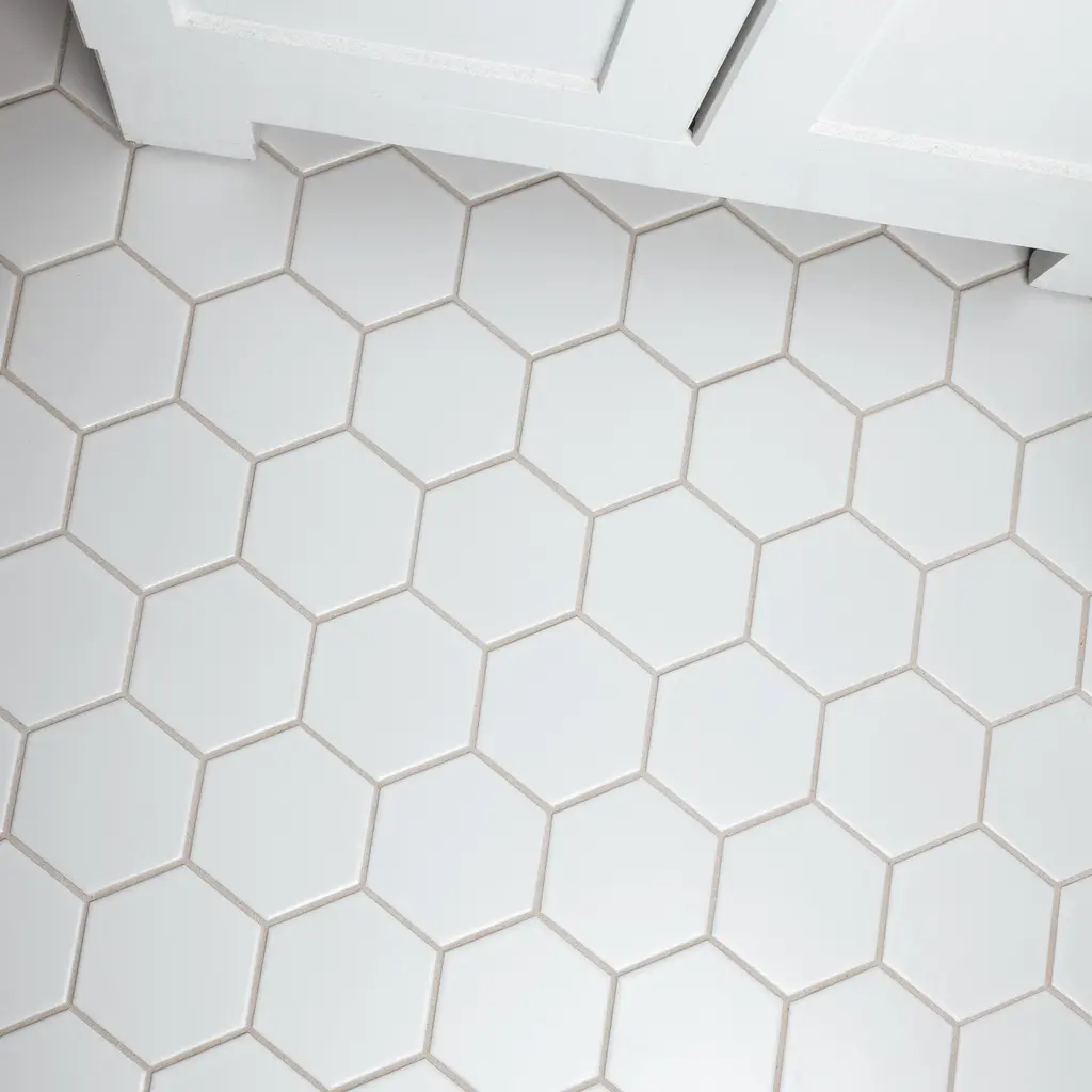 Transform your space into a tribute to retro design with our Metro Super Hex Matte White Porcelain Mosaic Tile. As a modern, enlarged deviation from the classic hexagon mosaic, this fresh option is a throwback to traditional retro design with a contemporary feel. Matte white hexagons are precisely arranged on an interlocking mesh to create a seamless installation. This minimalistic porcelain mosaic is frost-resistant and ADA-compliant, making this an excellent choice for a modern installation or historic renovation. Tile is the better choice for your space. This tile is made from natural ingredients, making it a healthy choice as it is free from allergens, VOCs, formaldehyde and PVC. 8.2 square feet, 10 pieces per case. Case weight is 20.9 lbs. Grade 1, first-quality porcelain tile for floor and wall use 10 in. width x 11.5 in. length x 0.25 in. thick mesh-mounted mosaic Glazed, smooth finish with a medium sheen and uniform appearance in tone PEI Rating II is suitable for all interior walls and light foot traffic such as powder rooms Impervious tiles have a water absorption of less than 0.5% for indoor and outdoor use and are frost resistant This tile has a COF wet rating less than or equal to 0.50 and is considered to have a marginally low skid resistance. This tile is ADA approved for slip resistance. Completely frost resistant for indoor or outdoor applications; use a latex-modified thinset for acceptable bond strength Please note: A sample of this product may be a partial piece cut from the full size tile in order to provide an affordable and convenient way for customers to judge the quality and finish of this item. Samples are not returnable.