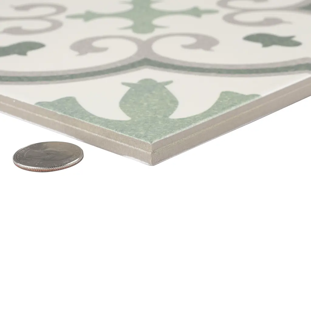 Capturing the appearance of an encaustic look, our Monteca Green Porcelain Floor and Wall Tile features a smooth, satin finish, providing decorative appeal that adapts to a variety of stylistic contexts. With its impervious, frost-resistant features, this white square tile is an ideal selection for a variety of spaces including indoor and outdoor commercial and residential installations, kitchens, bathrooms, backsplashes, showers, hallways, entryways, patios, pools and fireplace facades. This tile is a perfect choice on its own or with other products in the Merola Tile, Monteca Collection. To ensure optimal results, please consult with your installer and review the product specifications to confirm that this tile meets the specific needs of your project.