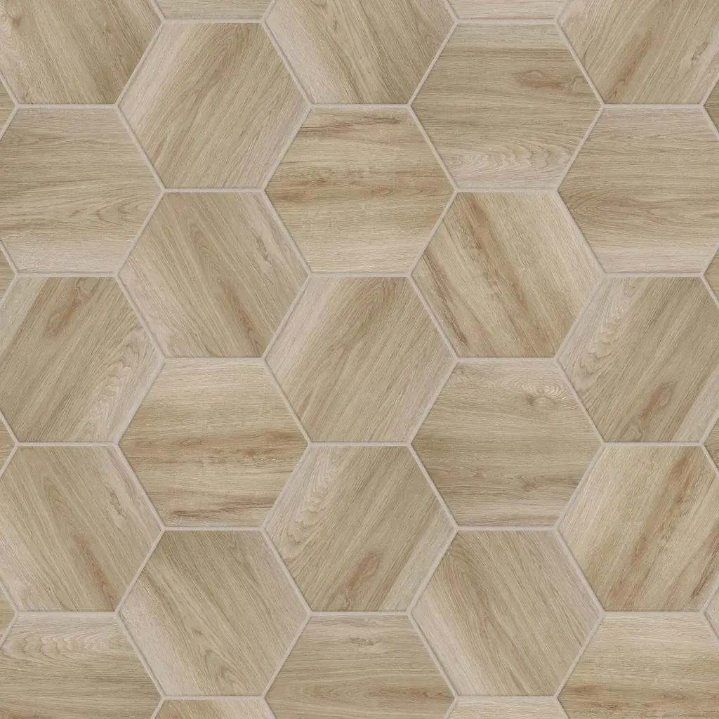 Featuring a simple yet captivating design, our Natura Hex Camel Porcelain Floor and Wall Tile introduces eye-catching natural beauty that provides character and personality wherever it is installed. This hexagon tile features soft shades of beige that blend with meticulous wood grains, offering the resemblance of sophisticated natural wood. To add further contrast and depth, this tile has subtle bumps and grooves that further echo the texture and look of real wood. Its impervious and frost resistant features make this an ideal choice for indoor and outdoor installations including kitchens, bathrooms, backsplashes, showers, entryways, and patios. Tile is the better choice for your space. This tile is made from natural ingredients, making it a healthy choice as it is free from allergens, VOCs, formaldehyde, and PVC. 11.07 square feet, 9 pieces per case. Case weight is 48.28 lbs. Grade 1, first-quality porcelain tile for floor and wall use 14.13 in. width x 16.25 in. length x 0.39 in. thick Glazed, slightly textured finish with a medium sheen and slight variation in tone PEI Rating III is suitable for medium-duty residential floors including kitchens, halls, corridors, balconies, terraces and areas used more often with normal footwear and small amounts of dirt Impervious tiles have a water absorption of less than 0.5% for indoor and outdoor use and are frost resistant This tile is ADA approved for slip resistance with a DCOF value of 0.42 or higher. Completely frost resistant for indoor or outdoor applications; use a latex-modified thinset for acceptable bond strength Please note: A sample of this product may be a partial piece cut from the full size tile in order to provide an affordable and convenient way for customers to judge the quality and finish of this item. Samples are not returnable.