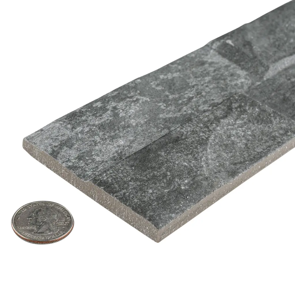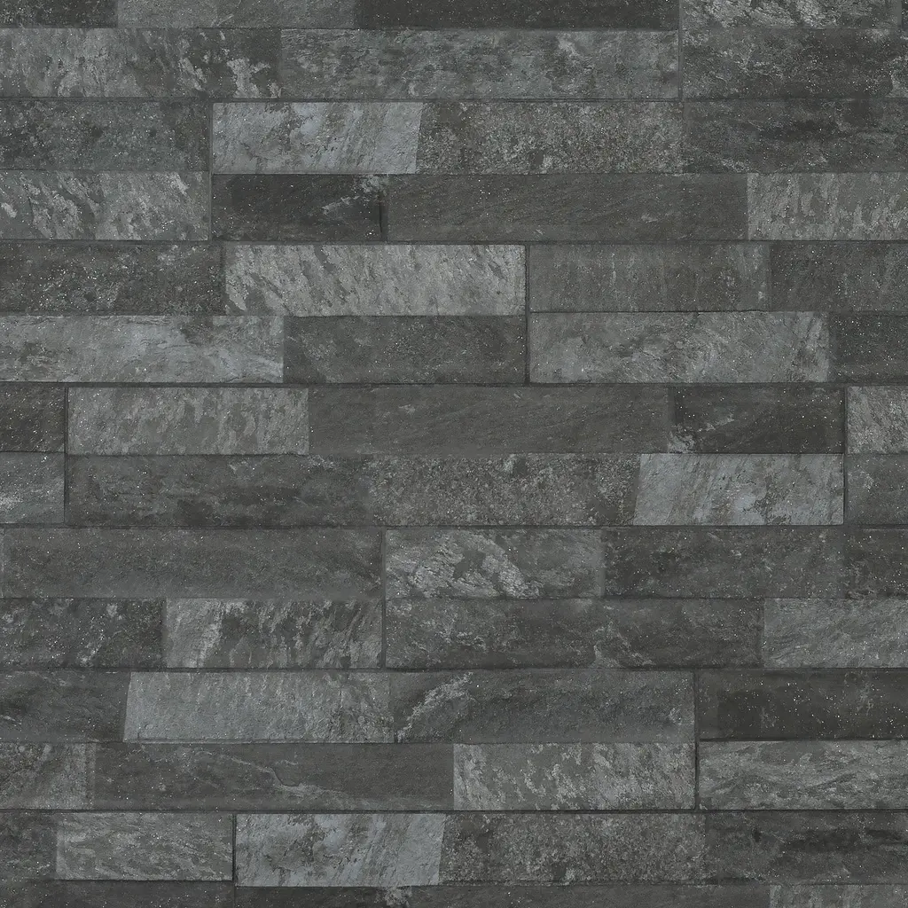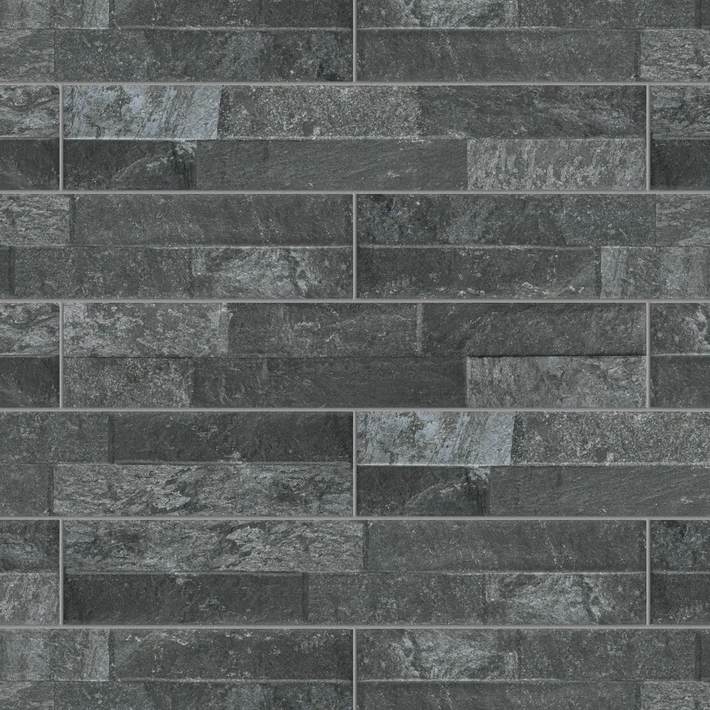 Through the realistic replication of natural stone, our Ordino Black Porcelain Subway Wall Tile transforms any space into a functional and stylish extension of nature. This enlarged rectangular wall tile features an off-set stacked stone pattern in varying shades of slate grey. With a textured three dimensional surface, this unique porcelain panel offers organic, rustic beauty. Available in twenty-four print variations that are randomly scattered throughout each case, the variation throughout each tile mimics an authentic stone appearance. Its impervious and frost-proof features make it an ideal choice for indoor and outdoor wall installations including kitchen backsplashes, shower walls, and fireplace facades. Tile is the better choice for your space. This tile is made from natural ingredients, making it a healthy choice as it is free from allergens, VOCs, formaldehyde and PVC.9.6 square feet, 24 pieces per case. Case weight is 35.27 lbs.Grade 1, first-quality porcelain tile for wall use3.25 in. width x 17.5 in. length x 0.34 in. thickGlazed, medium textured finish with a low sheen and uniform appearance in tonePEI Rating 0 is suitable for wall use onlyImpervious tiles have a water absorption of less than 0.5% for indoor and outdoor use and is frost resistantNo COF value available for this product - please refer to the PEI and DCOF ratings for product durability and resistanceCompletely frost resistant for indoor or outdoor applications; use a latex-modified thinset for acceptable bond strengthCommercial and residential usePlease note: A sample of this product may be a partial piece cut from the full size tile in order to provide an affordable and convenient way for customers to judge the quality and finish of this item. Samples are not returnable.