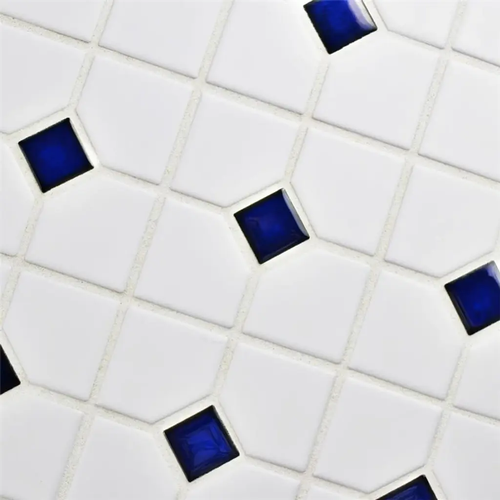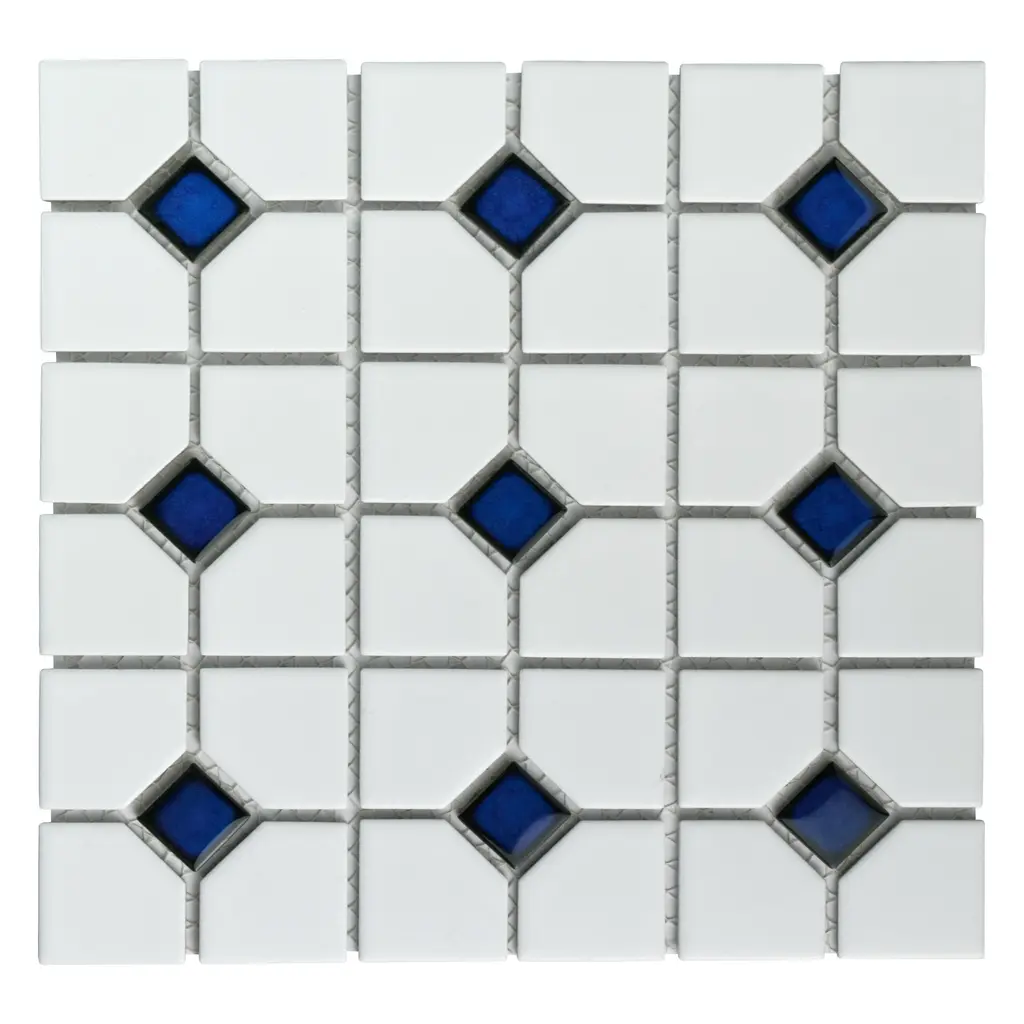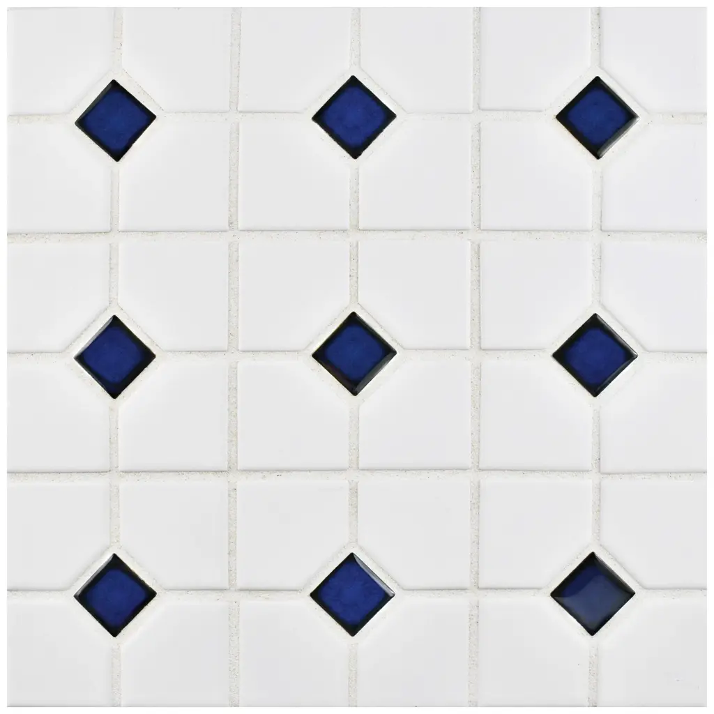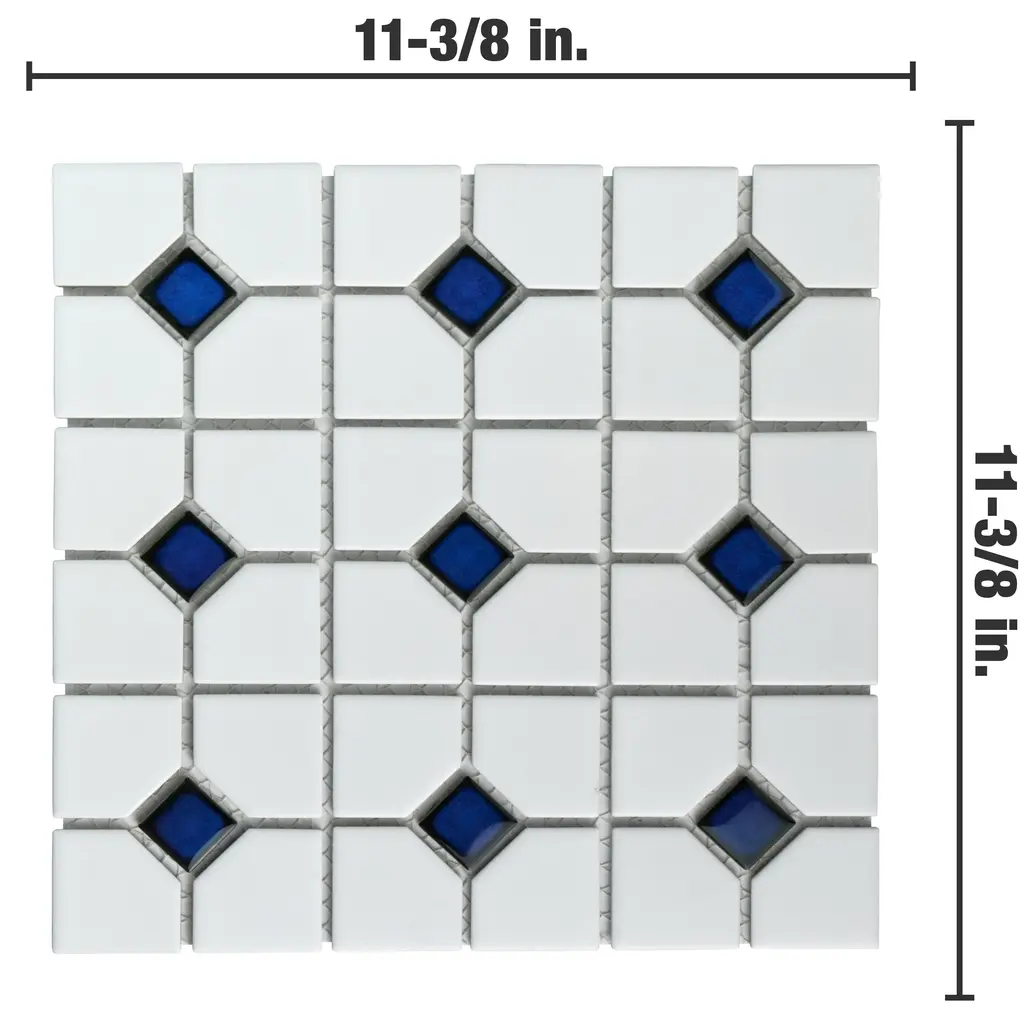 Our Oxford Matte White with Cobalt Dot Porcelain Mosaic Tile offers a traditional look that will fit within any design scheme. The soft matte finish on the white background and glossy finish on the cobalt blue diamonds exudes a classic look that never goes out of style. This mosaic tile has a mesh backing for easy installation. With a water absorption rating of less than 0.5%, this tile is a fit for any space including moisture-heavy or outdoor areas. 9.2 square feet, 10 pieces per case. Case weight is 19.16 lbs. Grade 1, first-quality porcelain tile for floor and wall use 11.38 in. width x 11.38 in. length x 0.23 in. thick mesh-mounted mosaic Glazed, mixed texture with a mixed finish and uniform appearance in tone PEI Rating III is suitable for medium-duty residential floors including kitchens, halls, corridors, balconies, terraces and areas used more often with normal footwear and small amounts of dirt Impervious tiles have a water absorption of less than 0.5% for indoor and outdoor use and are frost resistant This tile has a COF wet rating greater than 0.60 to 0.79 which is considered skid resistant for indoor and outdoor use. This tile is ADA approved for slip resistance. Completely frost resistant for indoor or outdoor applications; use a latex-modified thinset for acceptable bond strength Please note: A sample of this product may be a partial piece cut from the full size tile in order to provide an affordable and convenient way for customers to judge the quality and finish of this item. Samples are not returnable.