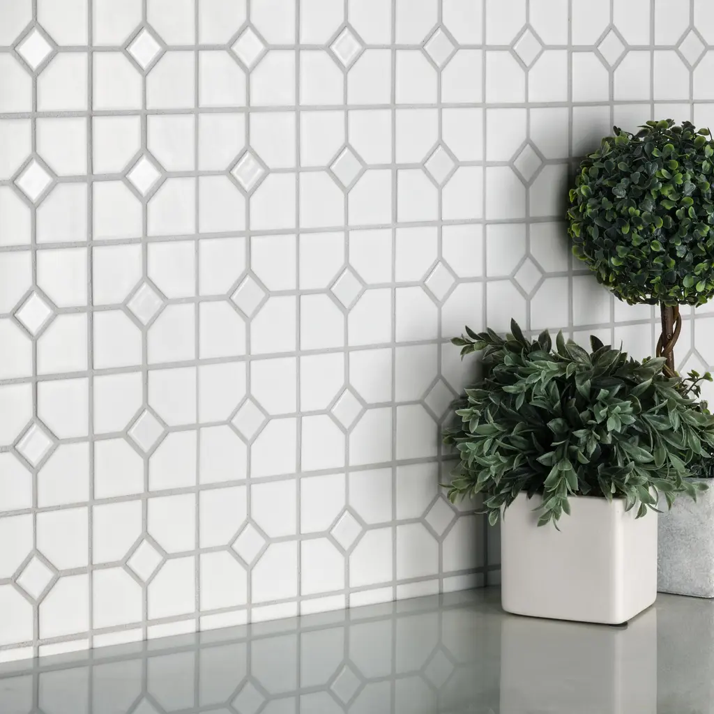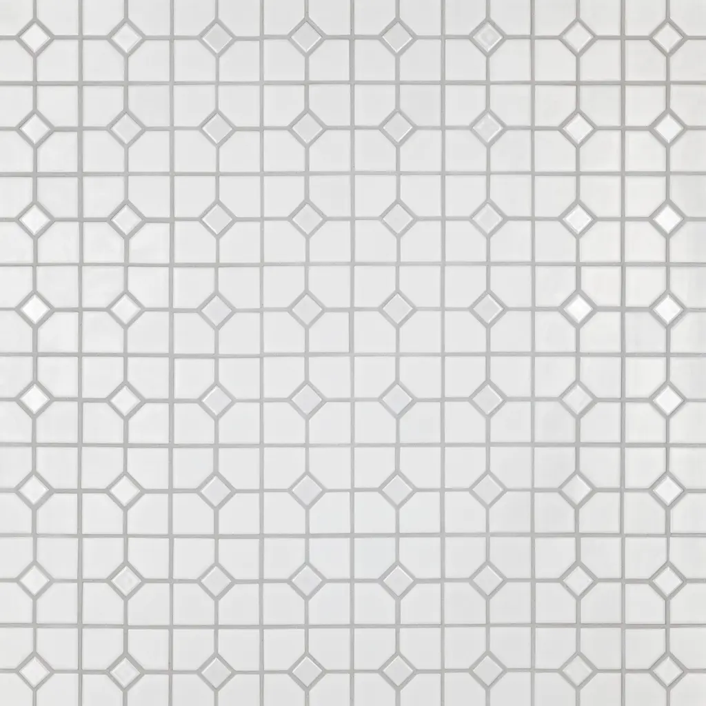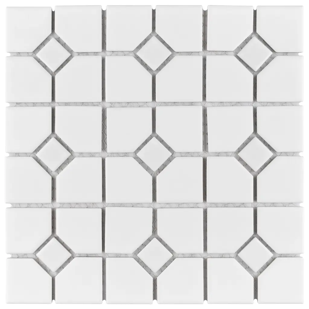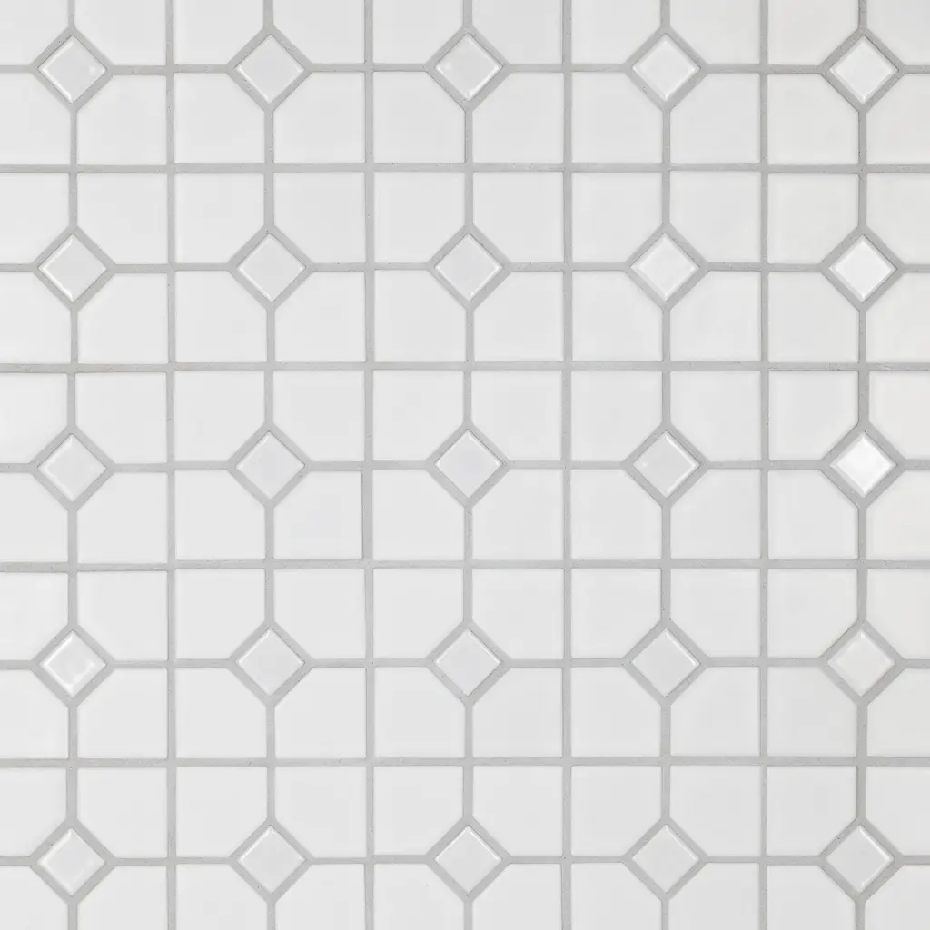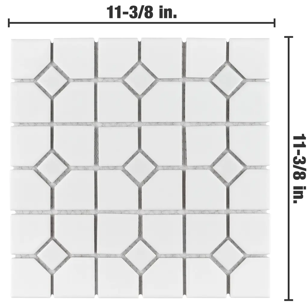 Offering a mosaic look, our Oxford Matte White with Glossy White Dot Porcelain Floor and Wall Tile features a mixed textured finish, providing decorative appeal that adapts to a variety of stylistic contexts. With its impervious, frost-resistant features, this mosaic is an ideal selection for both indoor and outdoor residential installations, including kitchens, bathrooms, backsplashes, showers, hallways and fireplace facades. This tile is a perfect choice on its own or paired with other products in the Oxford Collection. Tile is the better choice for your space! 9.2 square feet, 10 pieces per case. Case weight is 19.2 lbs. Grade 1, first-quality porcelain tile for floor and wall use 11.38 in. width x 11.38 in. length x 0.23 in. thick mesh-mounted mosaic Glazed, mixed texture with a mixed finish and uniform appearance in tone PEI Rating III is suitable for medium-duty residential floors including kitchens, halls, corridors, balconies, terraces and areas used more often with normal footwear and small amounts of dirt Impervious tiles have a water absorption of less than 0.5% for indoor and outdoor use and are frost resistant This tile has a COF wet rating greater than 0.60 to 0.79 which is considered skid resistant for indoor and outdoor use. This tile is ADA approved for slip resistance. Completely frost resistant for indoor or outdoor applications; use a latex-modified thinset for acceptable bond strength Please note: A sample of this product may be a partial piece cut from the full size tile in order to provide an affordable and convenient way for customers to judge the quality and finish of this item. Samples are not returnable.
