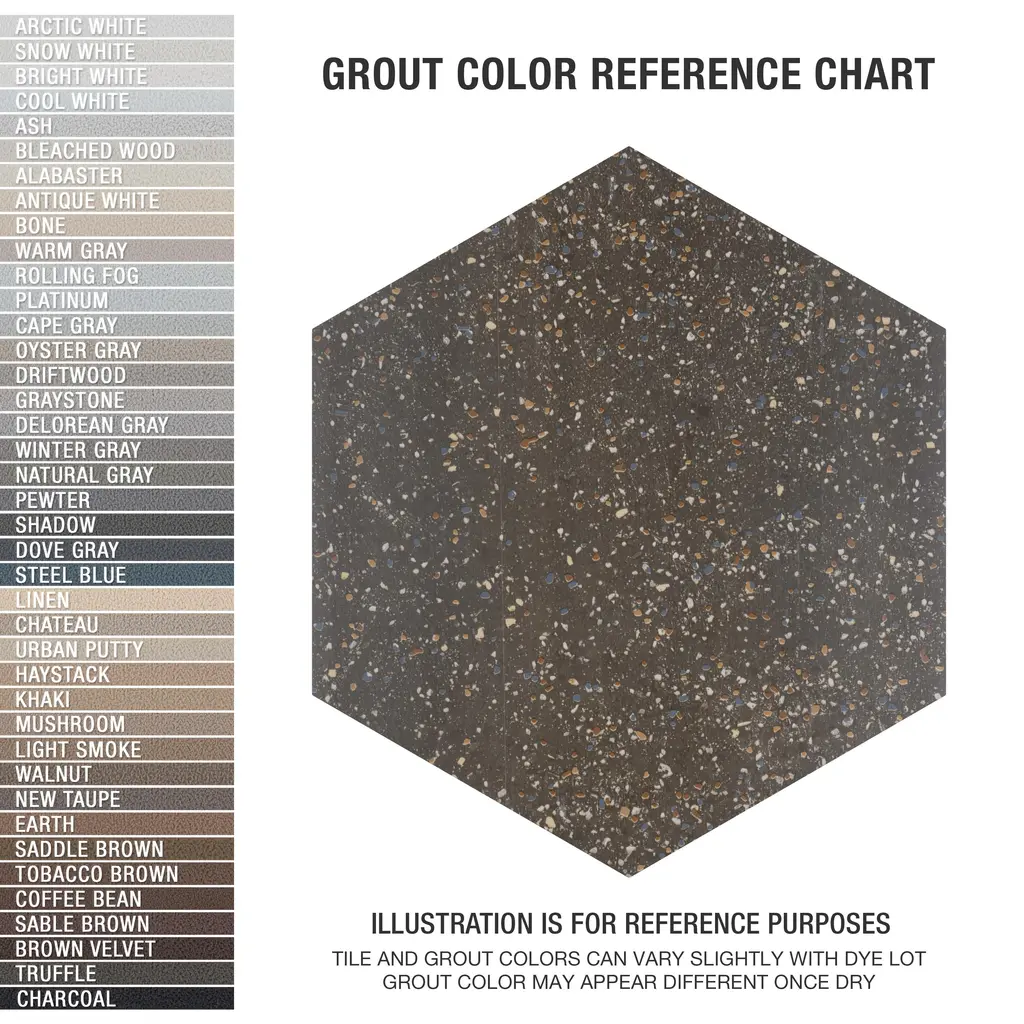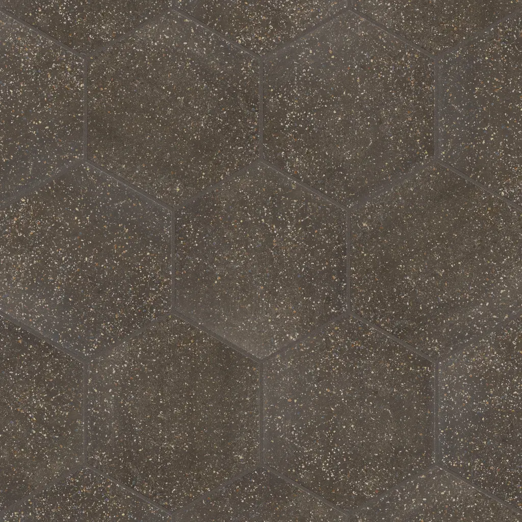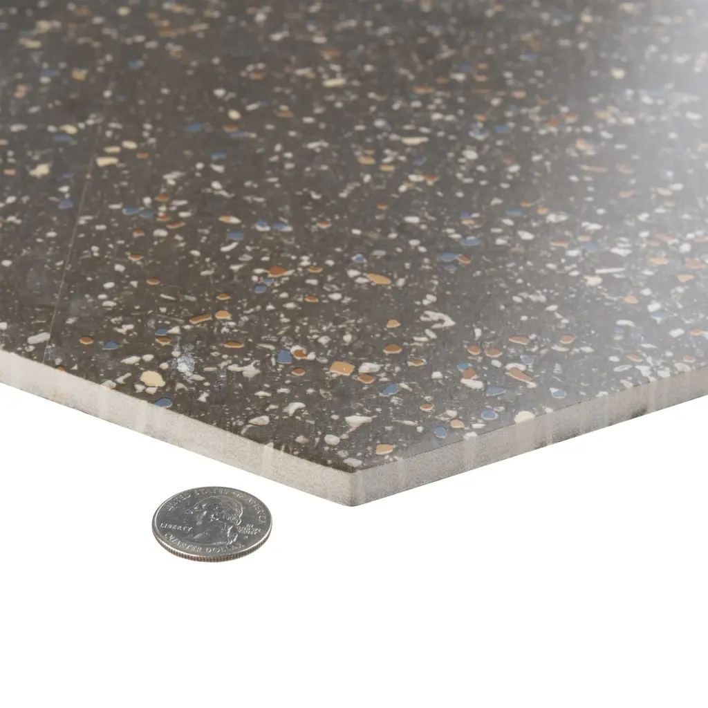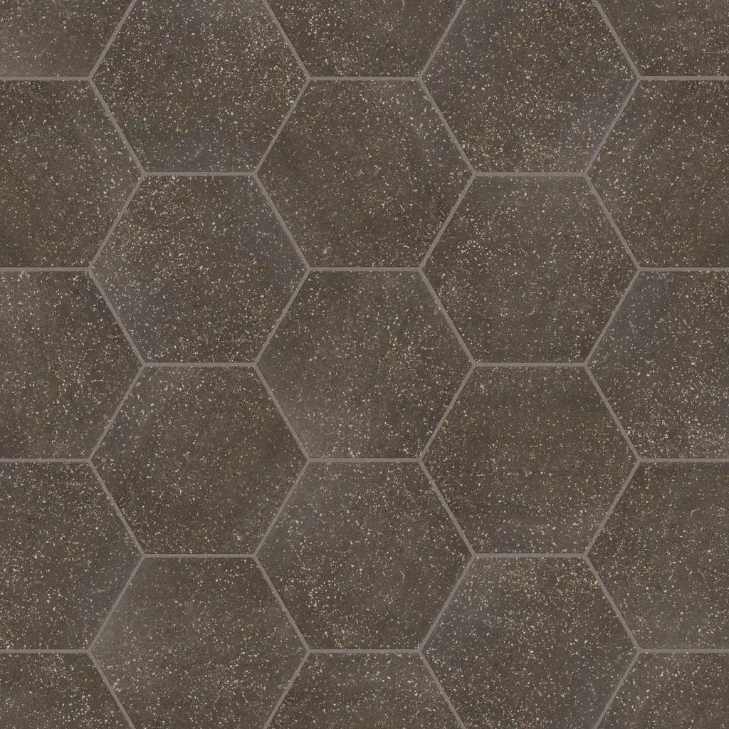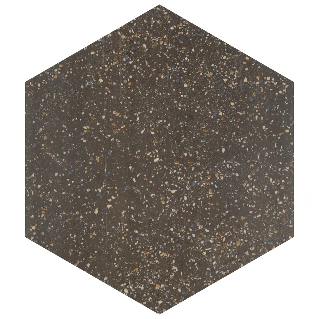 Replicating a worn concrete appearance with floating fragments of stones, our Palazzo Hex Colori Porcelain Floor and Wall Tile lends a burst of terrazzo-look energy to any space. This hexagon tile features speckled pattern variations in colorful tones that are set on a charcoal brown base glaze, offering subtle contrast and dimension to the design. The smooth, matte surface features a weathered, mottled look, replicating the beauty of aged stone tile. This trendsetting display of speckled neutral tones is visually appealing and versatile, and blends beautifully with a range of design styles from vintage industrial to modern day. Its impervious and frost-resist features make it an ideal choice for indoor and outdoor installations including kitchens, bathrooms, backsplashes, showers, patios, and fireplace facades. Tile is the better choice for your space. This tile is made from natural ingredients, making it a healthy choice as it is free from allergens, VOCs, formaldehyde, and PVC. 11.07 square feet, 9 pieces per case. Case weight is 48.6 lbs. Grade 1, first-quality porcelain tile for floor and wall use 14.13 in. width x 16.25 in. length x 0.39 in. thick Glazed, smooth finish with a low sheen and uniform appearance in tone PEI Rating II is suitable for all interior walls and light foot traffic such as powder rooms Impervious tiles have a water absorption of less than 0.5% for indoor and outdoor use and are frost resistant This tile is ADA approved for slip resistance with a DCOF value of 0.42 or higher. Completely frost resistant for indoor or outdoor applications; use a latex-modified thinset for acceptable bond strength Please note: A sample of this product may be a partial piece cut from the full size tile in order to provide an affordable and convenient way for customers to judge the quality and finish of this item. Samples are not returnable.