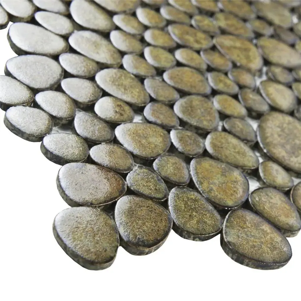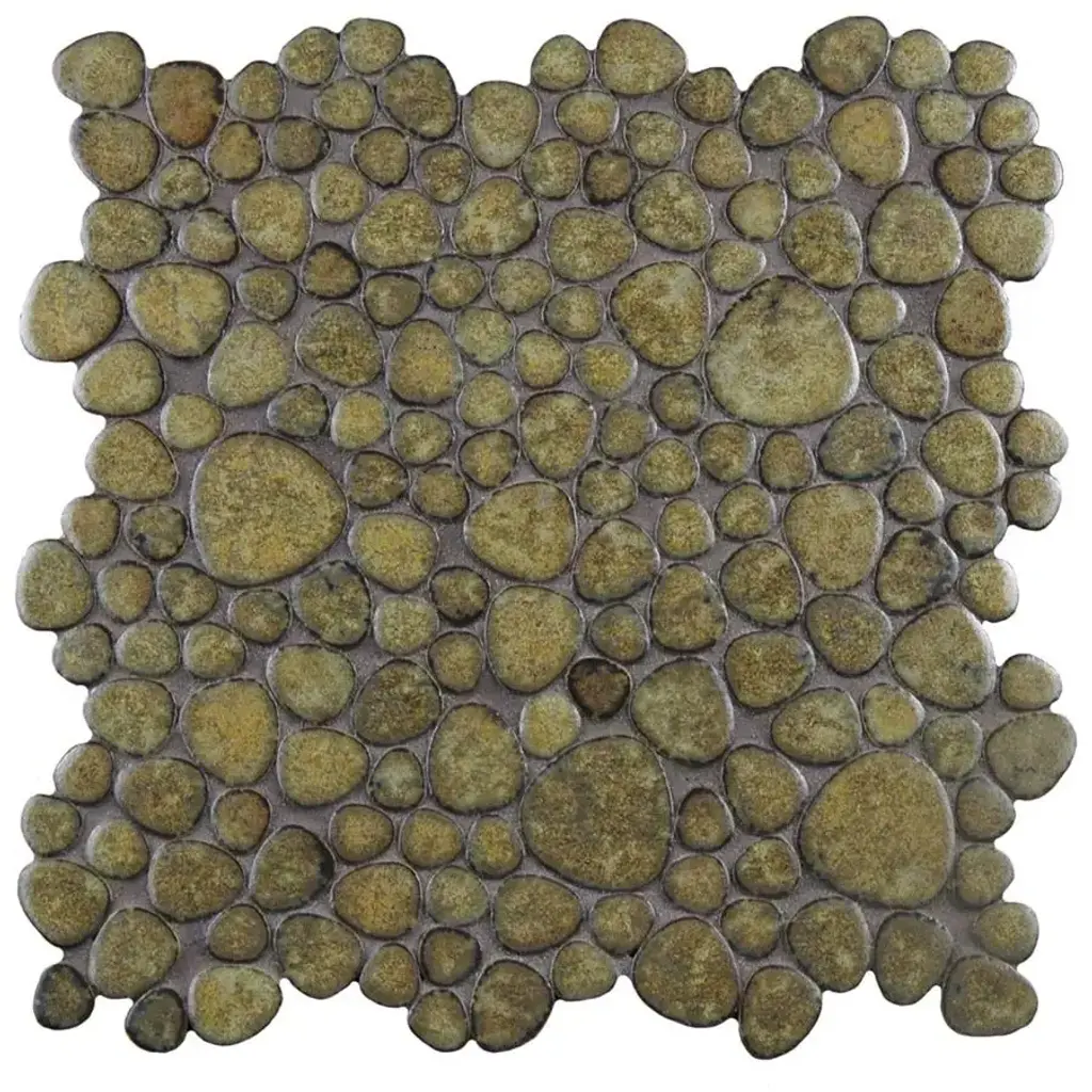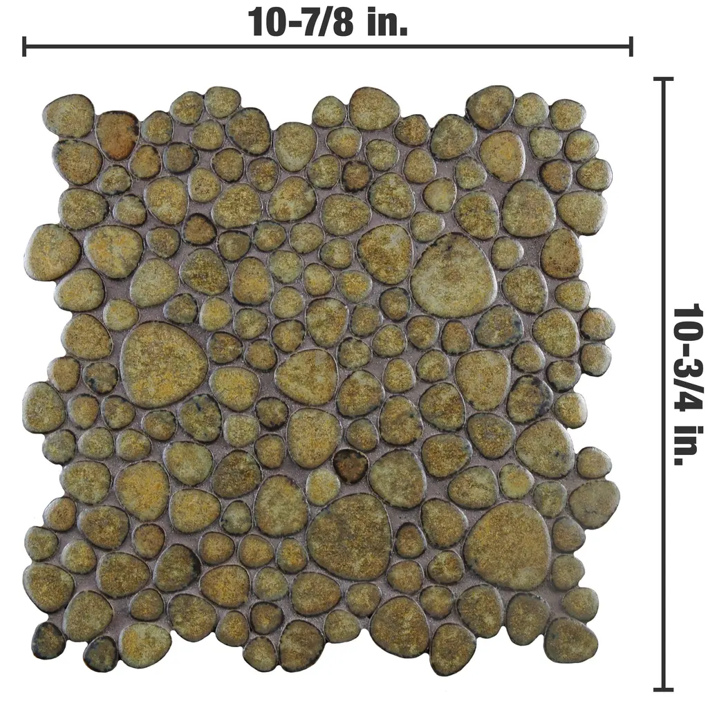 Offering a mosaic look, our Pebble Brownstone Porcelain Floor and Wall Tile features a slightly textured, glossy finish, providing decorative appeal that adapts to a variety of stylistic contexts. With its impervious, frost-resistant features, this mosaic is an ideal selection for a variety of spaces including indoor and outdoor commercial and residential installations, kitchens, bathrooms, backsplashes, showers, hallways, entryways, patios, pools and fireplace facades. Discover more products from the Merola Tile Pebble Collection to complete your design. To ensure optimal results, please consult with your installer and review the product specifications to confirm that this tile meets the specific needs of your project. 8.3 square feet, 10 pieces per case. Case weight is 13.65 lbs. Grade 1, first-quality porcelain tile for floor and wall use 10.75 in. width x 10.88 in. length x 0.2 in. thick mesh-mounted mosaic Glazed, slightly textured finish with a high sheen and moderate variation in tone PEI Rating IV has high resistance to abrasion and is suitable for heavy-duty residential and commercial kitchens, hotels, exhibition and sales rooms with some dirt conditions Impervious tiles have a water absorption of less than 0.5% for indoor and outdoor use and are frost resistant This tile has a COF wet rating greater than 0.60 to 0.79 which is considered skid resistant for indoor and outdoor use. This tile is ADA approved for slip resistance. Completely frost resistant for indoor or outdoor applications; use a latex-modified thinset for acceptable bond strength Please note: A sample of this product may be a partial piece cut from the full size tile in order to provide an affordable and convenient way for customers to judge the quality and finish of this item. Samples are not returnable.