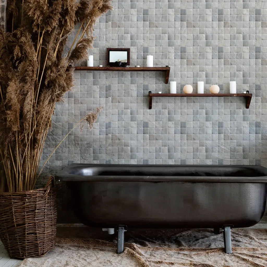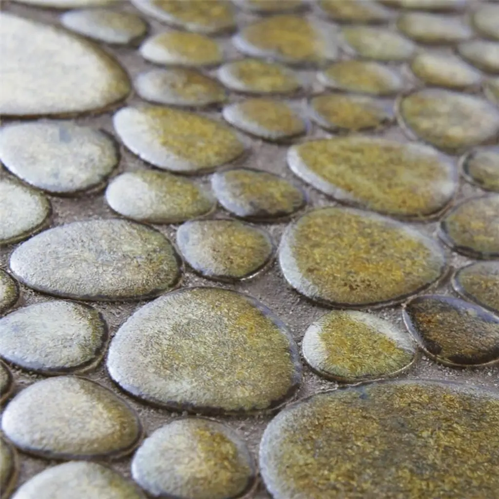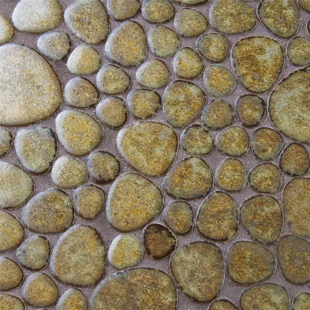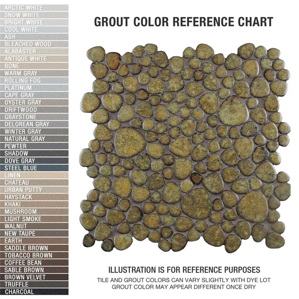Offering a mosaic look, our Pebble Brownstone Porcelain Floor and Wall Tile features a slightly textured, glossy finish, providing decorative appeal that adapts to a variety of stylistic contexts. With its impervious, frost-resistant features, this mosaic is an ideal selection for a variety of spaces including indoor and outdoor commercial and residential installations, kitchens, bathrooms, backsplashes, showers, hallways, entryways, patios, pools and fireplace facades. Discover more products from the Merola Tile Pebble Collection to complete your design. To ensure optimal results, please consult with your installer and review the product specifications to confirm that this tile meets the specific needs of your project. 8.3 square feet, 10 pieces per case. Case weight is 13.65 lbs. Grade 1, first-quality porcelain tile for floor and wall use 10.75 in. width x 10.88 in. length x 0.2 in. thick mesh-mounted mosaic Glazed, slightly textured finish with a high sheen and moderate variation in tone PEI Rating IV has high resistance to abrasion and is suitable for heavy-duty residential and commercial kitchens, hotels, exhibition and sales rooms with some dirt conditions Impervious tiles have a water absorption of less than 0.5% for indoor and outdoor use and are frost resistant This tile has a COF wet rating greater than 0.60 to 0.79 which is considered skid resistant for indoor and outdoor use. This tile is ADA approved for slip resistance. Completely frost resistant for indoor or outdoor applications; use a latex-modified thinset for acceptable bond strength Please note: A sample of this product may be a partial piece cut from the full size tile in order to provide an affordable and convenient way for customers to judge the quality and finish of this item. Samples are not returnable.