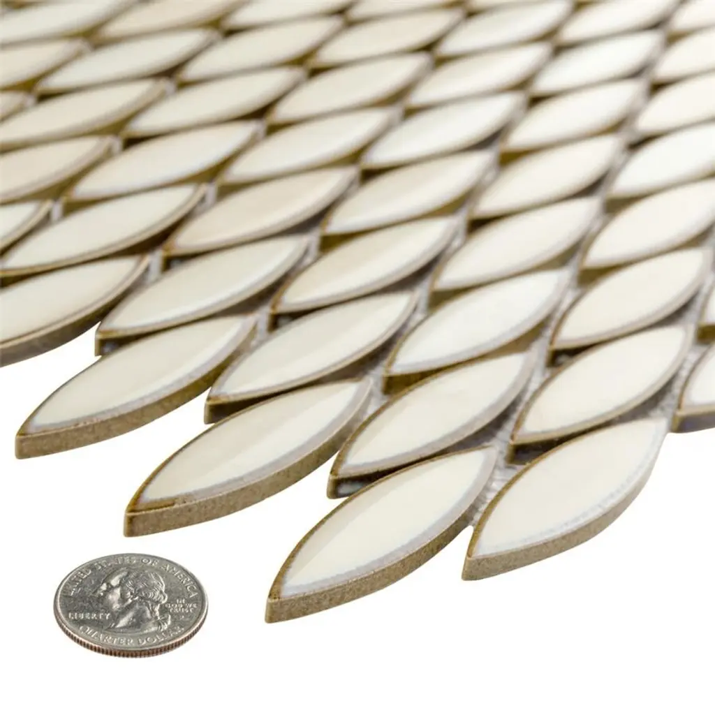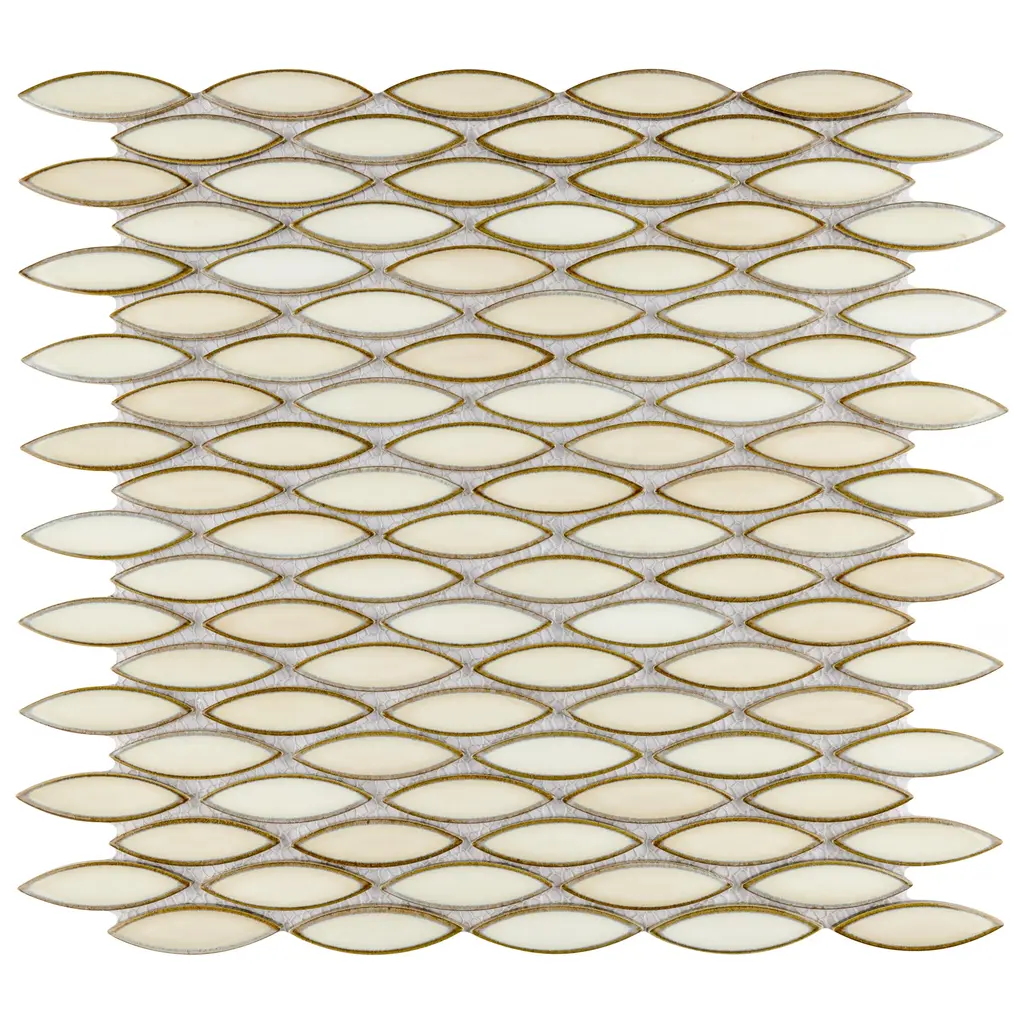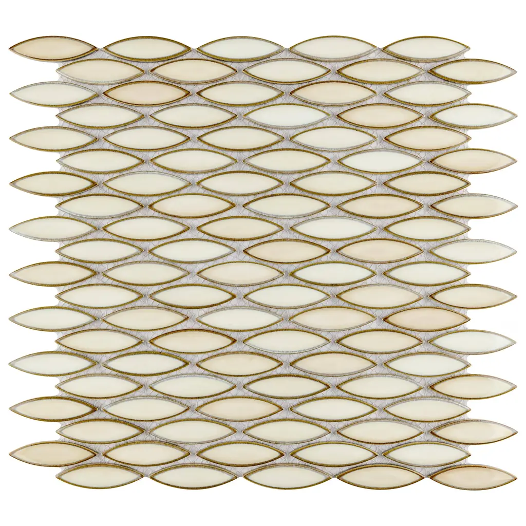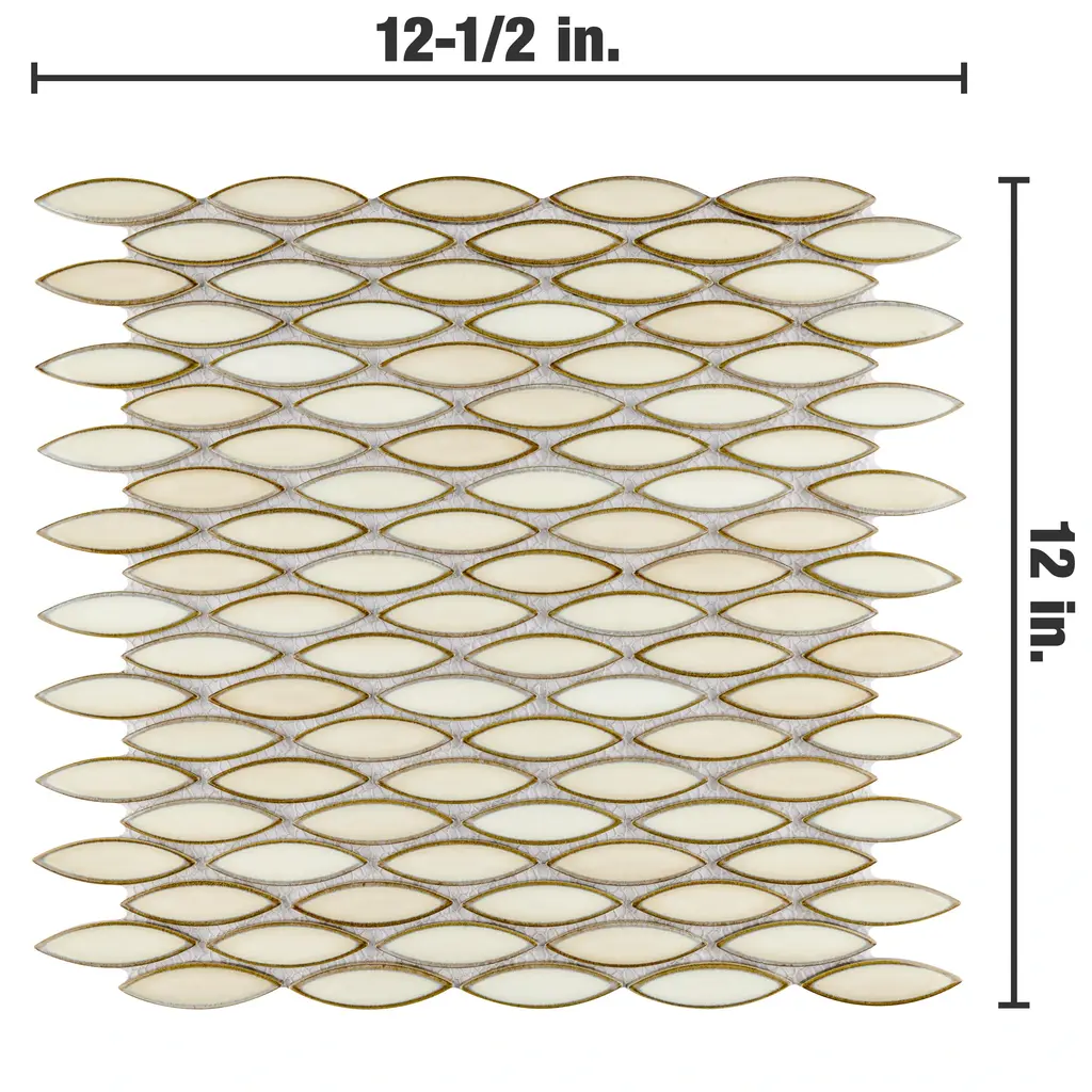 Our Pescado Glossy Crema Porcelain Mosaic Floor and Wall Tile captures the timeless appeal of mosaic tile in a modern geometric format. Featuring a visually rich reactive glaze with an eye-drop effect, these elongated oval tiles have soft hues of beige, cream and white that blend to taupe around the edges. This floor and wall tile creates the subtle illusion of movement through a pleasing mixture of warm-toned tints with additional depth provided by the smooth, high glossy finish. Its impervious and frost-resistant features make this an ideal tile for both indoor and outdoor residential use, including kitchen backsplashes, bathrooms, showers and accent walls. This tile is a perfect choice on its own or paired with other products in the Pescado Collection. Tile is the better choice for your space. This tile is made from natural ingredients, making it a healthy choice as it is free from allergens, VOCs, formaldehyde and PVC. 1.06 square feet per piece, each piece sold individually. Piece weight equals 2.2 lbs. Grade 1, first-quality porcelain tile for floor and wall use 12 in. width x 12.5 in. length x 0.25 in. thick mesh-mounted mosaic Glazed, smooth finish with a high sheen and moderate variation in tone PEI Rating I is suitable for light-duty residential floors, bathrooms and bedrooms without direct access from outside; no scratching dirt can be present Impervious tiles have a water absorption of less than 0.5% for indoor and outdoor use and are frost resistant This tile is not ADA approved for slip resistance with a DCOF value less than 0.42. Completely frost resistant for indoor or outdoor applications; use a latex-modified thinset for acceptable bond strength Please note: A sample of this product may be a partial piece cut from the full size tile in order to provide an affordable and convenient way for customers to judge the quality and finish of this item. Samples are not returnable.