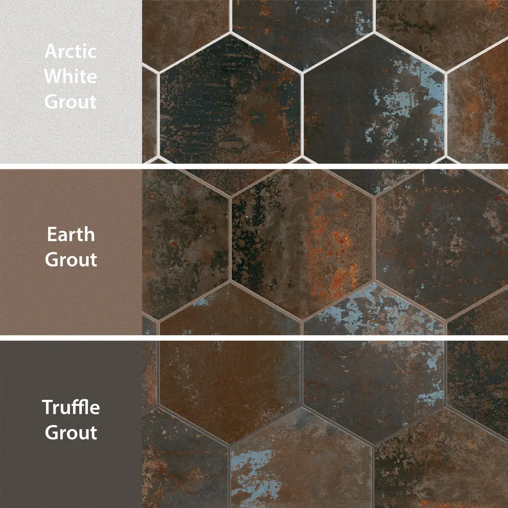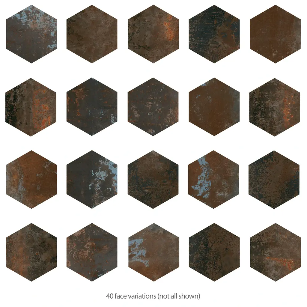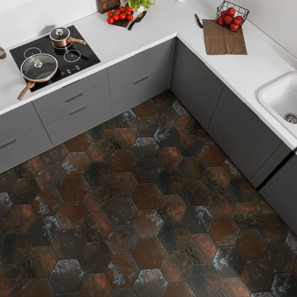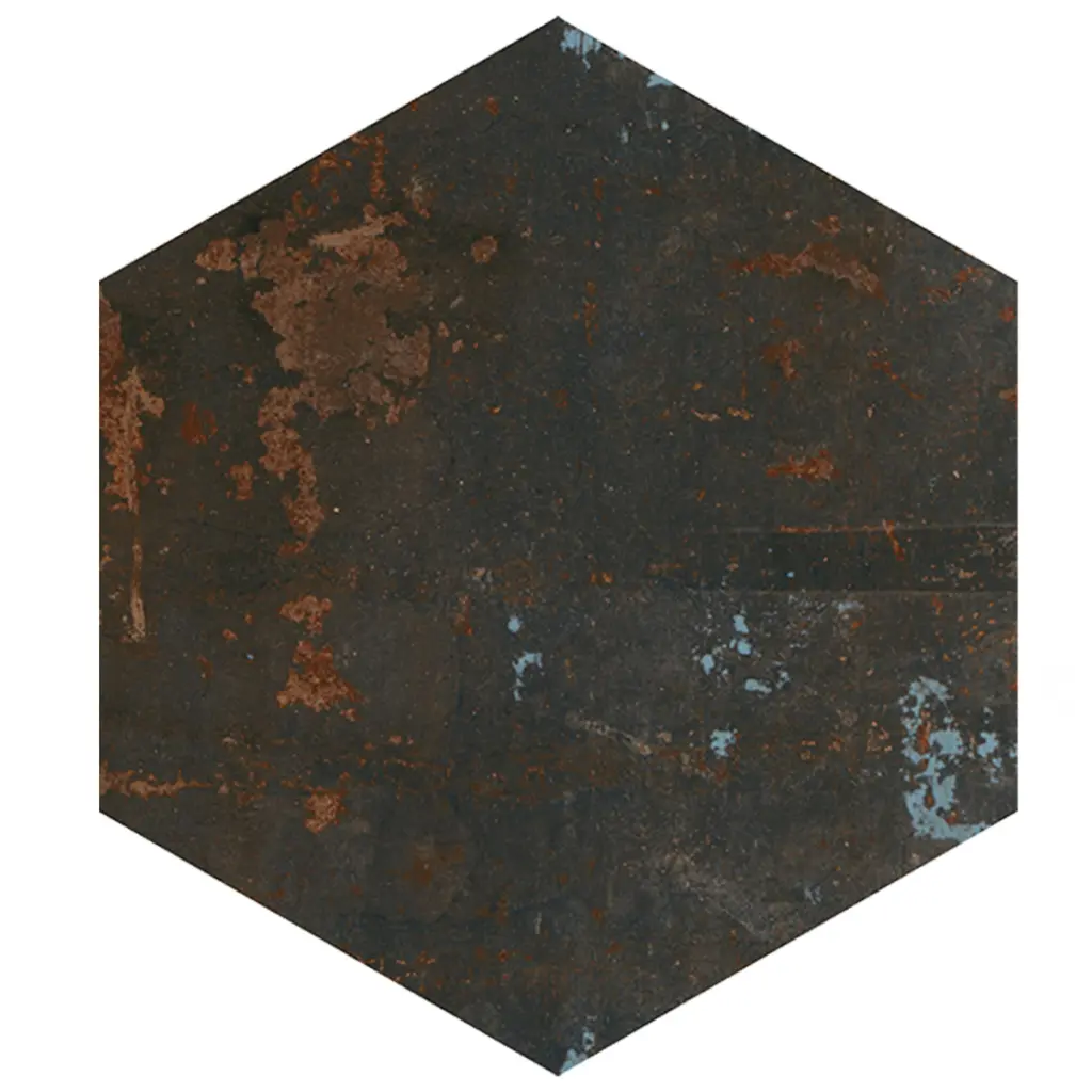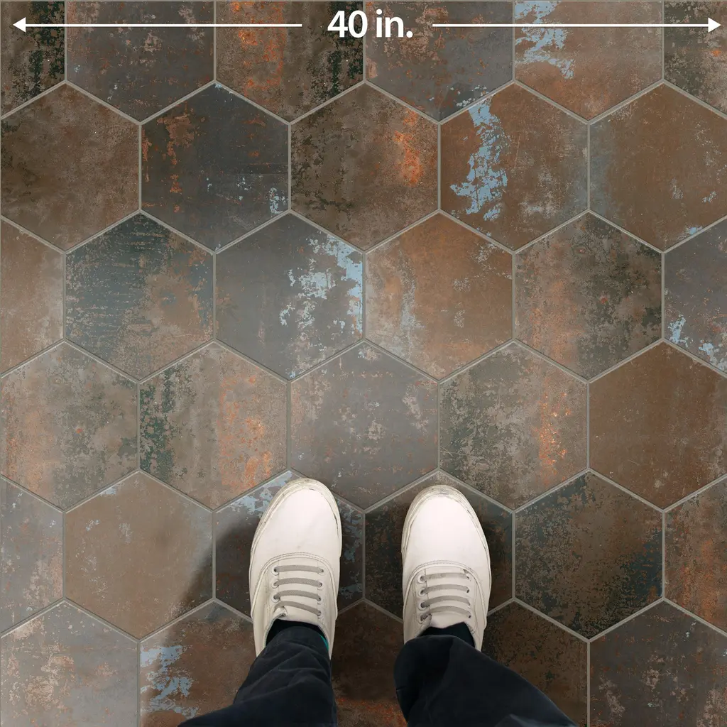 Offering a distressed look, our Polaris Hex Mix Porcelain Floor and Wall Tile features a slightly textured, mixed finish, providing decorative appeal that adapts to a variety of stylistic contexts. Containing 40 different print variations that are randomly distributed throughout each case, this brown hexagon tile offers a one-of-a-kind look. With its impervious, frost-resistant features, this tile is an ideal selection for both indoor and outdoor residential installations, including kitchens, bathrooms, backsplashes, showers, hallways and fireplace facades. This tile is a perfect choice on its own or paired with other products in the Polaris Collection. Tile is the better choice for your space! 11.5 square feet, 25 pieces per case. Case weight is 50.64 lbs. Grade 1, first-quality porcelain tile for floor and wall use 8.63 in. width x 9.88 in. length x 0.39 in. thick Glazed, slightly textured finish with a mixed finish and substantial variation in tone PEI Rating III is suitable for medium-duty residential floors including kitchens, halls, corridors, balconies, terraces and areas used more often with normal footwear and small amounts of dirt Impervious tiles have a water absorption of less than 0.5% for indoor and outdoor use and are frost resistant This tile is ADA approved for slip resistance with a DCOF value of 0.42 or higher. Completely frost resistant for indoor or outdoor applications; use a latex-modified thinset for acceptable bond strength Please note: Samples are not returnable
