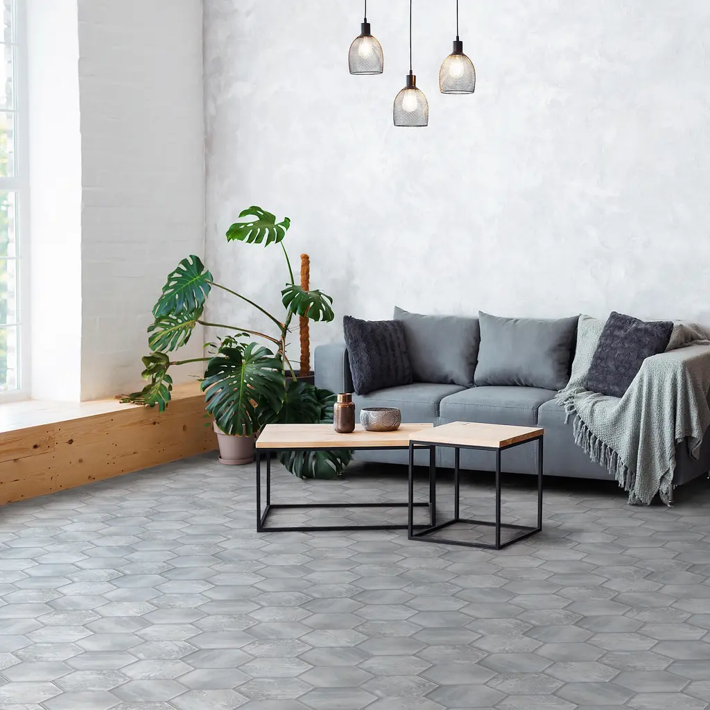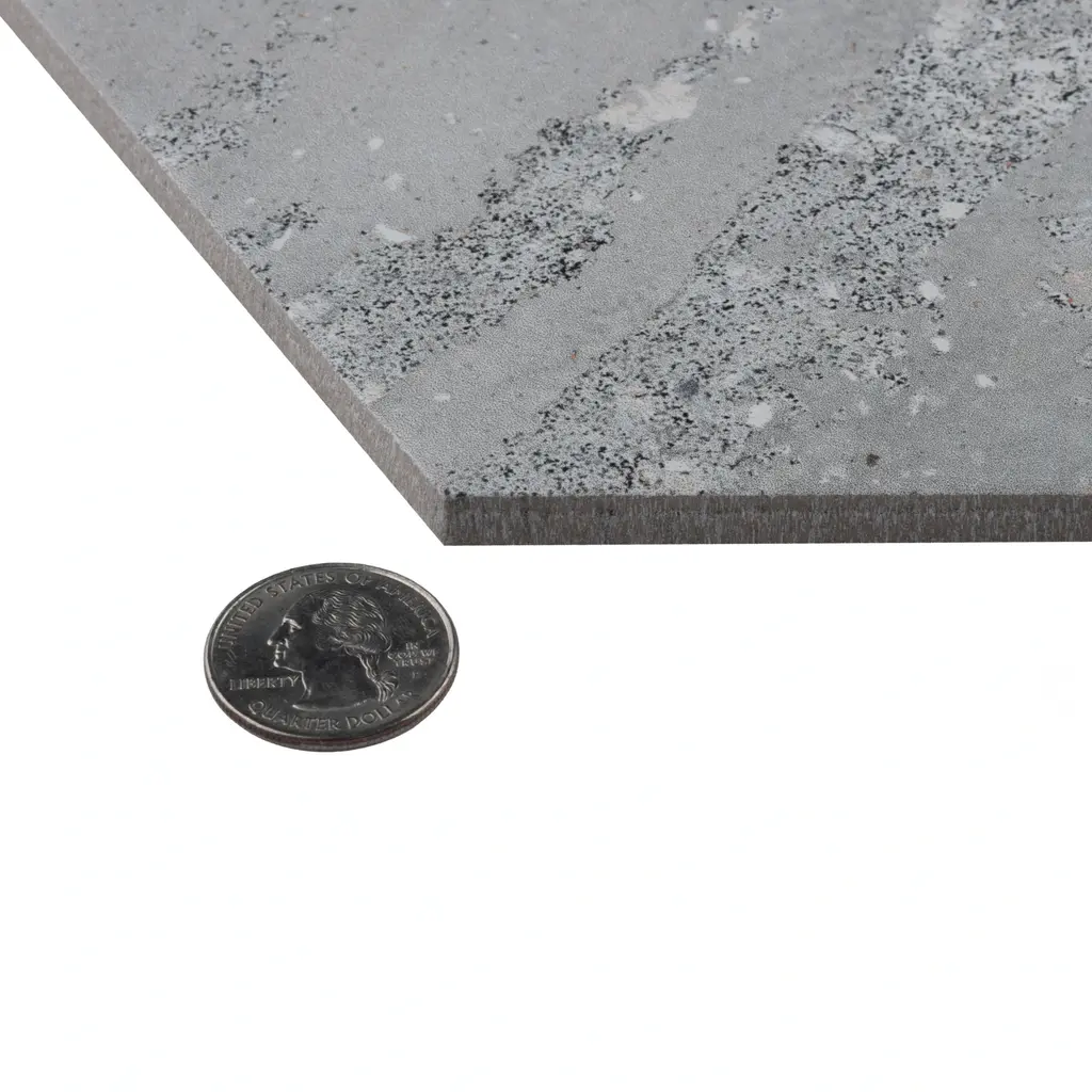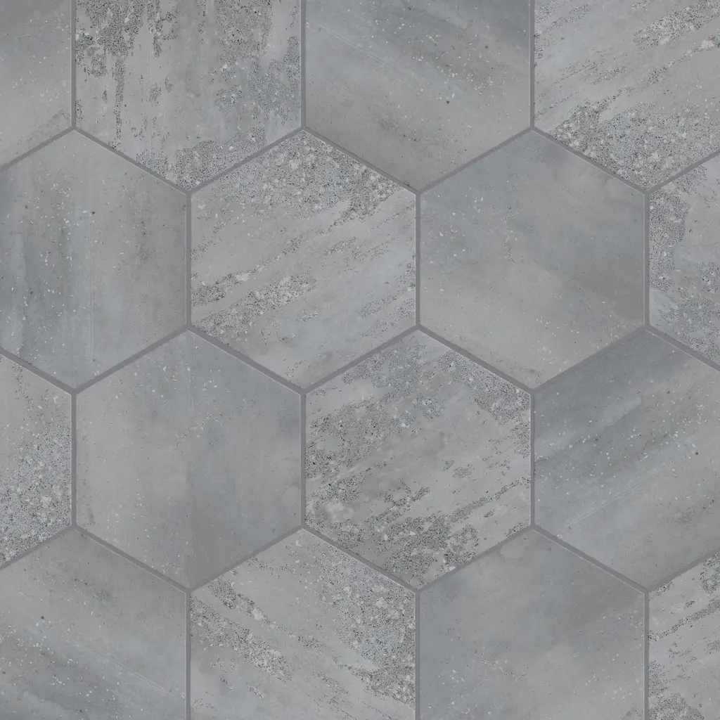 Replicating a terrazzo look, our Recycle Hex Antique Porcelain Floor and Wall Tile features a medium textured, mixed finish, providing decorative appeal that adapts to a variety of stylistic contexts. Containing 36 different print variations that are randomly distributed throughout each case, this gray hexagon tile offers a one-of-a-kind look. With its impervious, frost-resistant features, this tile is an ideal selection for both indoor and outdoor commercial and residential installations, including kitchens, bathrooms, backsplashes, showers, hallways, entryways, patios and fireplace facades. This tile is a perfect choice on its own or paired with other products in the Recycle Collection. Tile is the better choice for your space! 4.05 square feet, 9 pieces per case. Case weight is 18.63 lbs. Grade 1, first-quality porcelain tile for floor and wall use 8.5 in. width x 9.88 in. length x 0.39 in. thick Glazed, medium textured finish with a mixed finish and moderate variation in tone PEI Rating IV has high resistance to abrasion and is suitable for heavy-duty residential and commercial kitchens, hotels, exhibition and sales rooms with some dirt conditions Impervious tiles have a water absorption of less than 0.5% for indoor and outdoor use and are frost resistant This tile is ADA approved for slip resistance with a DCOF value of 0.42 or higher. Completely frost resistant for indoor or outdoor applications; use a latex-modified thinset for acceptable bond strength Please note: A sample of this product may be a partial piece cut from the full size tile in order to provide an affordable and convenient way for customers to judge the quality and finish of this item. Samples are not returnable.