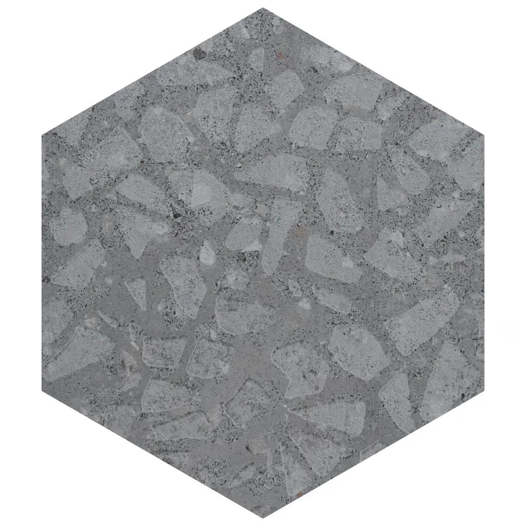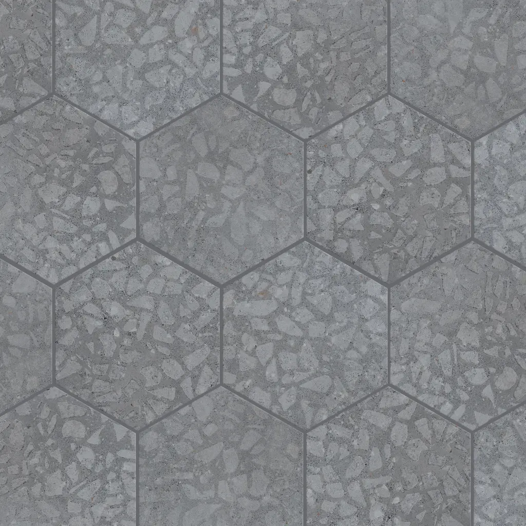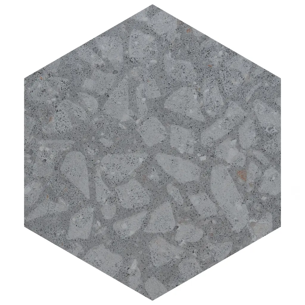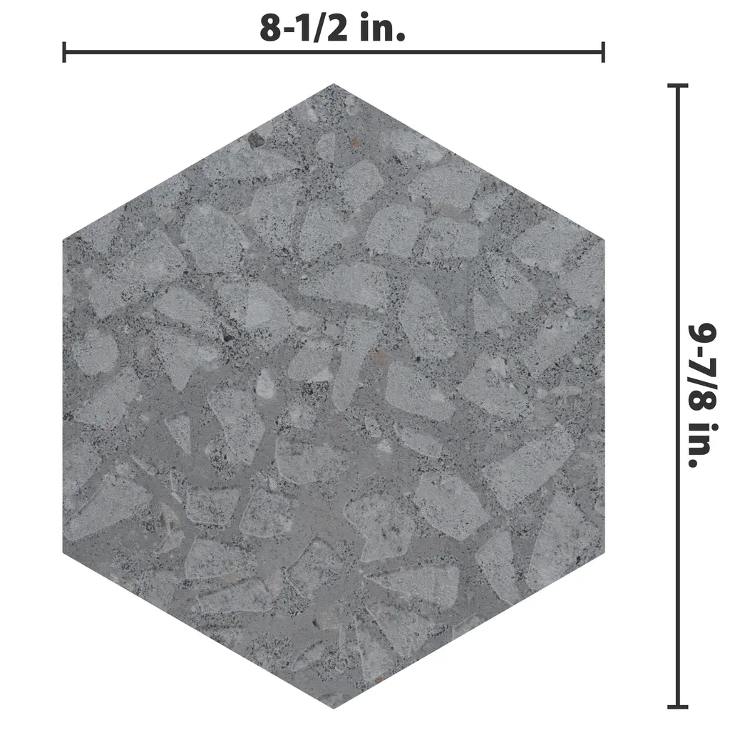 Replicating a terrazzo look, our Recycle Venice Porcelain Floor and Wall Tile features a medium textured, mixed finish, providing decorative appeal that adapts to a variety of stylistic contexts. Containing 36 different print variations that are randomly distributed throughout each case, this gray hexagon tile offers a one-of-a-kind look. With its impervious, frost-resistant features, this tile is an ideal selection for both indoor and outdoor commercial and residential installations, including kitchens, bathrooms, backsplashes, showers, hallways, entryways, patios and fireplace facades. This tile is a perfect choice on its own or paired with other products in the Recycle Collection. Tile is the better choice for your space! 4.05 square feet, 9 pieces per case. Case weight is 18.63 lbs. Grade 1, first-quality porcelain tile for floor and wall use 8.5 in. width x 9.88 in. length x 0.39 in. thick Glazed, medium textured finish with a mixed finish and moderate variation in tone PEI Rating IV has high resistance to abrasion and is suitable for heavy-duty residential and commercial kitchens, hotels, exhibition and sales rooms with some dirt conditions Impervious tiles have a water absorption of less than 0.5% for indoor and outdoor use and are frost resistant This tile is ADA approved for slip resistance with a DCOF value of 0.42 or higher. Completely frost resistant for indoor or outdoor applications; use a latex-modified thinset for acceptable bond strength Please note: A sample of this product may be a partial piece cut from the full size tile in order to provide an affordable and convenient way for customers to judge the quality and finish of this item. Samples are not returnable.