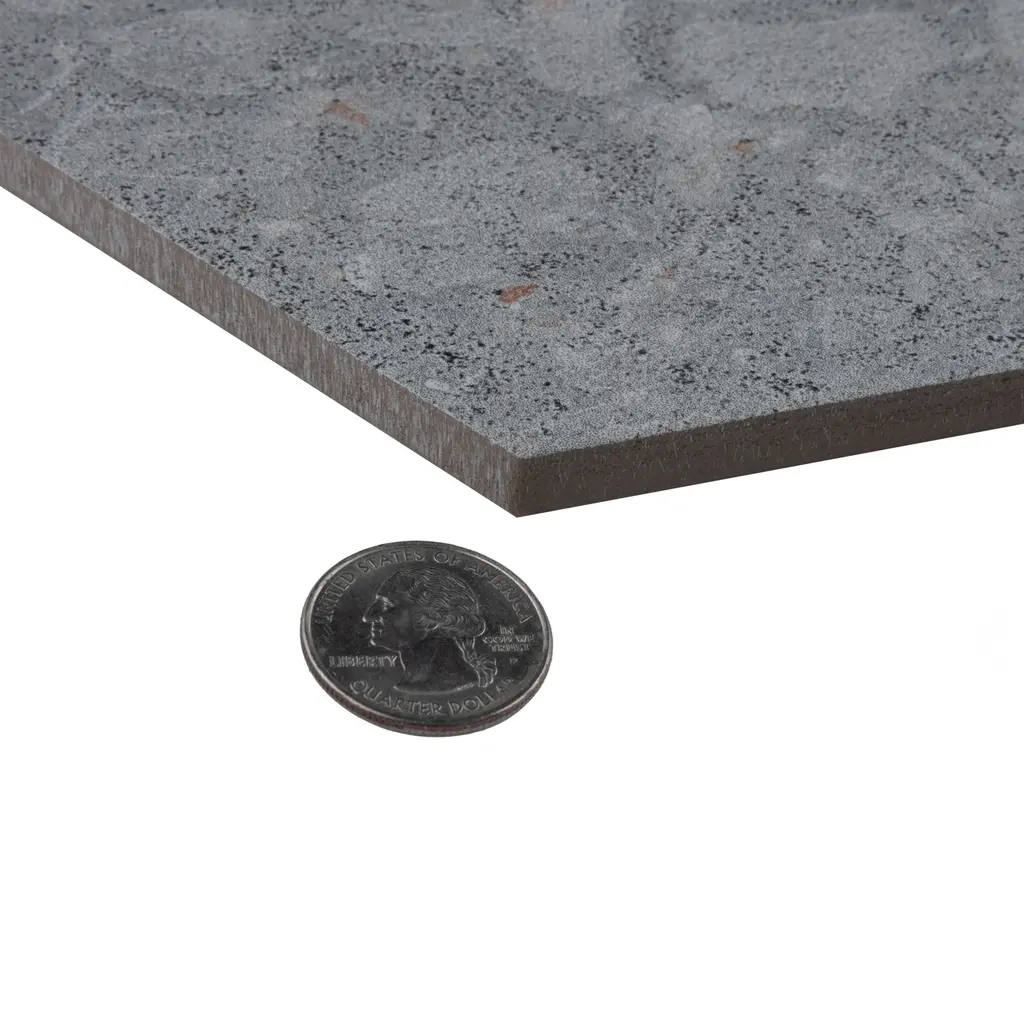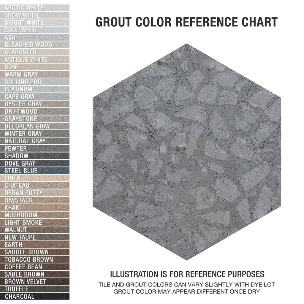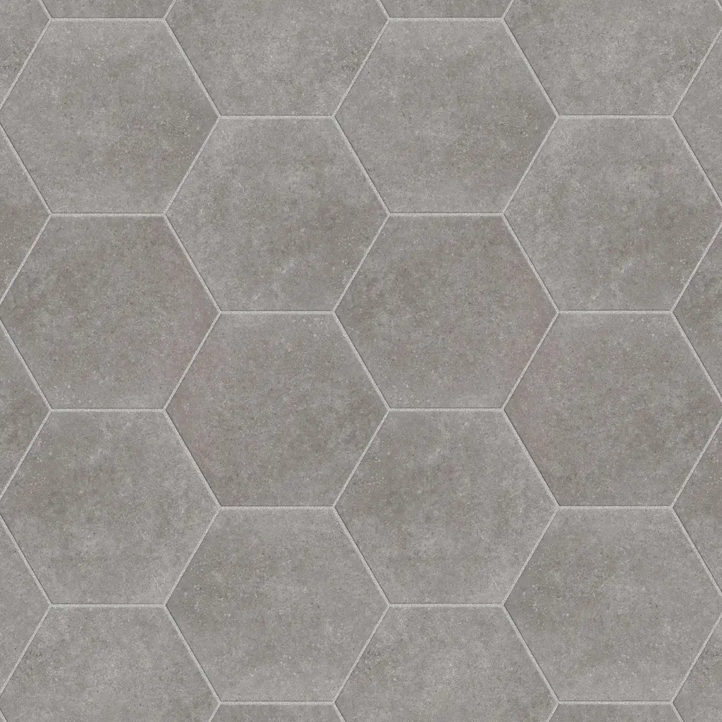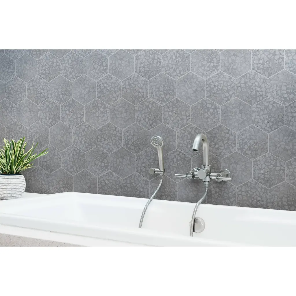 Replicating a terrazzo look, our Recycle Venice Porcelain Floor and Wall Tile features a medium textured, mixed finish, providing decorative appeal that adapts to a variety of stylistic contexts. Containing 36 different print variations that are randomly distributed throughout each case, this gray hexagon tile offers a one-of-a-kind look. With its impervious, frost-resistant features, this tile is an ideal selection for both indoor and outdoor commercial and residential installations, including kitchens, bathrooms, backsplashes, showers, hallways, entryways, patios and fireplace facades. This tile is a perfect choice on its own or paired with other products in the Recycle Collection. Tile is the better choice for your space! 4.05 square feet, 9 pieces per case. Case weight is 18.63 lbs. Grade 1, first-quality porcelain tile for floor and wall use 8.5 in. width x 9.88 in. length x 0.39 in. thick Glazed, medium textured finish with a mixed finish and moderate variation in tone PEI Rating IV has high resistance to abrasion and is suitable for heavy-duty residential and commercial kitchens, hotels, exhibition and sales rooms with some dirt conditions Impervious tiles have a water absorption of less than 0.5% for indoor and outdoor use and are frost resistant This tile is ADA approved for slip resistance with a DCOF value of 0.42 or higher. Completely frost resistant for indoor or outdoor applications; use a latex-modified thinset for acceptable bond strength Please note: A sample of this product may be a partial piece cut from the full size tile in order to provide an affordable and convenient way for customers to judge the quality and finish of this item. Samples are not returnable.