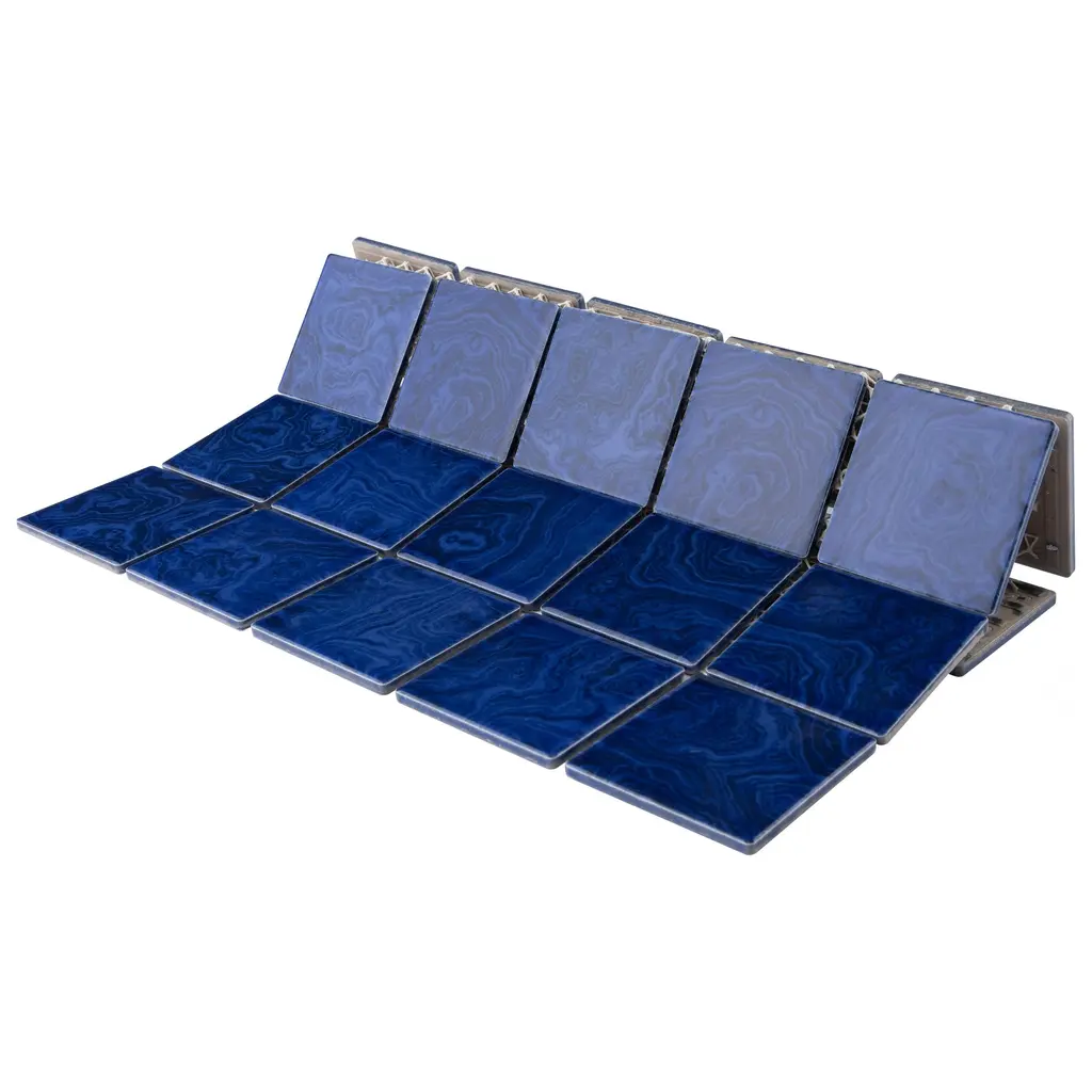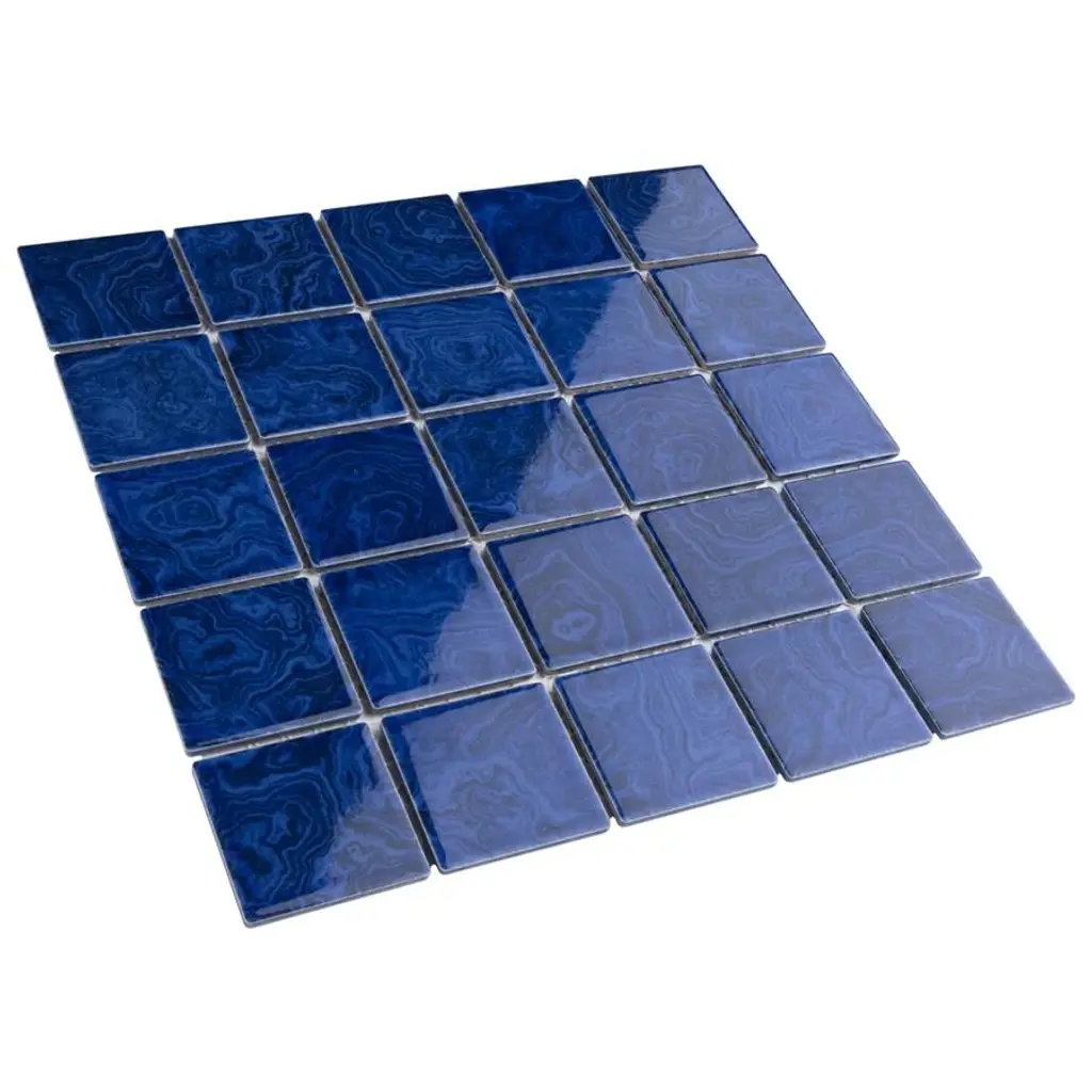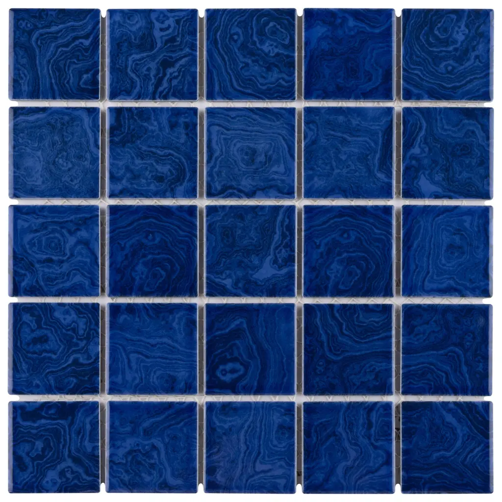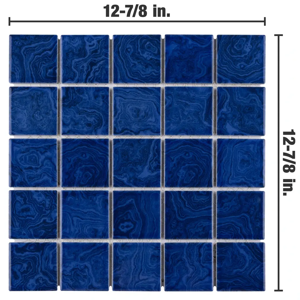 Reminiscent of mineralized geodes, our Resort Marine Blue Porcelain Mosaic Tile features varying shades of muted colbalt blue with a sapphire blue base glaze that has slate striations flowing throughout each chip, creating the look of geodes. An illusion of additional depth and dimension is created by a smooth and sleek glossy glaze that creates a unique design. Made of porcelain, this mosaic is best for walls or light traffic floors in both indoor and outdoor settings, including showers, powder room floors, and backsplashes. Tile is the better choice for your space. This tile is made from natural ingredients, making it a healthy choice as it is free from allergens, VOCs, formaldehyde and PVC. 10.2 square feet, 10 pieces per case. Case weight is 22 lbs. Grade 1, first-quality porcelain tile for floor and wall use 12 in. width x 12 in. length x 0.18 in. thick mesh-mounted mosaic Glazed, smooth finish with a high sheen and slight variation in tone PEI Rating III is suitable for medium-duty residential floors including kitchens, halls, corridors, balconies, terraces and areas used more often with normal footwear and small amounts of dirt Impervious tiles have a water absorption of less than 0.5% for indoor and outdoor use and are frost resistant This tile is not ADA approved for slip resistance with a DCOF value less than 0.42. Completely frost resistant for indoor or outdoor applications; use a latex-modified thinset for acceptable bond strength Please note: A sample of this product may be a partial piece cut from the full size tile in order to provide an affordable and convenient way for customers to judge the quality and finish of this item. Samples are not returnable.