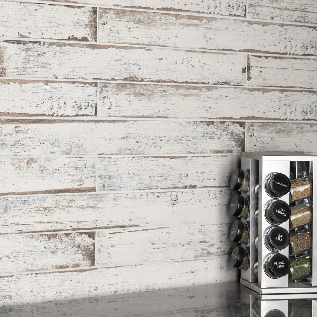 Replicating a wood look, our Retro Blanc Porcelain Floor and Wall Tile features a medium textured, matte finish, providing decorative appeal that adapts to a variety of stylistic contexts. Containing 12 different print variations that are randomly distributed throughout each case, this white rectangle tile offers a one-of-a-kind look. With its impervious, frost-resistant features, this tile is an ideal selection for both indoor and outdoor commercial and residential installations, including kitchens, bathrooms, backsplashes, showers, hallways, entryways, patios and fireplace facades. This tile is a perfect choice on its own or paired with other products in the Retro Collection. Tile is the better choice for your space! 11.52 square feet, 24 pieces per case. Case weight is 46.56 lbs. Grade 1, first-quality porcelain tile for floor and wall use 2.75 in. width x 23.5 in. length x 0.39 in. thick Glazed, medium textured finish with a low sheen and moderate variation in tone PEI Rating IV has high resistance to abrasion and is suitable for heavy-duty residential and commercial kitchens, hotels, exhibition and sales rooms with some dirt conditions Impervious tiles have a water absorption of less than 0.5% for indoor and outdoor use and are frost resistant This tile is ADA approved for slip resistance with a DCOF value of 0.42 or higher. Completely frost resistant for indoor or outdoor applications; use a latex-modified thinset for acceptable bond strength Please note: A sample of this product may be a partial piece cut from the full size tile in order to provide an affordable and convenient way for customers to judge the quality and finish of this item. Samples are not returnable.