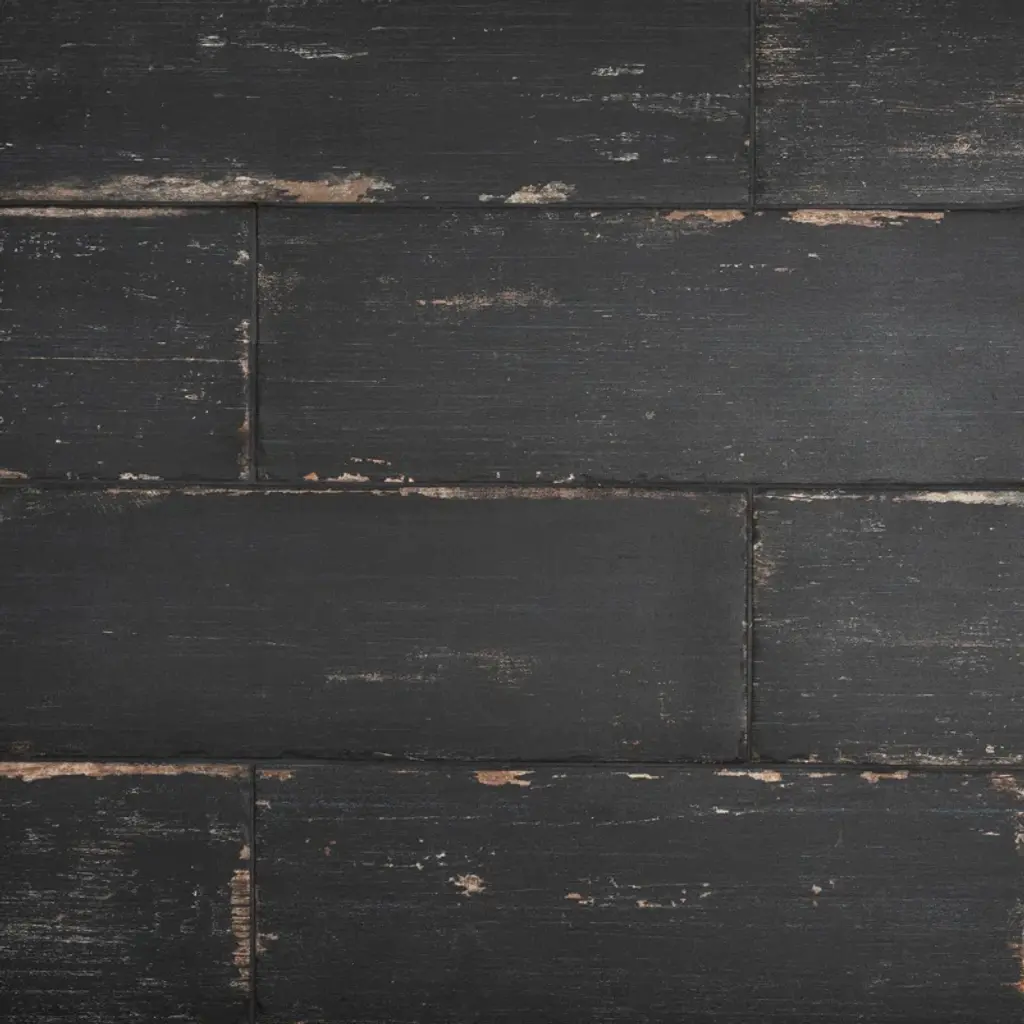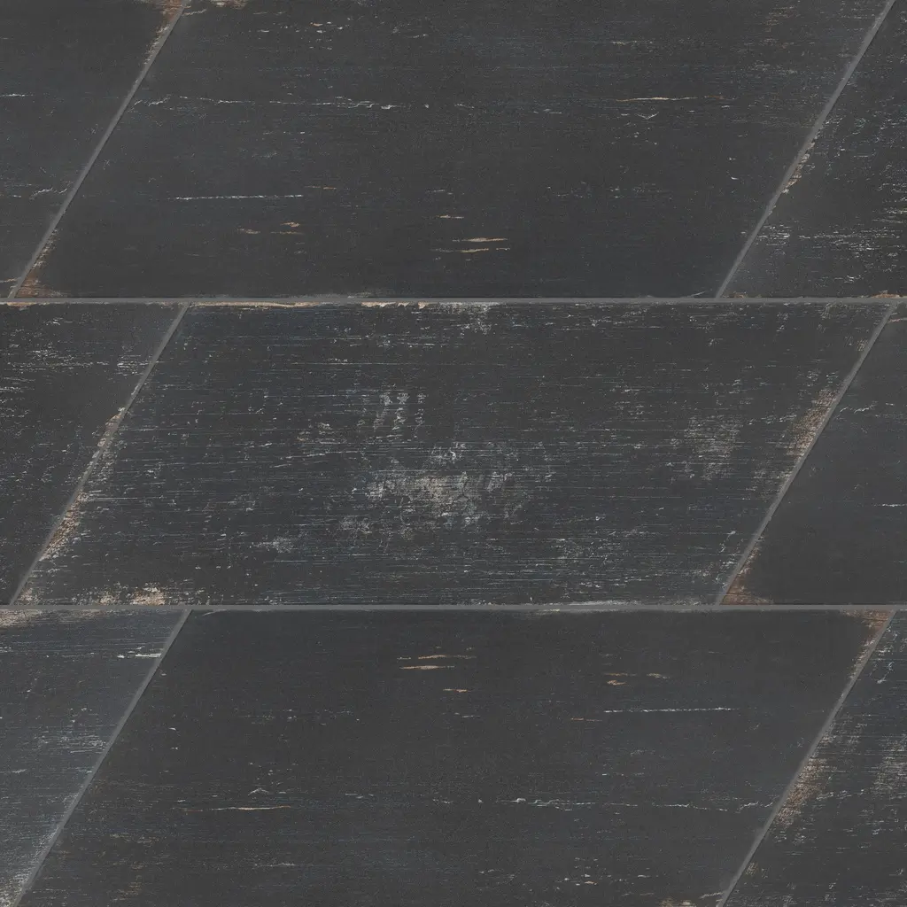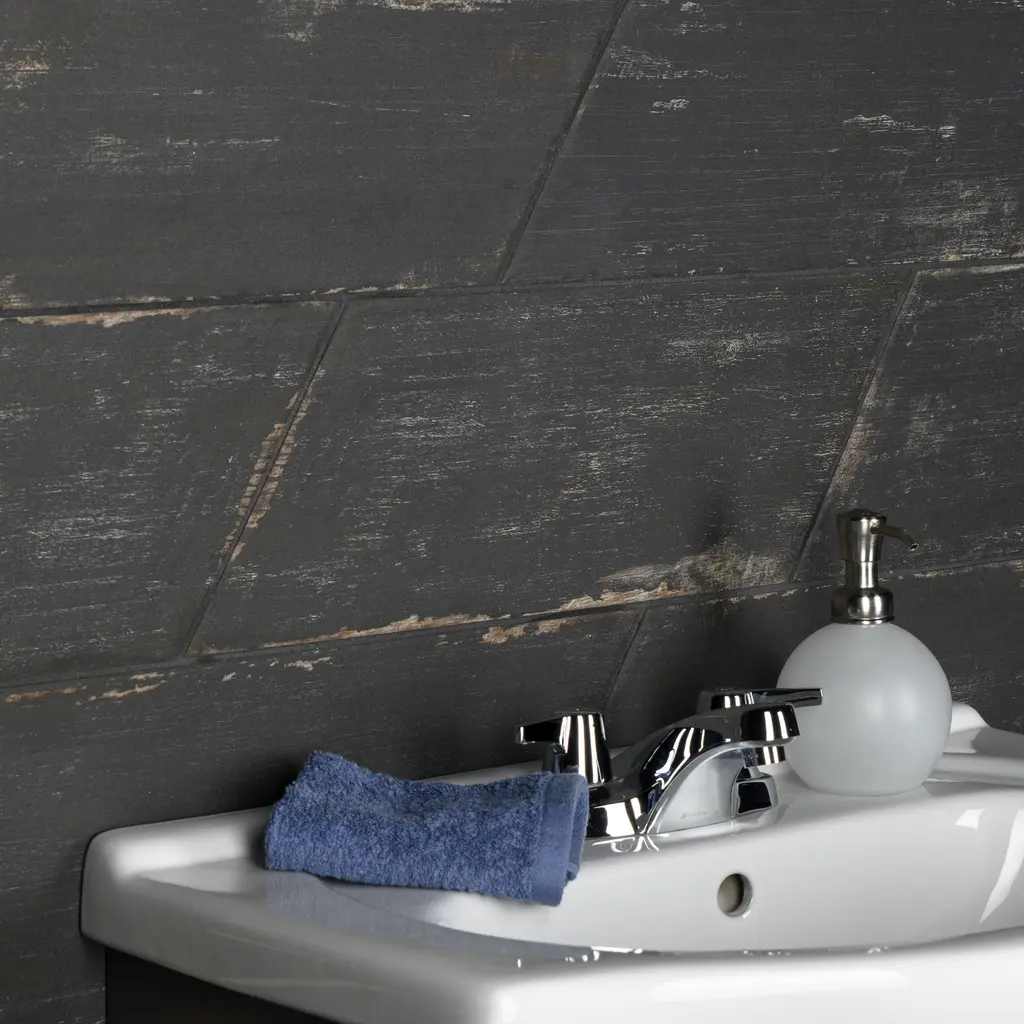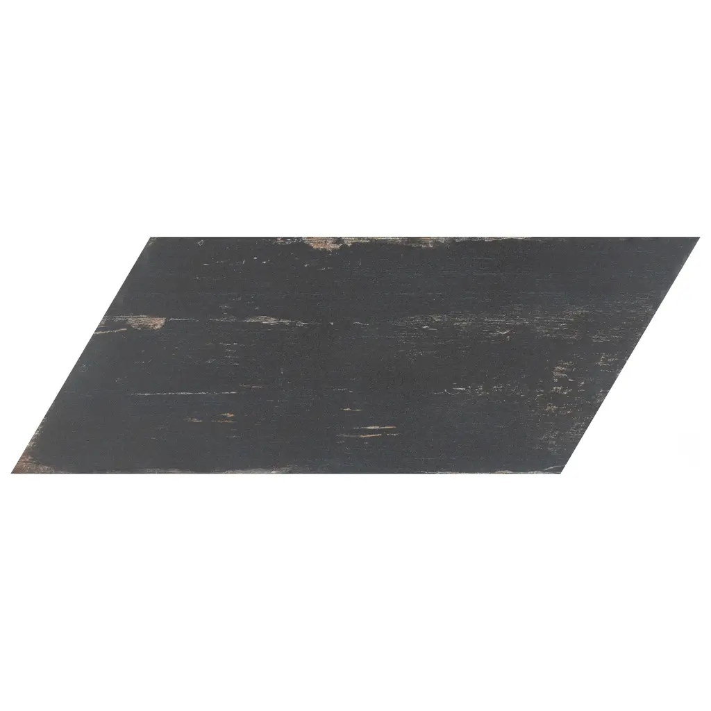 Replicating a wood look, our Retro Naveta Nero Porcelain Floor and Wall Tile features a medium textured, matte finish, providing decorative appeal that adapts to a variety of stylistic contexts. Containing 14 different print variations that are randomly distributed throughout each case, this black chevron tile offers a one-of-a-kind look. With its impervious, frost-resistant features, this tile is an ideal selection for both indoor and outdoor residential installations, including bathrooms, backsplashes, showers, hallways and fireplace facades. This tile is a perfect choice on its own or paired with other products in the Retro Collection. Tile is the better choice for your space! 11.05 square feet, 13 pieces per case. Case weight is 46.5 lbs. Grade 1, first-quality porcelain tile for floor and wall use 7 in. width x 16.38 in. length x 0.38 in. thick Glazed, medium textured finish with a low sheen and moderate variation in tone PEI Rating II is suitable for all interior walls and light foot traffic such as powder rooms Impervious tiles have a water absorption of less than 0.5% for indoor and outdoor use and are frost resistant This tile is ADA approved for slip resistance with a DCOF value of 0.42 or higher. Completely frost resistant for indoor or outdoor applications; use a latex-modified thinset for acceptable bond strength Please note: A sample of this product may be a partial piece cut from the full size tile in order to provide an affordable and convenient way for customers to judge the quality and finish of this item. Samples are not returnable.