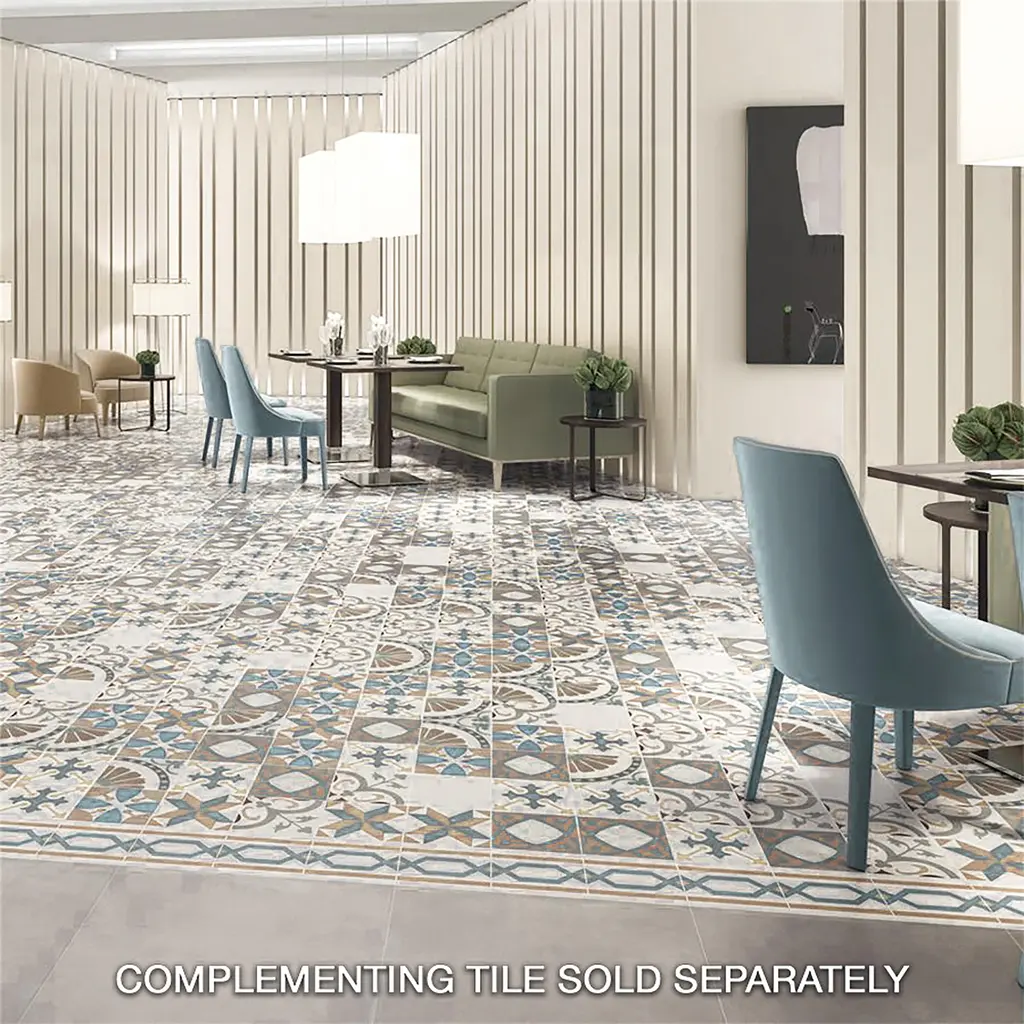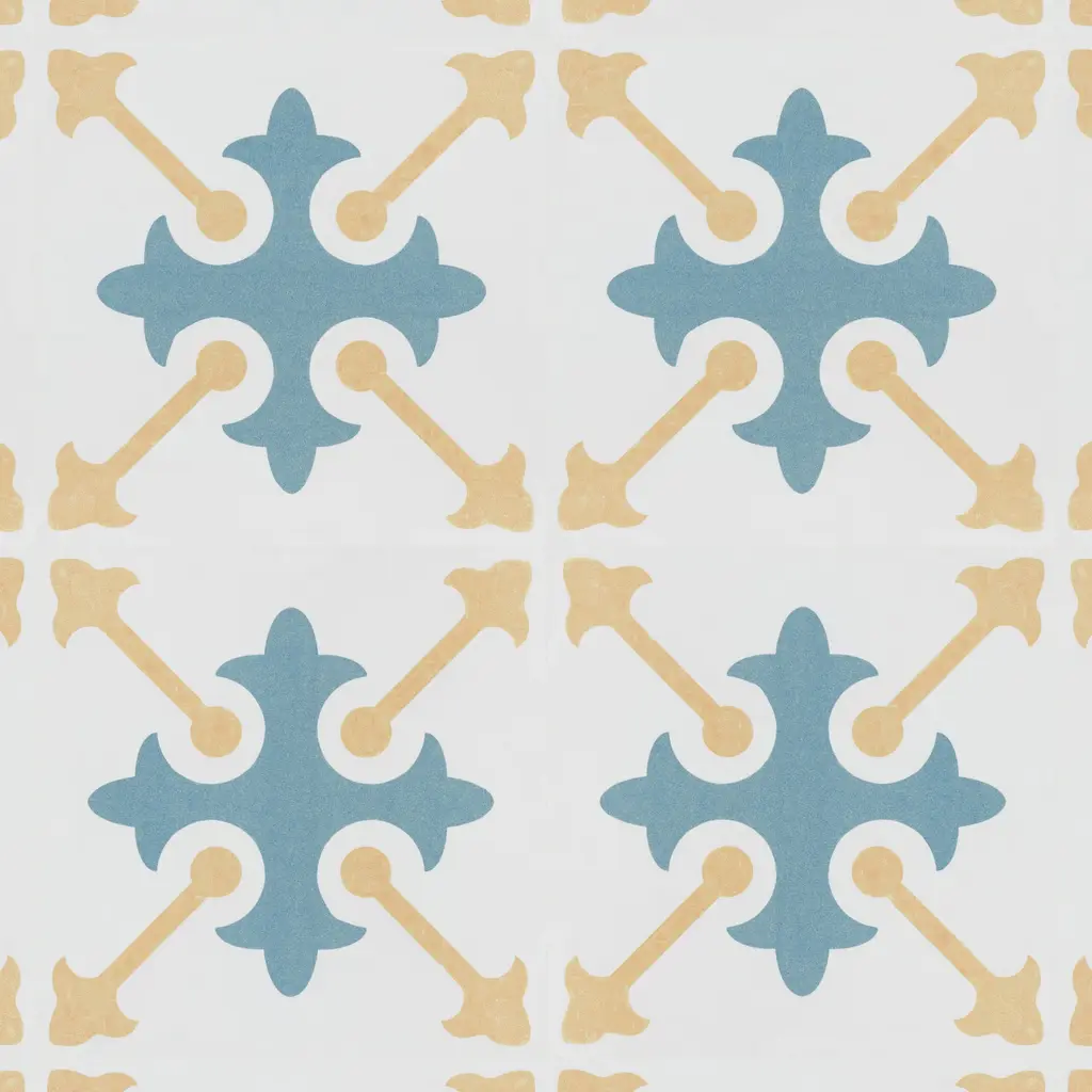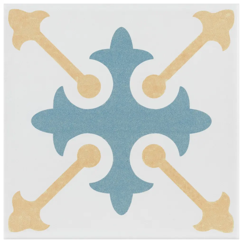 Our Revival Spectrum Ceramic Floor and Wall Tile transforms any space into a work of art through geometric and linear patterns that when laid out, intertwine to create captivating floral motifs. Composed of rich detail and a smooth surface texture, this floor and wall tile features varying shades of faded denim blue and pale yellow set on an off-white base glaze for additional visual dimension. Its durable and frost-resistant features make this an ideal choice for indoor and outdoor installations including kitchens, bathrooms, backsplashes, showers, entryways, patios and fireplace facades. This ceramic tile is a perfect choice on its own or paired with other product in the Revival Collection. Tile is the better choice for your space. This tile is made from natural ingredients, making it a healthy choice as it is free from allergens, VOCs, formaldehyde and PVC. 10.75 square feet, 25 pieces per case. Case weight is 27.5 lbs. Grade 1, first-quality ceramic tile for floor and wall use 7.75 in. width x 7.75 in. length x 0.25 in. thick Glazed, slightly textured finish with a low sheen and slight variation in tone PEI Rating IV has high resistance to abrasion and is suitable for heavy-duty residential and commercial kitchens, hotels, exhibition and sales rooms with some dirt conditions Vitreous tiles have water absorption of more than 0.5% but less than 3% for indoor use and some outdoor applications and are frost resistant This tile is ADA approved for slip resistance with a DCOF value of 0.42 or higher. Completely frost resistant for indoor or outdoor applications; use a latex-modified thinset for acceptable bond strength Please note: A sample of this product may be a partial piece cut from the full size tile in order to provide an affordable and convenient way for customers to judge the quality and finish of this item. Samples are not returnable.