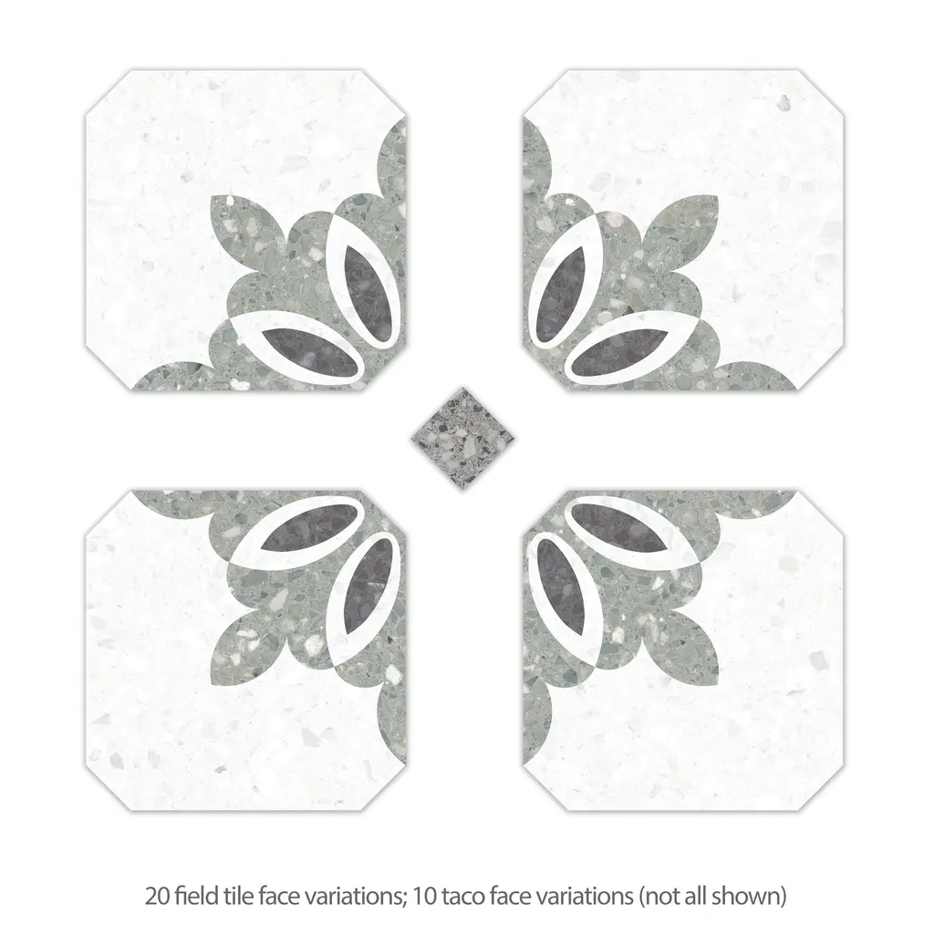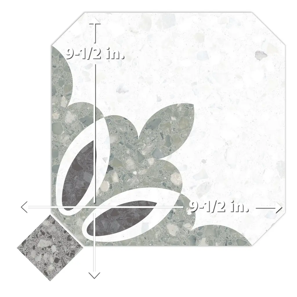 Replicating a terrazzo look, our Riviera Octagon Verde with Taco Nero Porcelain Floor and Wall Tile features a slightly textured, matte finish, providing decorative appeal that adapts to a variety of stylistic contexts. Containing 30 different print variations that are randomly distributed throughout each case, this white specialty tile offers a one-of-a-kind look. With its impervious, frost-resistant features, this tile is an ideal selection for a variety of spaces including indoor and outdoor residential installations, kitchens, bathrooms, backsplashes, showers, hallways, pools and fireplace facades. This tile is a perfect choice on its own or with other products in the Merola Tile, Riviera Collection. To ensure optimal results, please consult with your installer and review the product specifications to confirm that this tile meets the specific needs of your project.