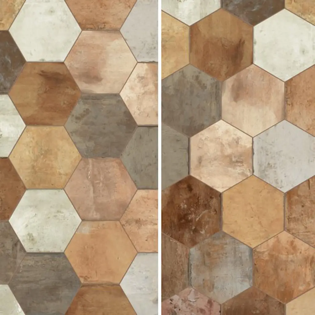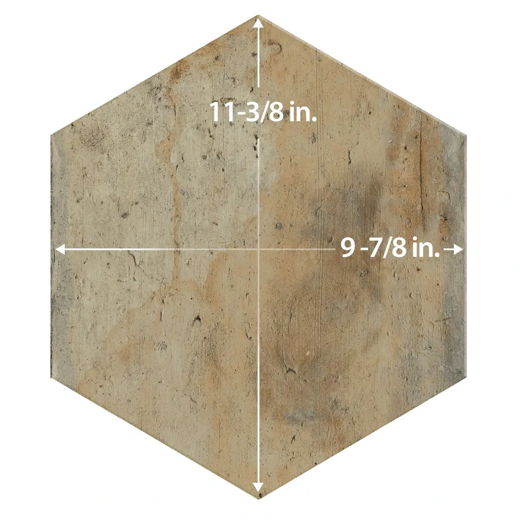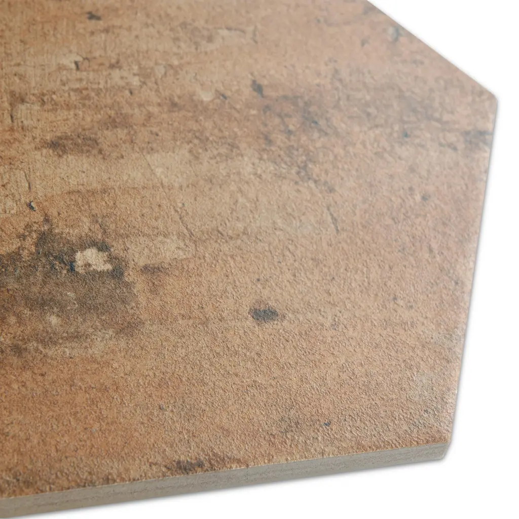 Replicating a terra cotta look, our Terre Hex Rosso Porcelain Floor and Wall Tile features a slightly textured, matte finish, providing decorative appeal that adapts to a variety of stylistic contexts. Containing 66 different print variations that are randomly distributed throughout each case, this brown hexagon tile offers a one-of-a-kind look. With its impervious, frost-resistant features, this tile is an ideal selection for both indoor and outdoor residential installations, including kitchens, bathrooms, backsplashes, showers, hallways and fireplace facades. This tile is a perfect choice on its own or paired with other products in the Terre Collection. Tile is the better choice for your space! 10.2 square feet, 17 pieces per case. Case weight is 48 lbs. Grade 1, first-quality porcelain tile for floor and wall use 9.88 in. width x 11.38 in. length x 0.39 in. thick Glazed, slightly textured finish with a low sheen and substantial variation in tone PEI Rating III is suitable for medium-duty residential floors including kitchens, halls, corridors, balconies, terraces and areas used more often with normal footwear and small amounts of dirt Impervious tiles have a water absorption of less than 0.5% for indoor and outdoor use and are frost resistant This tile is ADA approved for slip resistance with a DCOF value of 0.42 or higher. Completely frost resistant for indoor or outdoor applications; use a latex-modified thinset for acceptable bond strength Please note: Samples are not returnable