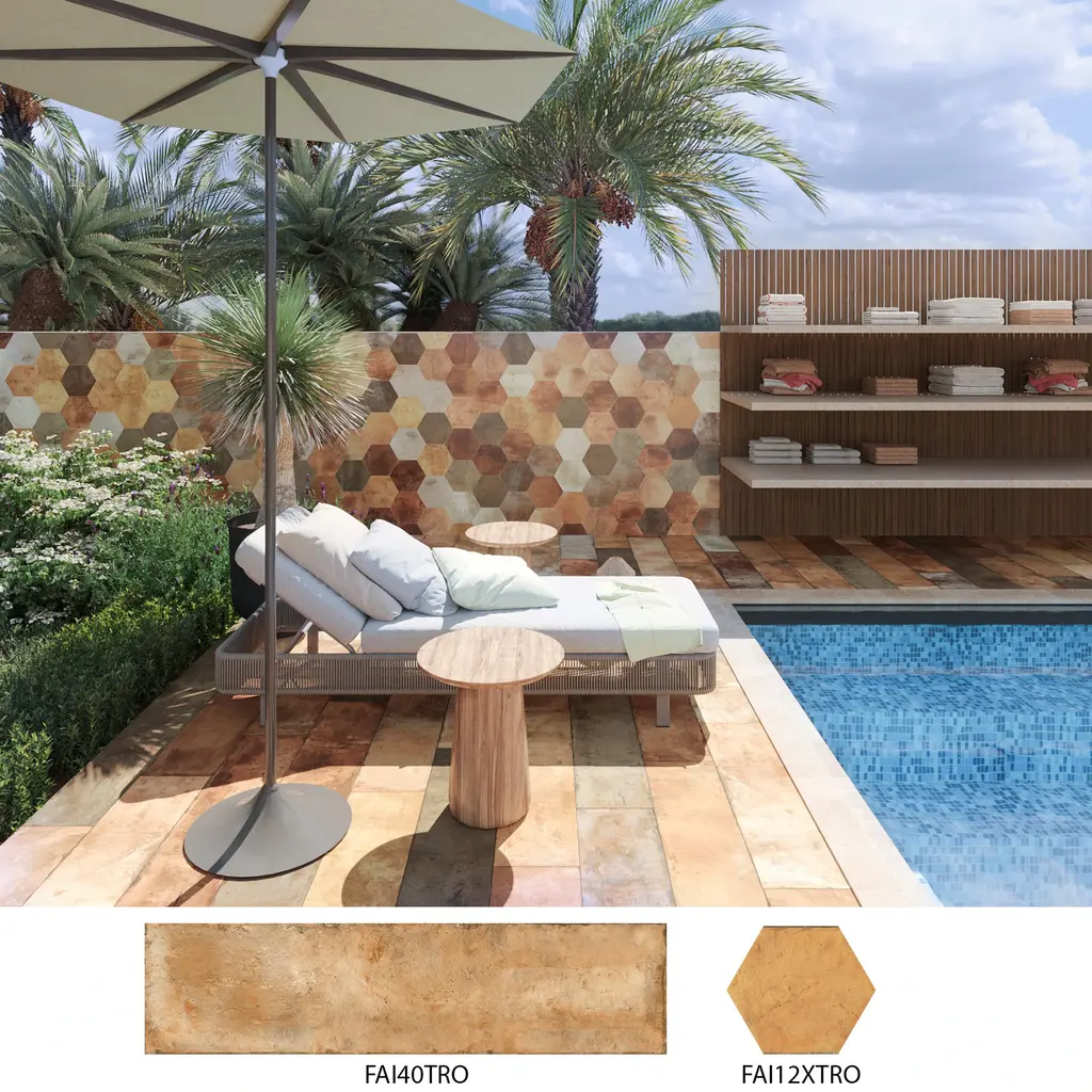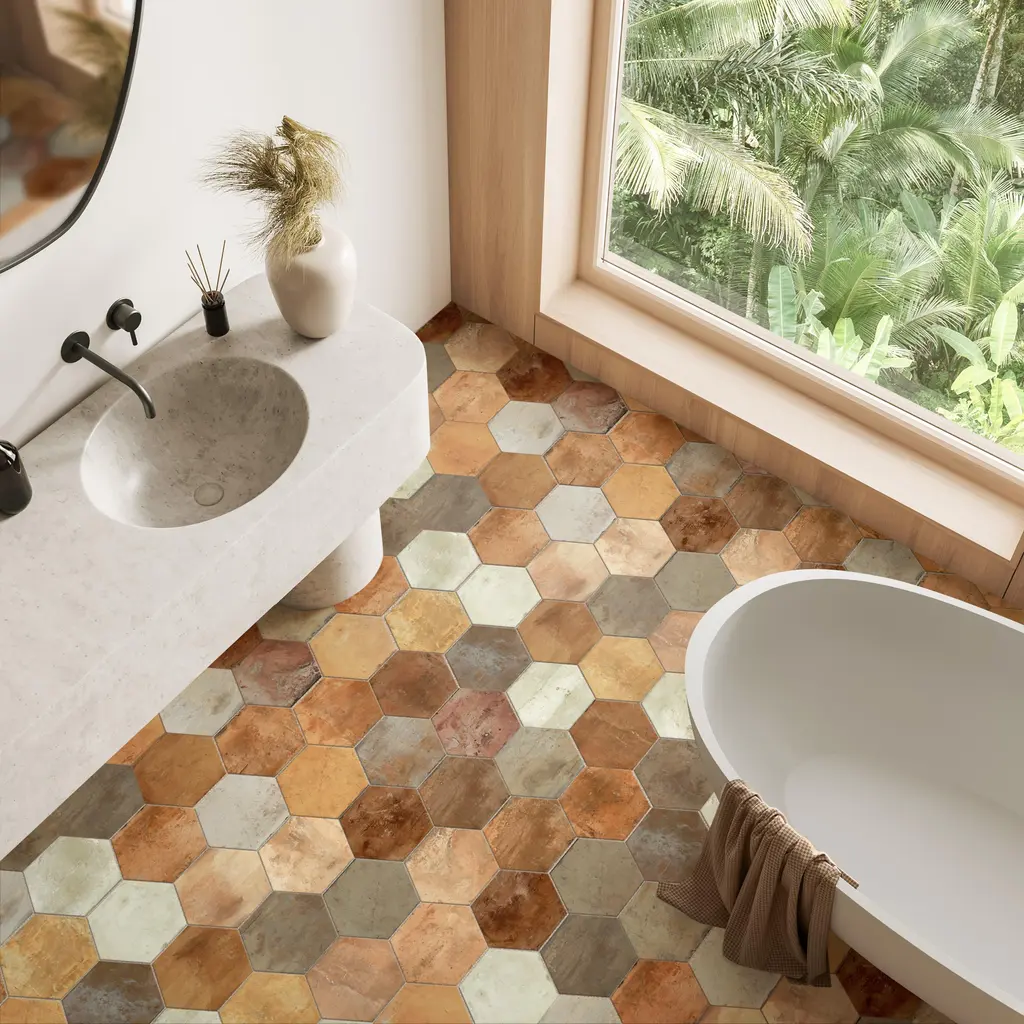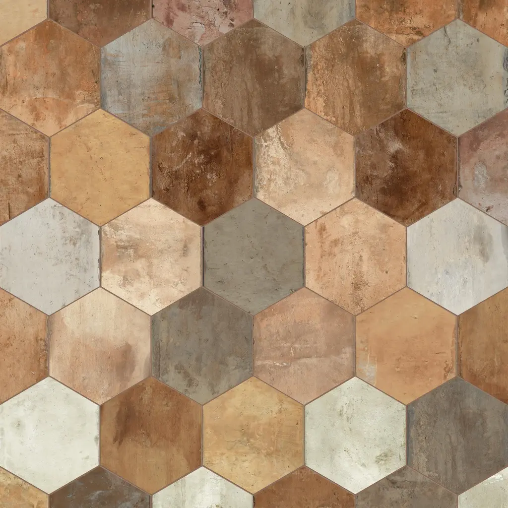 Replicating a terra cotta look, our Terre Hex Rosso Porcelain Floor and Wall Tile features a slightly textured, matte finish, providing decorative appeal that adapts to a variety of stylistic contexts. Containing 66 different print variations that are randomly distributed throughout each case, this brown hexagon tile offers a one-of-a-kind look. With its impervious, frost-resistant features, this tile is an ideal selection for both indoor and outdoor residential installations, including kitchens, bathrooms, backsplashes, showers, hallways and fireplace facades. This tile is a perfect choice on its own or paired with other products in the Terre Collection. Tile is the better choice for your space! 10.2 square feet, 17 pieces per case. Case weight is 48 lbs. Grade 1, first-quality porcelain tile for floor and wall use 9.88 in. width x 11.38 in. length x 0.39 in. thick Glazed, slightly textured finish with a low sheen and substantial variation in tone PEI Rating III is suitable for medium-duty residential floors including kitchens, halls, corridors, balconies, terraces and areas used more often with normal footwear and small amounts of dirt Impervious tiles have a water absorption of less than 0.5% for indoor and outdoor use and are frost resistant This tile is ADA approved for slip resistance with a DCOF value of 0.42 or higher. Completely frost resistant for indoor or outdoor applications; use a latex-modified thinset for acceptable bond strength Please note: Samples are not returnable