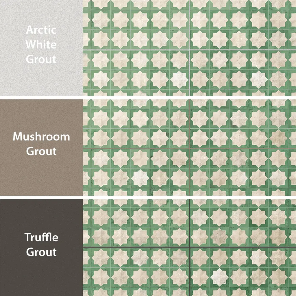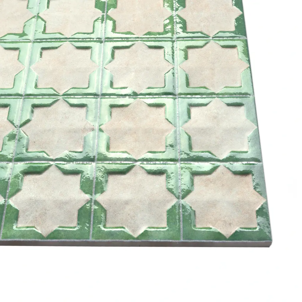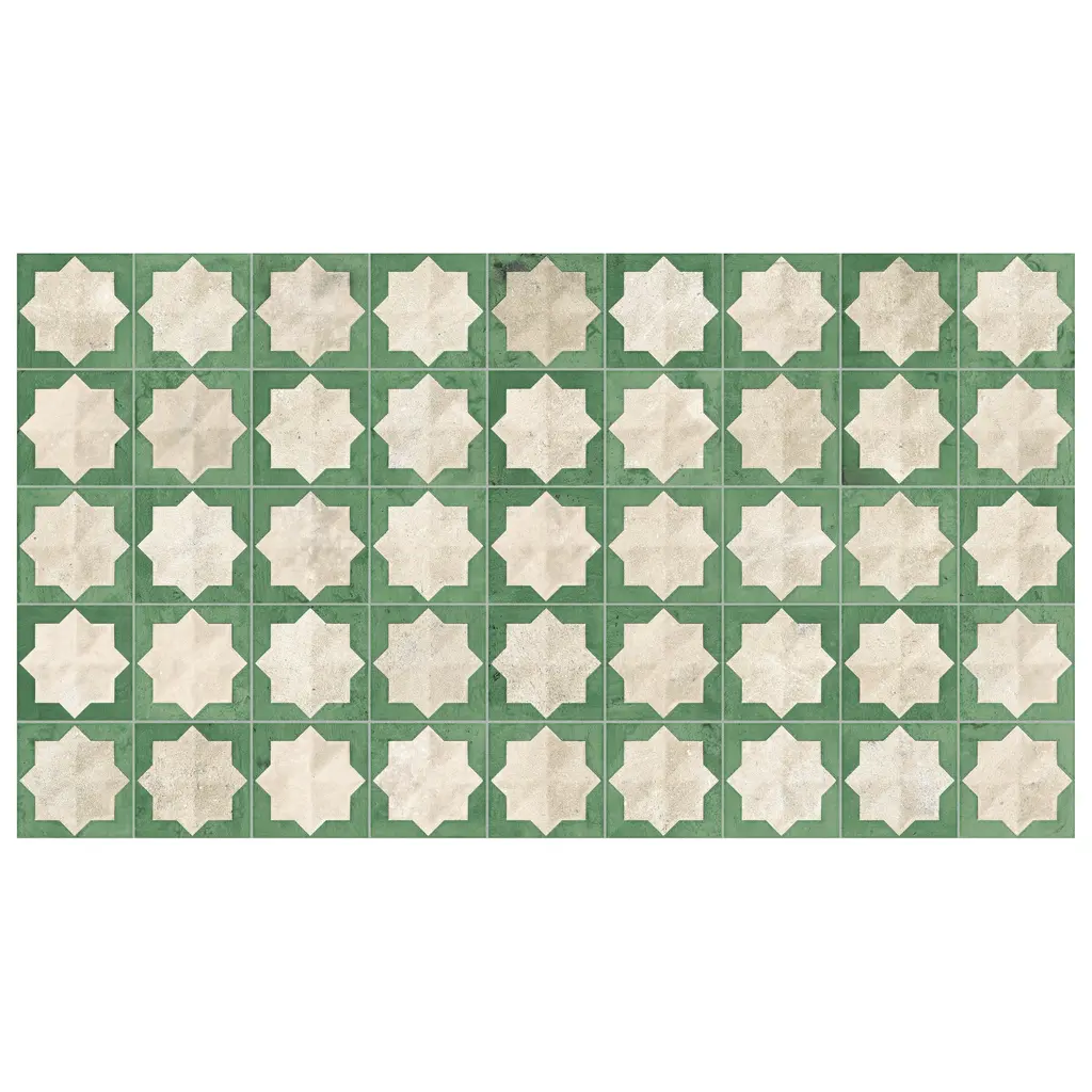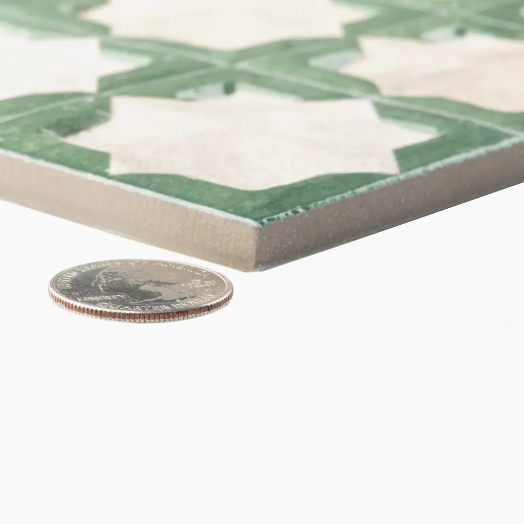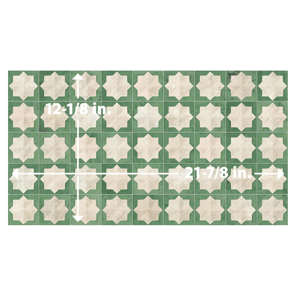 Replicating a terra cotta look, our Tetuan Astre Arena Emerald Porcelain Wall Tile features a mixed textured finish, providing decorative appeal that adapts to a variety of stylistic contexts. Capture the essence of Moroccan art and architecture with the Tetuan Porcelain Tile Collection, featuring a matte-gloss contrast, Zellige-inspired star wall tiles and matte terracotta floor tiles, both with the latest glazing technologies for a dual-textured experience. Containing 8 different print variations that are randomly distributed throughout each case, this beige rectangle tile offers a one-of-a-kind look. With its impervious, frost-resistant features, this tile is an ideal selection for both indoor and outdoor commercial and residential installations, including kitchens, bathrooms, backsplashes, showers, hallways and fireplace facades. This tile is a perfect choice on its own or paired with other products in the Tetuan Collection. Tile is the better choice for your space! 13.02 square feet, 7 pieces per case. Case weight is 60.6 lbs. Grade 1, first-quality porcelain tile for wall use 12.13 in. width x 21.88 in. length x 0.35 in. thick Glazed, mixed texture with a mixed finish and slight variation in tone PEI Rating 0 is suitable for wall use only Impervious tiles have a water absorption of less than 0.5% for indoor and outdoor use and are frost resistant DCOF value is not available for this product. Please reference the PEI and MOHS rating for installation. Completely frost resistant for indoor or outdoor applications; use a latex-modified thinset for acceptable bond strength Please note: A sample of this product may be a partial piece cut from the full size tile in order to provide an affordable and convenient way for customers to judge the quality and finish of this item. Samples are not returnable.