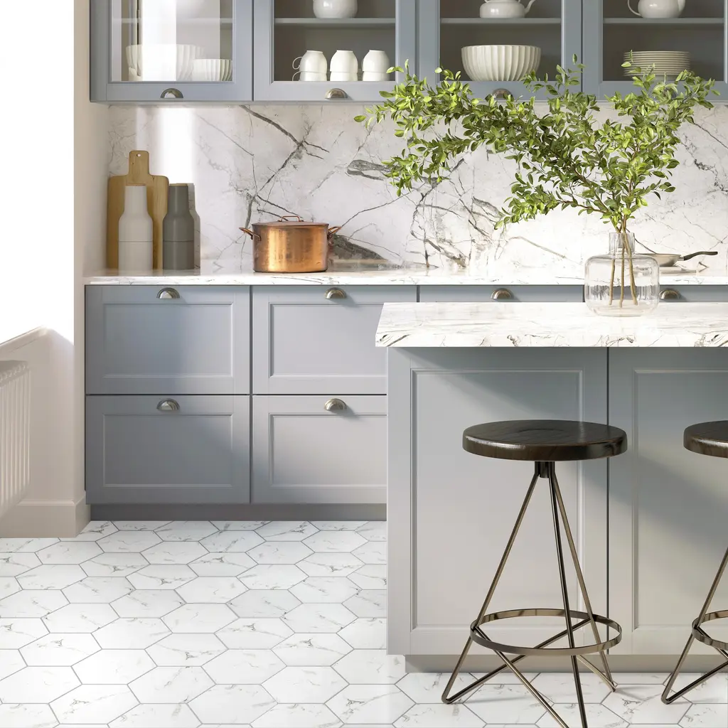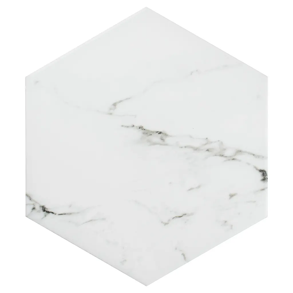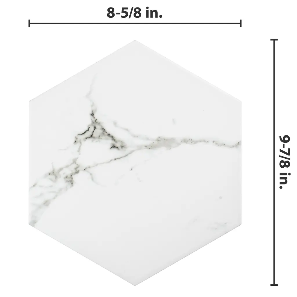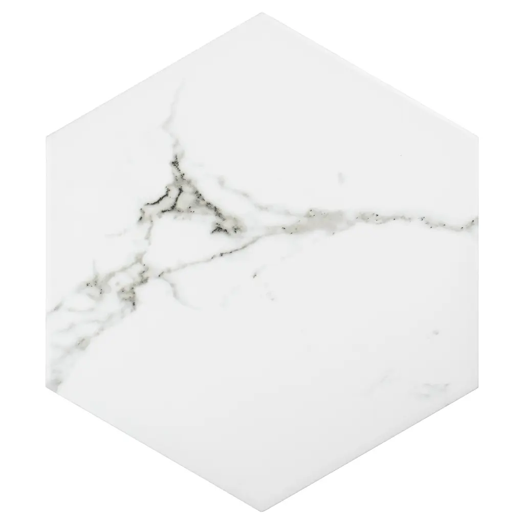 Capturing the appearance of a marble look, our Timeless Calacatta Hex Porcelain Floor and Wall Tile features a smooth, matte finish, providing decorative appeal that adapts to a variety of stylistic contexts. Containing 47 different print variations that are randomly distributed throughout each case, this white hexagon tile offers a one-of-a-kind look. With its impervious, frost-resistant features, this tile is an ideal selection for a variety of spaces including indoor and outdoor commercial and residential installations, kitchens, bathrooms, backsplashes, showers, hallways, entryways, patios, pools and fireplace facades. This tile is a perfect choice on its own or with other products in the Merola Tile, Timeless Collection. To ensure optimal results, please consult with your installer and review the product specifications to confirm that this tile meets the specific needs of your project.