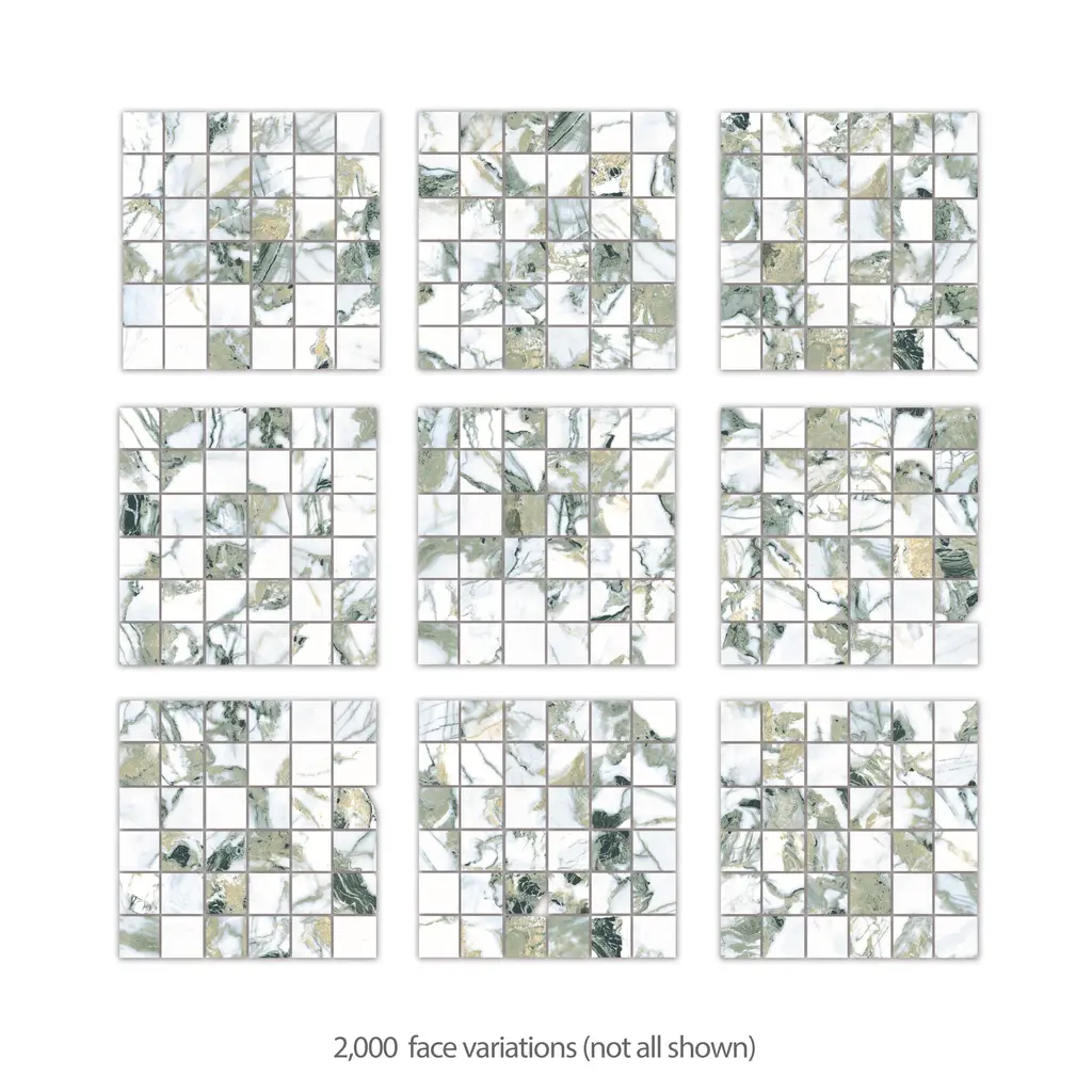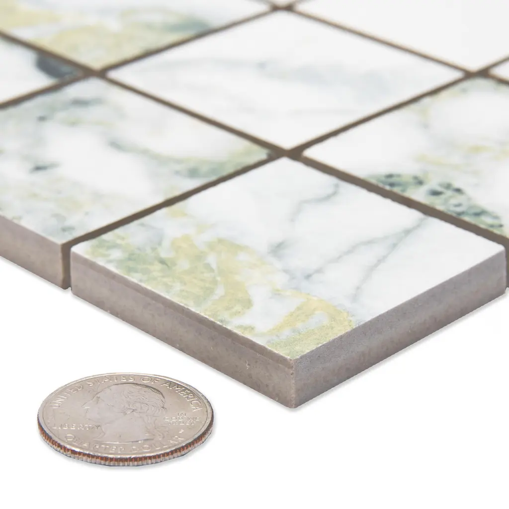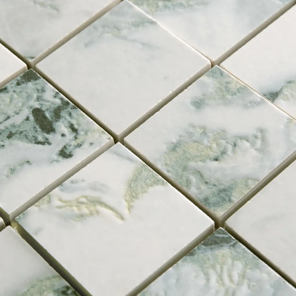Capturing the appearance of a marble look, our Touche 2 in. Square Jade Porcelain Floor and Wall Tile features a slightly textured, satin finish, providing decorative appeal that adapts to a variety of stylistic contexts. Inspired by high-end luxury marble, the Touche Collection captures porcelain's durability and realistic undulation, offering a bold, dramatic aesthetic with rectified edges, creating a timeless, sophisticated ambiance for serene, opulent experiences in any setting. Containing 2 different print variations that are randomly distributed throughout each case, this green square tile offers a one-of-a-kind look. With its impervious, frost-resistant features, this mosaic is an ideal selection for a variety of spaces including indoor and outdoor commercial and residential installations, kitchens, bathrooms, backsplashes, showers, hallways, entryways, patios and fireplace facades. This tile is a perfect choice on its own or with other products in the Merola Tile, Touche Collection. To ensure optimal results, please consult with your installer and review the product specifications to confirm that this tile meets the specific needs of your project.