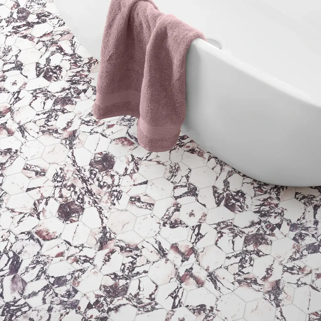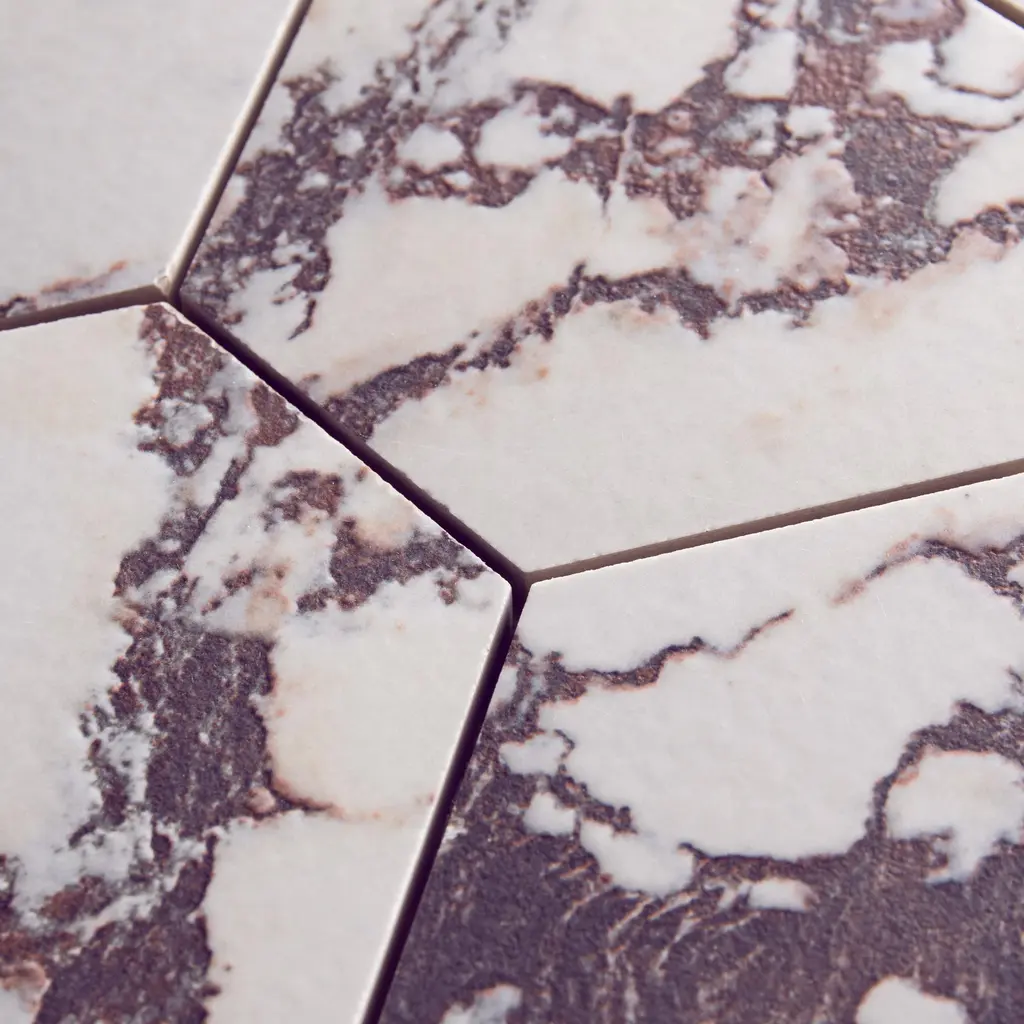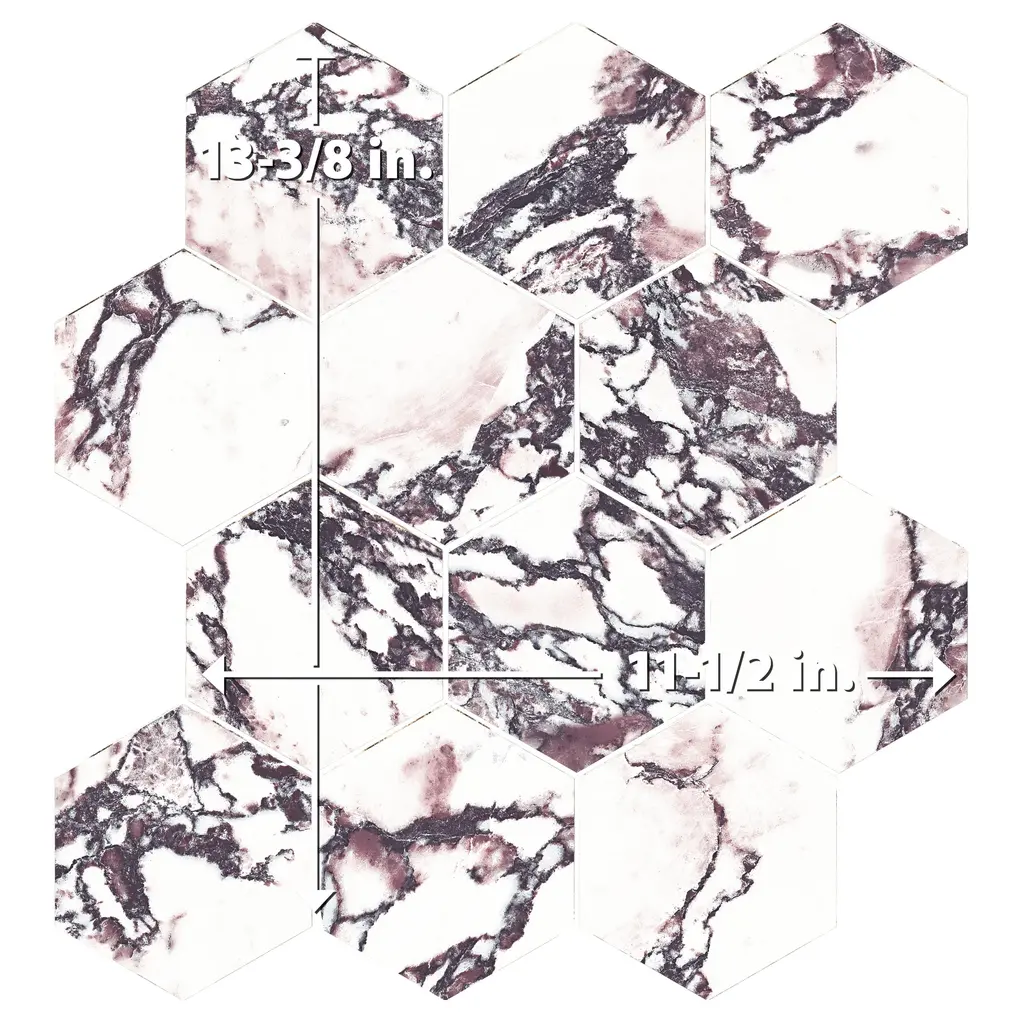 Capturing the appearance of a marble look, our Touche 4 in. Hex Rubis Porcelain Floor and Wall Tile features a slightly textured, satin finish, providing decorative appeal that adapts to a variety of stylistic contexts. Inspired by high-end luxury marble, the Touche Collection captures porcelain's durability and realistic undulation, offering a bold, dramatic aesthetic with rectified edges, creating a timeless, sophisticated ambiance for serene, opulent experiences in any setting. Containing 2 different print variations that are randomly distributed throughout each case, this red hexagon tile offers a one-of-a-kind look. With its impervious, frost-resistant features, this mosaic is an ideal selection for a variety of spaces including indoor and outdoor commercial and residential installations, kitchens, bathrooms, backsplashes, showers, hallways, entryways, patios and fireplace facades. This tile is a perfect choice on its own or with other products in the Merola Tile, Touche Collection. To ensure optimal results, please consult with your installer and review the product specifications to confirm that this tile meets the specific needs of your project.