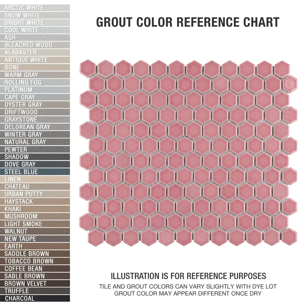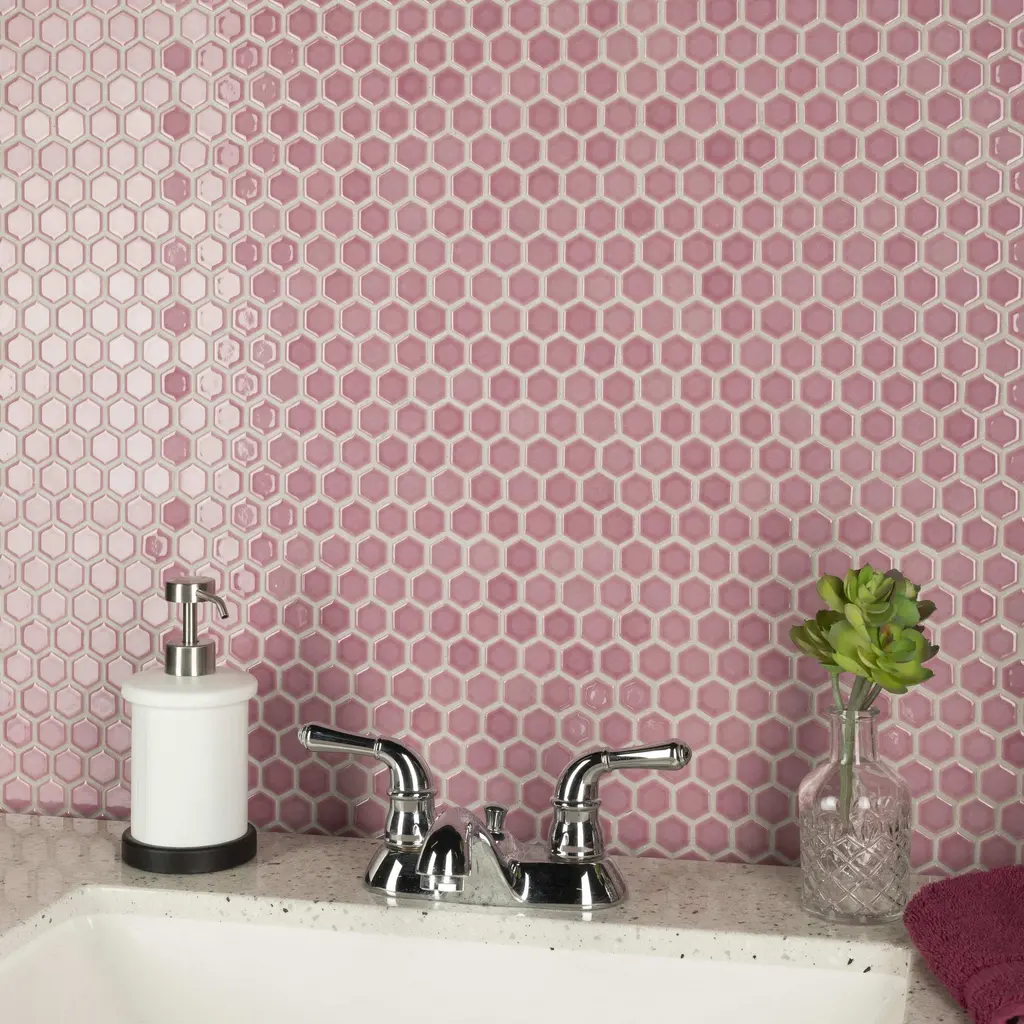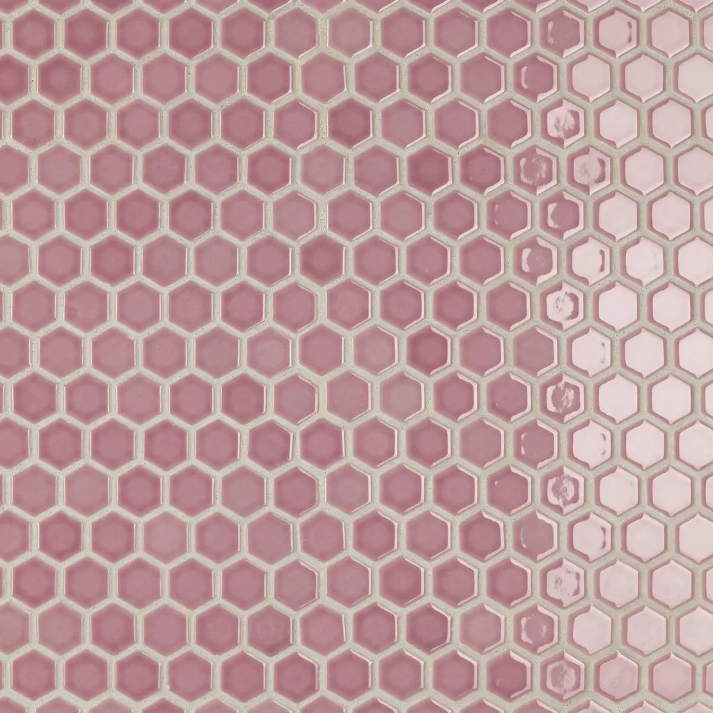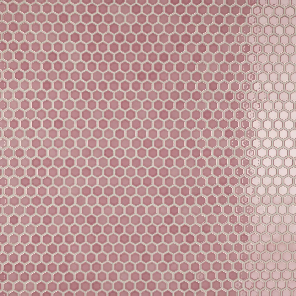 Lending a unique touch of color, our Tribeca 1 in. Hex Glossy Blush Porcelain Mosaic Floor and Wall Tile instantly elevates spaces through a refreshing dose of vivid geometric design. As an innovative twist on the classic hexagon, this mosaic is comprised of hexagonal chips in blush pink tones with a smooth surface. Glossy hexagons are arranged on an interlocking mesh to create a seamless installation. This minimalistic geometric porcelain mosaic is unique yet simplistic enough to integrate into any design, ranging from traditional style renovations to modern home projects. Its impervious and frost-resistant features make this an ideal tile for both indoor and outdoor residential use, including backsplashes, bathrooms, showers and kitchens. This tile is a perfect choice on its own or paired with other products in the Tribeca Hex Mosaic Collection. Tile is the better choice for your space. This tile is made from natural ingredients, making it a healthy choice as it is free from allergens, VOCs, formaldehyde and PVC. 8.6 square feet, 10 pieces per case. Case weight is 17.81 lbs. Grade 1, first-quality porcelain tile for floor and wall use 10.25 in. width x 11.88 in. length x 0.23 in. thick mesh-mounted mosaic Glazed, smooth finish with a high sheen and slight variation in tone PEI Rating II is suitable for all interior walls and light foot traffic such as powder rooms Impervious tiles have a water absorption of less than 0.5% for indoor and outdoor use and are frost resistant This tile has a COF wet rating less than or equal to 0.50 and is considered to have a marginally low skid resistance. This tile is not ADA approved for slip resistance. Completely frost resistant for indoor or outdoor applications; use a latex-modified thinset for acceptable bond strength Please note: A sample of this product may be a partial piece cut from the full size tile in order to provide an affordable and convenient way for customers to judge the quality and finish of this item. Samples are not returnable.