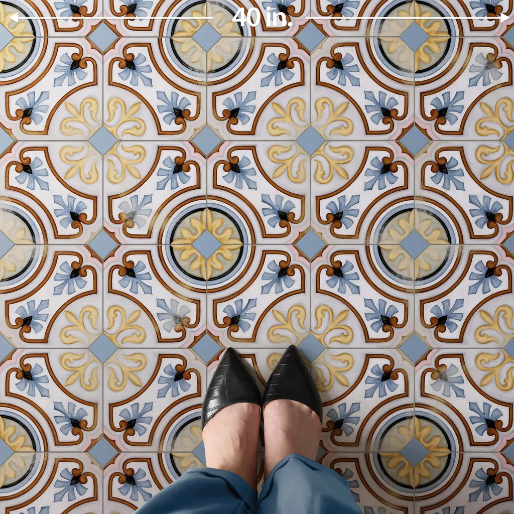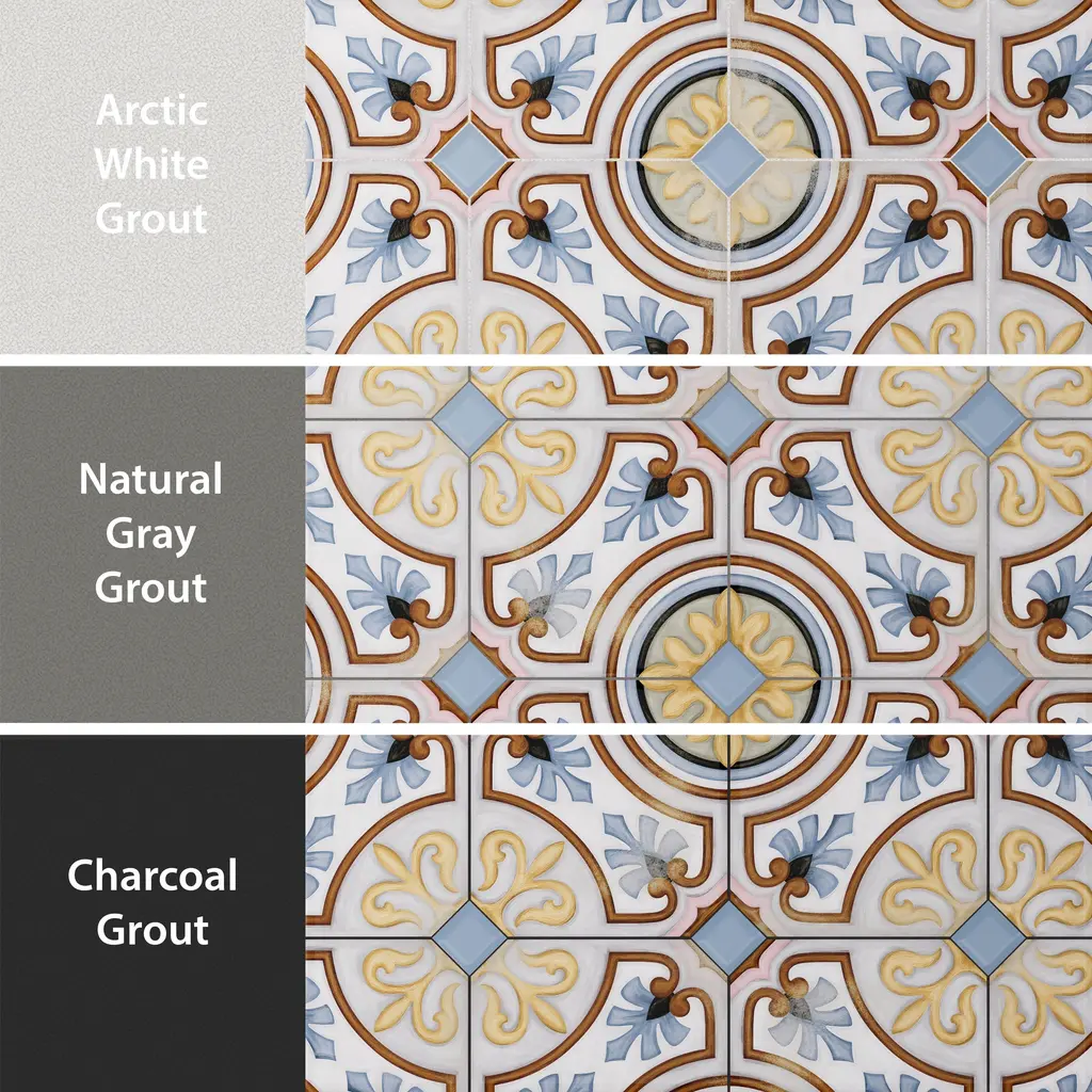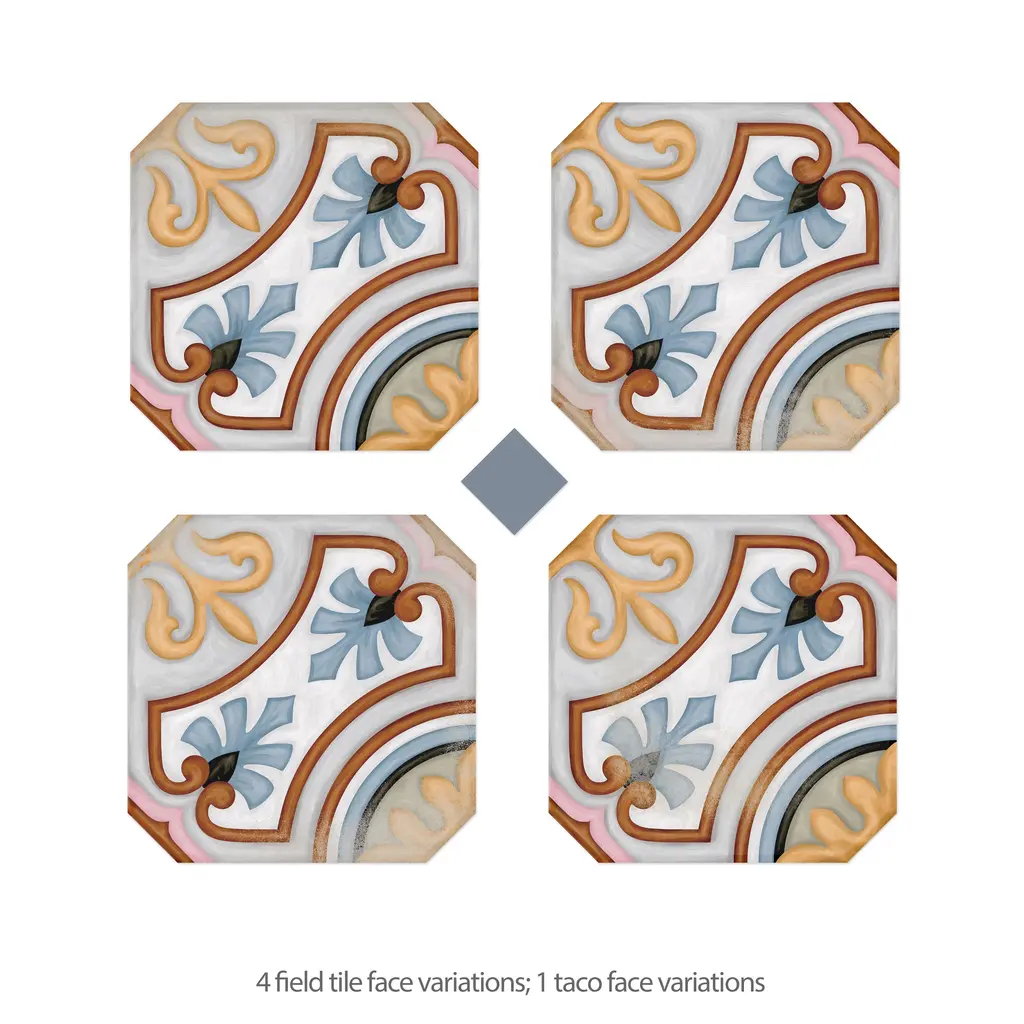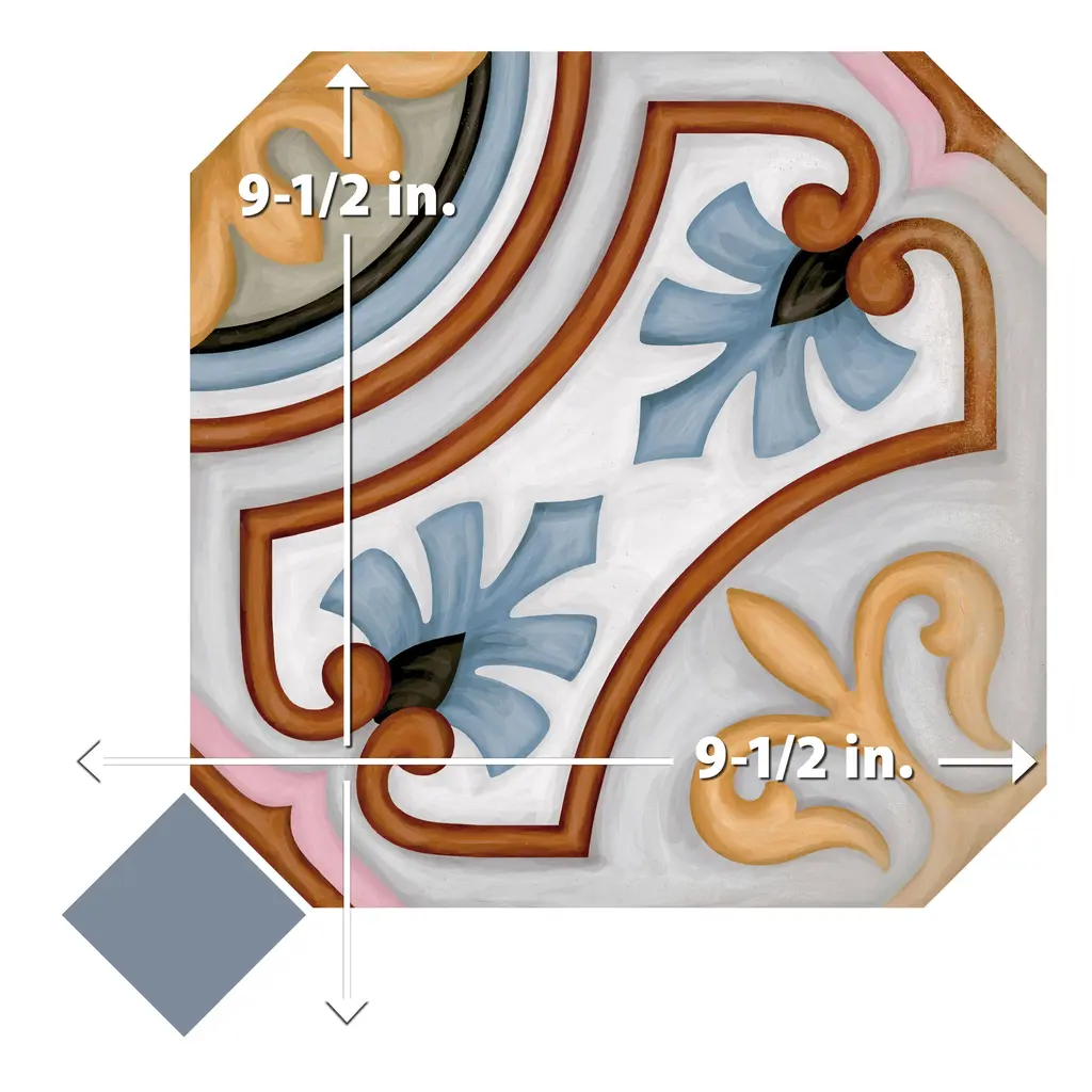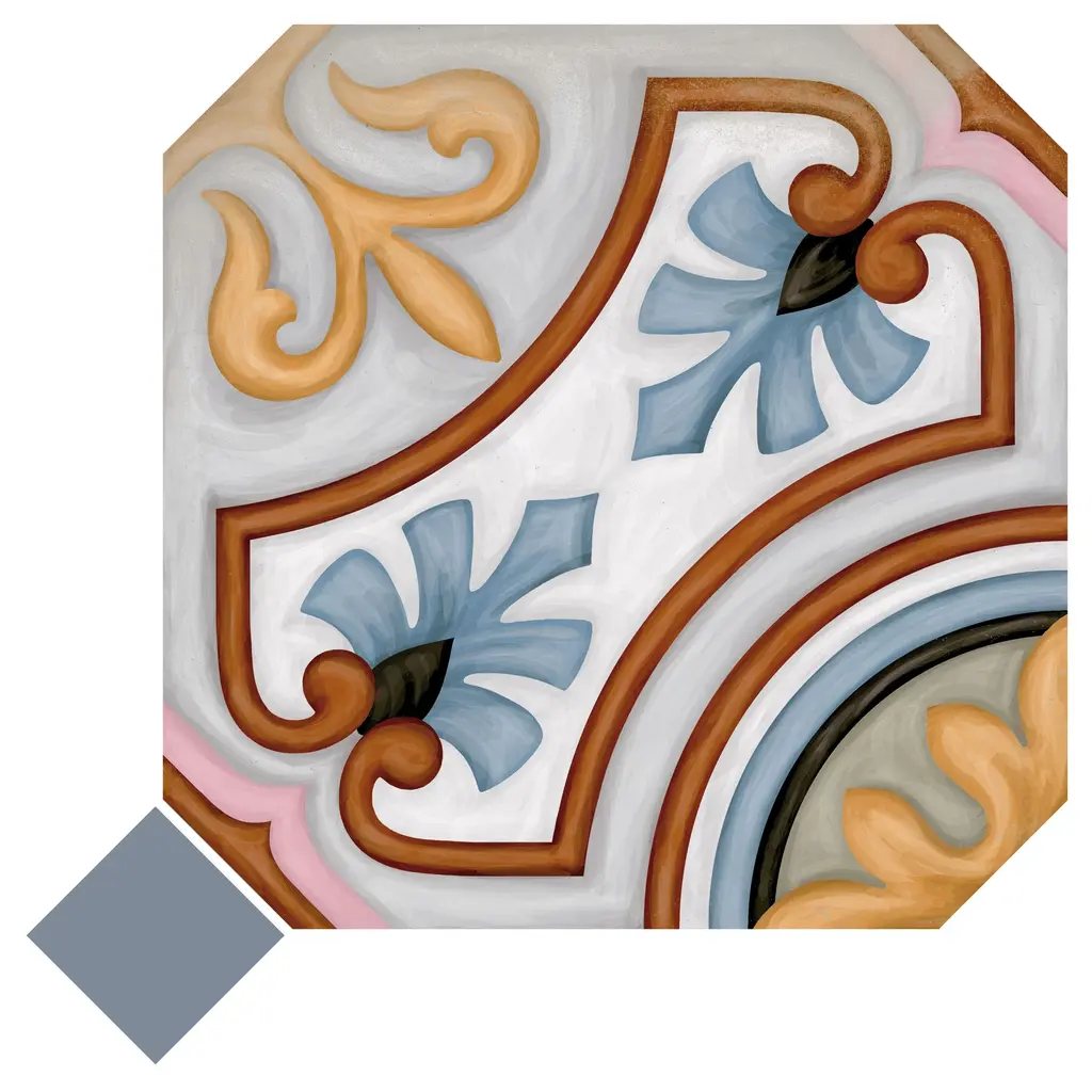 Inspired by a hand painted look, our Vaudeville Octagon Deco Diglas with Taco Azzuro Porcelain Floor and Wall Tile features a slightly textured, matte finish, providing decorative appeal that adapts to a variety of stylistic contexts. Inspired by Victorian-era Vaudeville, these geometric octagon tiles with a matte finish and customizable vibrant colors capture timeless elegance and vintage charm, creating a sophisticated, lively space reminiscent of the colorful variety acts of Vaudeville theatres. Containing 5 different print variations that are randomly distributed throughout each case, this gray specialty tile offers a one-of-a-kind look. With its impervious, frost-resistant features, this tile is an ideal selection for a variety of spaces including indoor and outdoor residential installations, kitchens, bathrooms, backsplashes, showers, hallways, pools and fireplace facades. This tile is a perfect choice on its own or with other products in the Merola Tile, Vaudeville Collection. To ensure optimal results, please consult with your installer and review the product specifications to confirm that this tile meets the specific needs of your project.