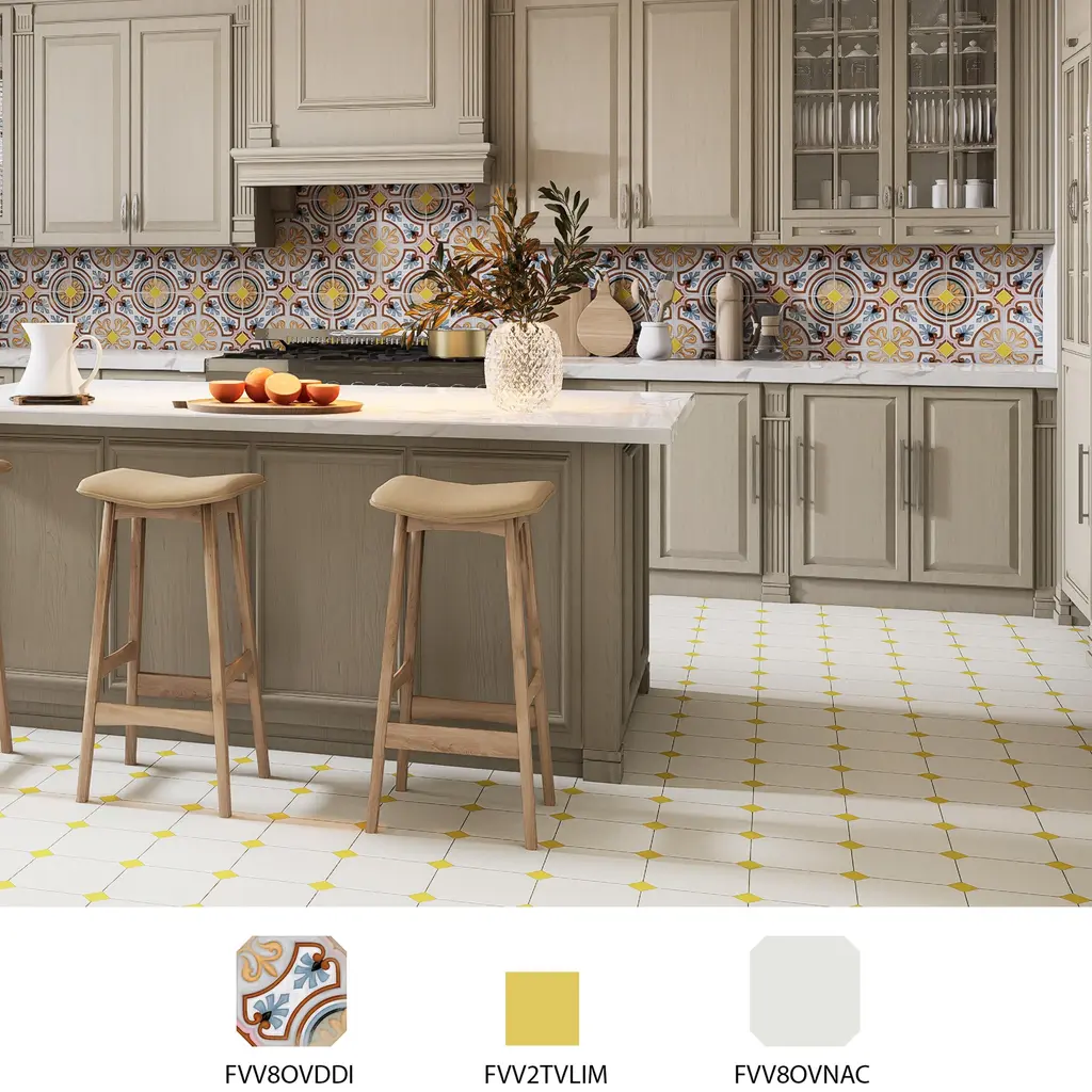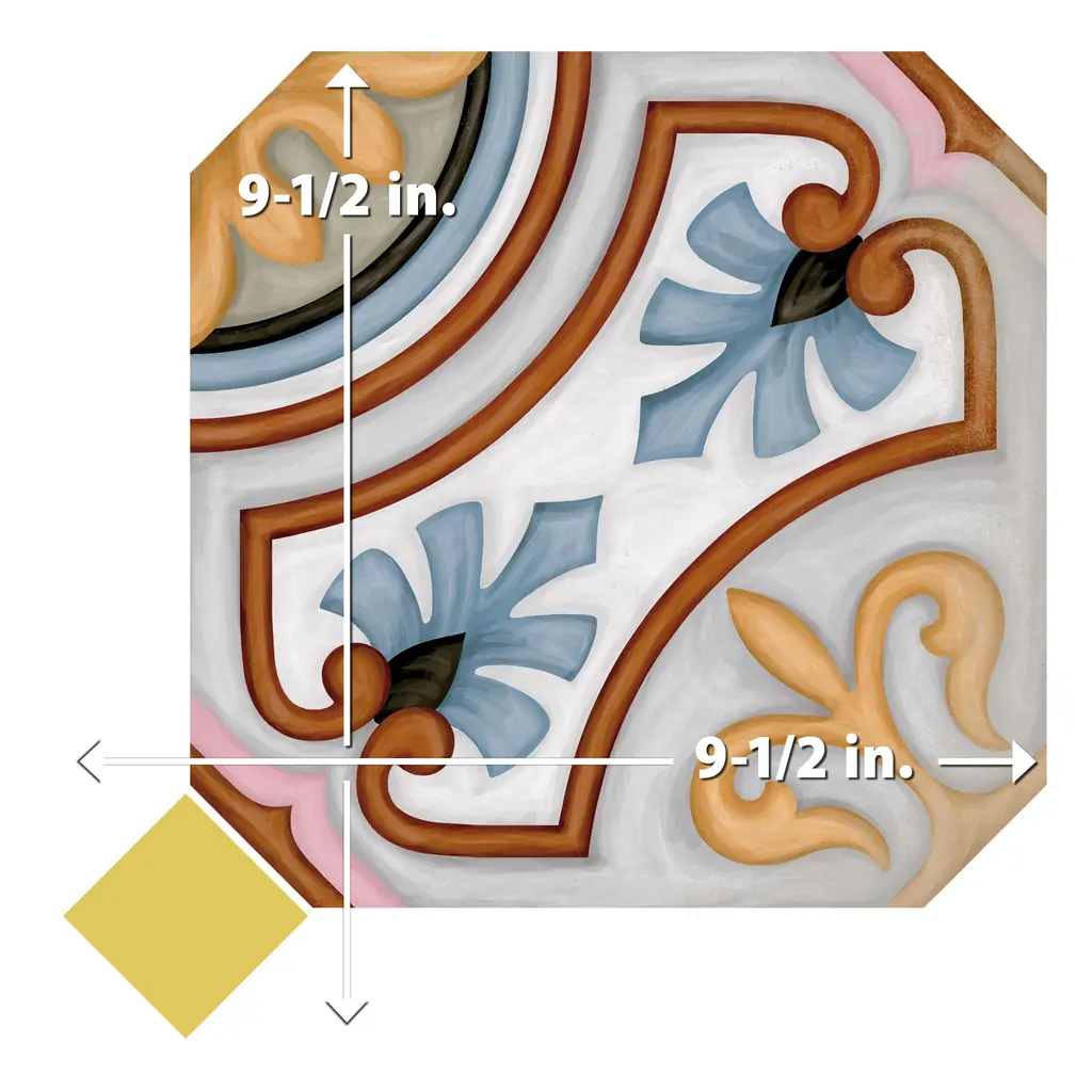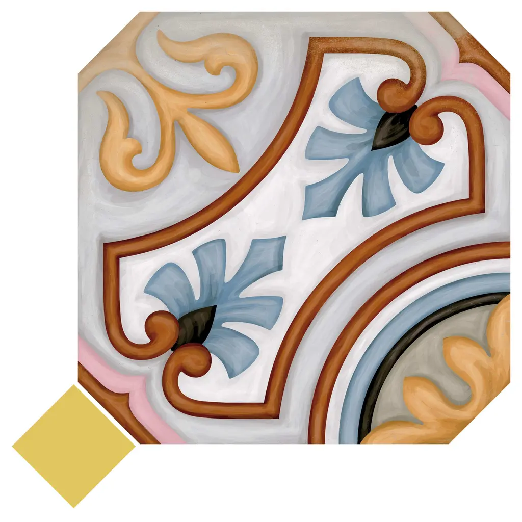 Inspired by a hand painted look, our Vaudeville Octagon Deco Diglas with Taco Lima Porcelain Floor and Wall Tile features a slightly textured, matte finish, providing decorative appeal that adapts to a variety of stylistic contexts. Inspired by Victorian-era Vaudeville, these geometric octagon tiles with a matte finish and customizable vibrant colors capture timeless elegance and vintage charm, creating a sophisticated, lively space reminiscent of the colorful variety acts of Vaudeville theatres. Containing 5 different print variations that are randomly distributed throughout each case, this gray specialty tile offers a one-of-a-kind look. With its impervious, frost-resistant features, this tile is an ideal selection for a variety of spaces including indoor and outdoor residential installations, bathrooms, backsplashes, showers, hallways, pools and fireplace facades. This tile is a perfect choice on its own or with other products in the Merola Tile, Vaudeville Collection. To ensure optimal results, please consult with your installer and review the product specifications to confirm that this tile meets the specific needs of your project.