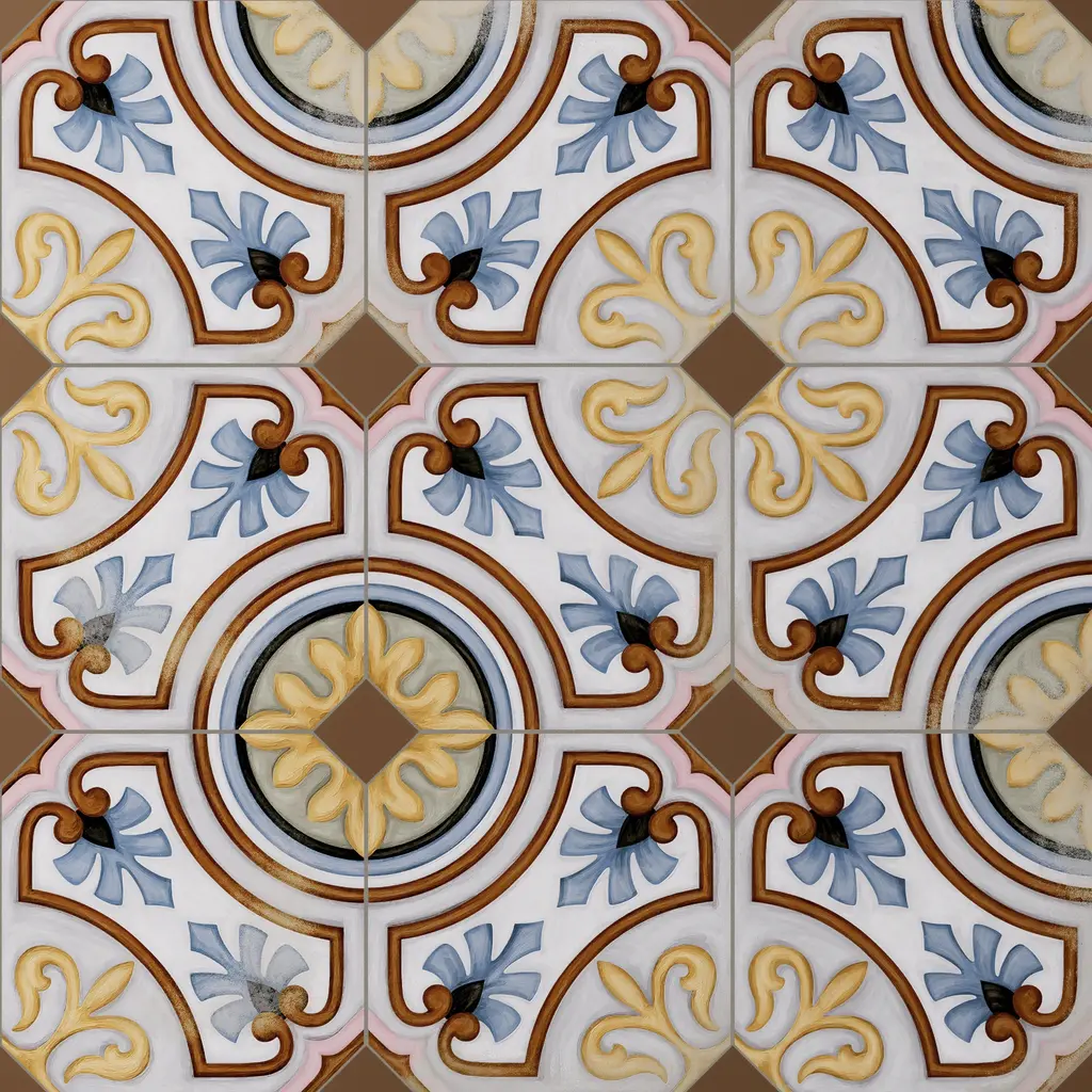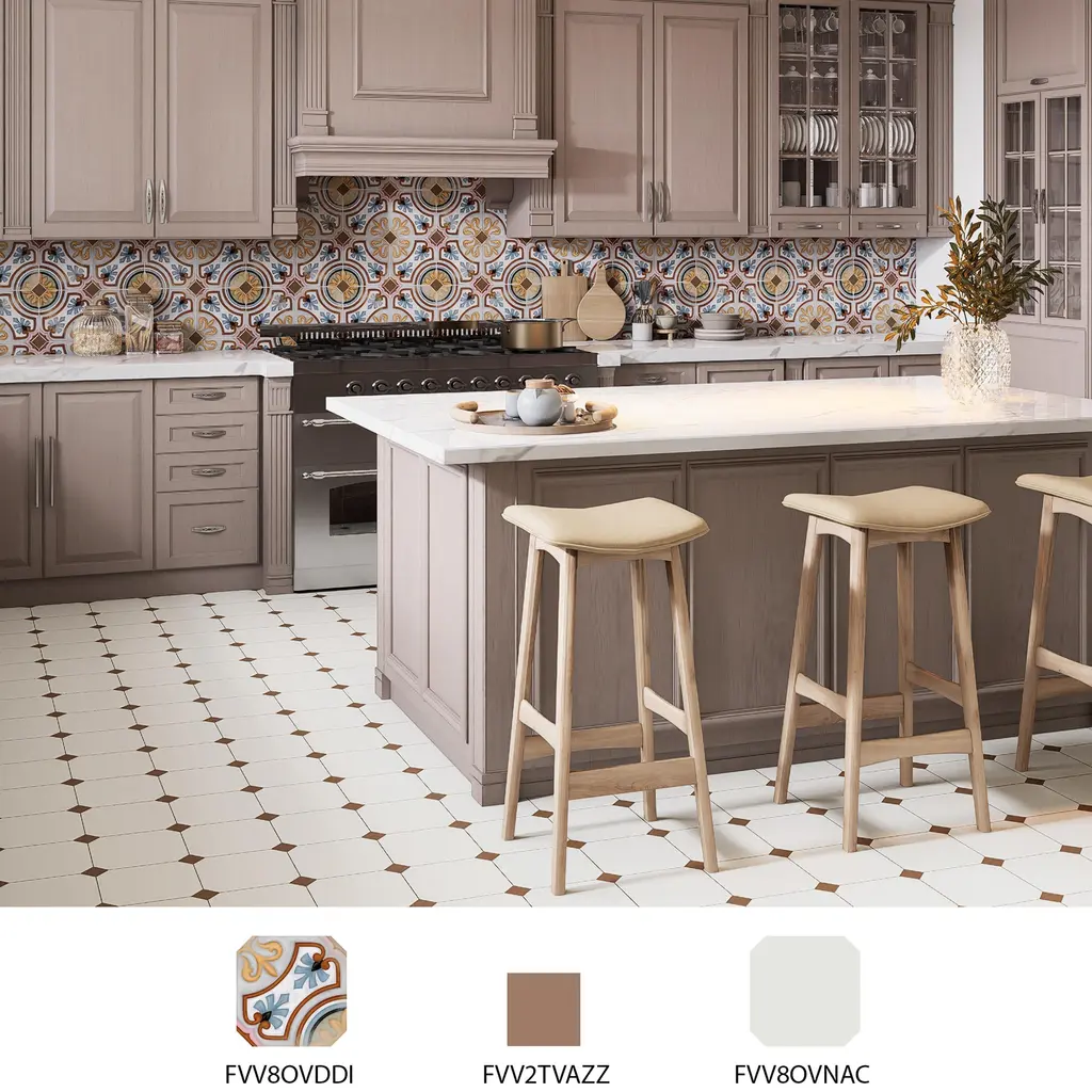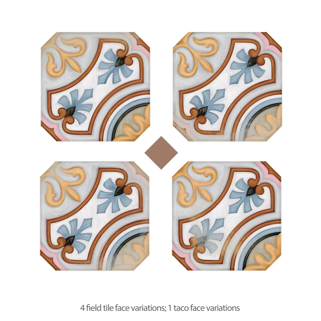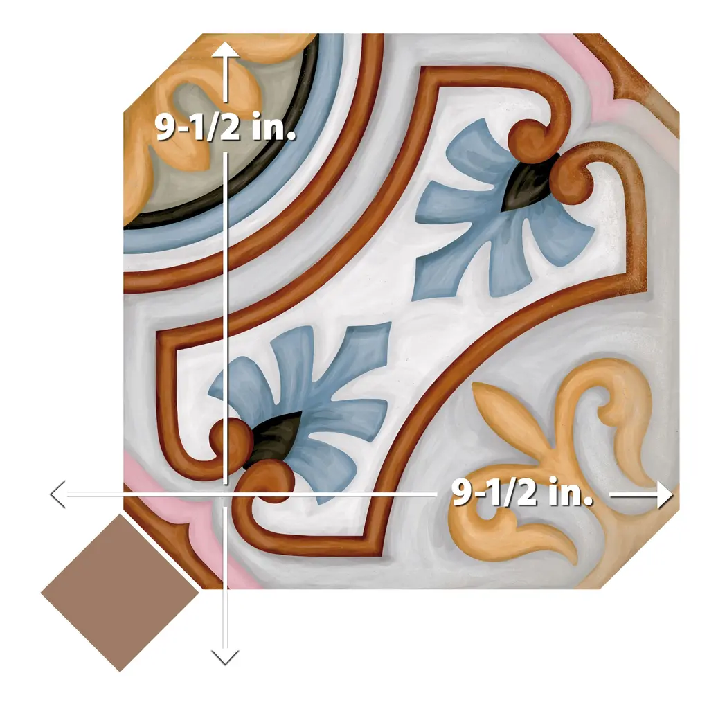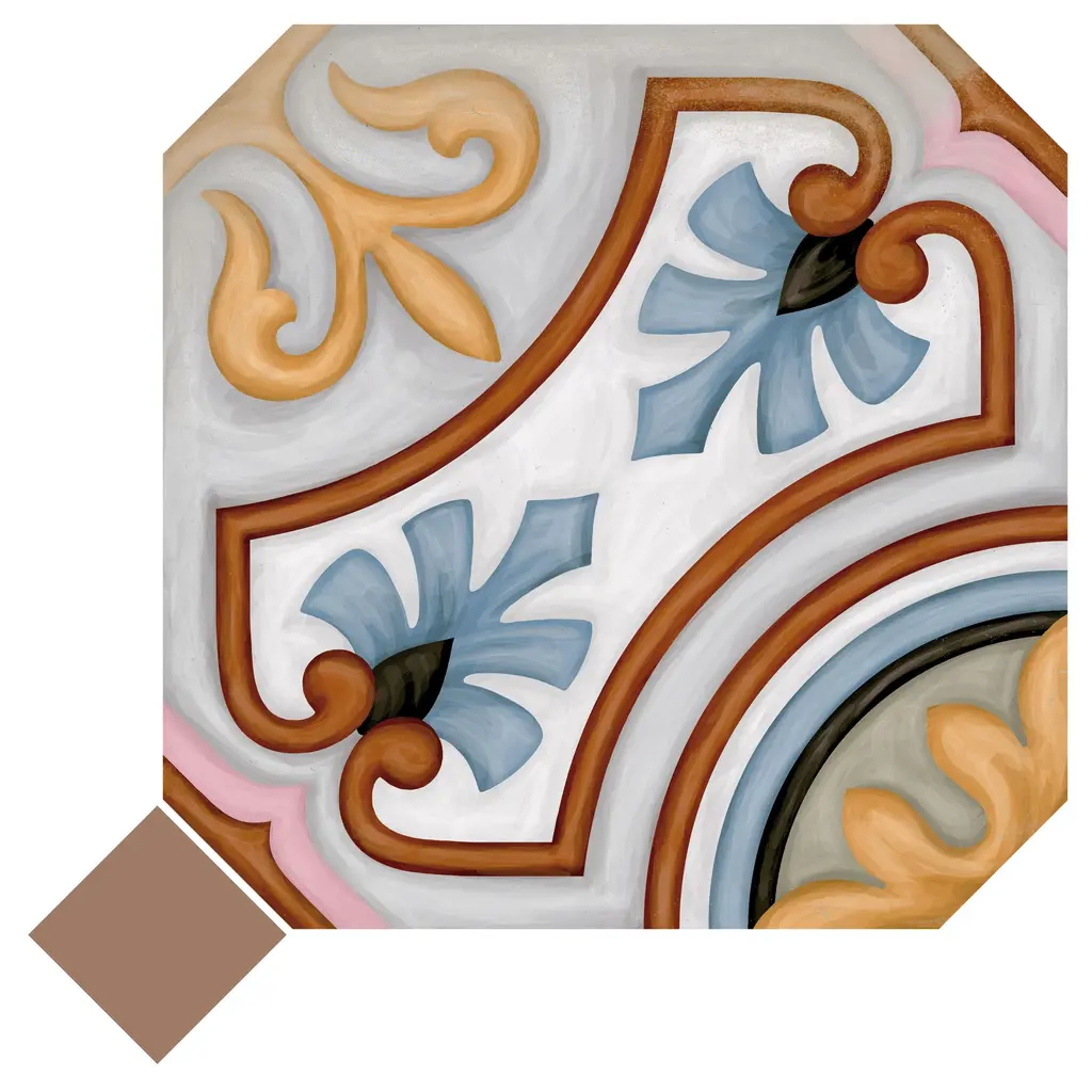 Inspired by a hand painted look, our Vaudeville Octagon Deco Diglas with Taco Marron Porcelain Floor and Wall Tile features a slightly textured, matte finish, providing decorative appeal that adapts to a variety of stylistic contexts. Inspired by Victorian-era Vaudeville, these geometric octagon tiles with a matte finish and customizable vibrant colors capture timeless elegance and vintage charm, creating a sophisticated, lively space reminiscent of the colorful variety acts of Vaudeville theatres. Containing 5 different print variations that are randomly distributed throughout each case, this gray specialty tile offers a one-of-a-kind look. With its impervious, frost-resistant features, this tile is an ideal selection for a variety of spaces including indoor and outdoor residential installations, bathrooms, backsplashes, showers, hallways, pools and fireplace facades. This tile is a perfect choice on its own or with other products in the Merola Tile, Vaudeville Collection. To ensure optimal results, please consult with your installer and review the product specifications to confirm that this tile meets the specific needs of your project.