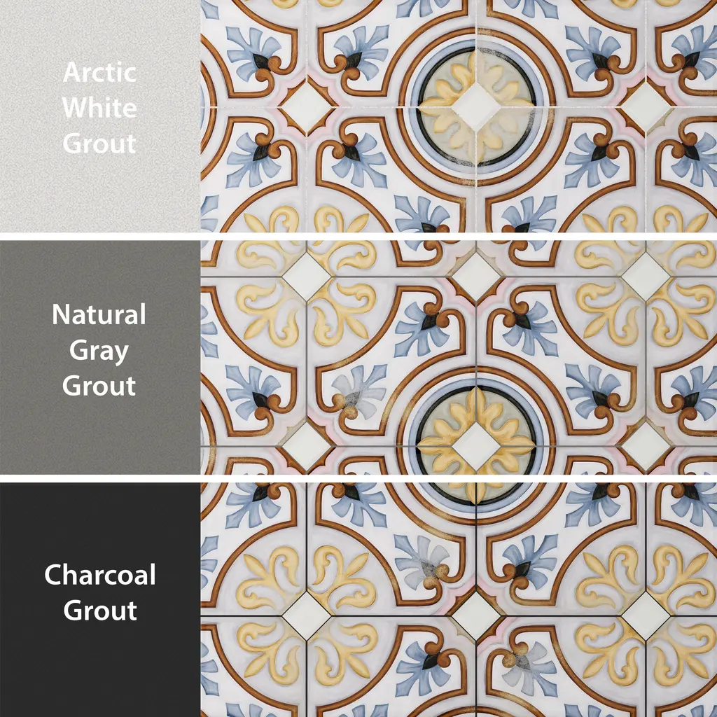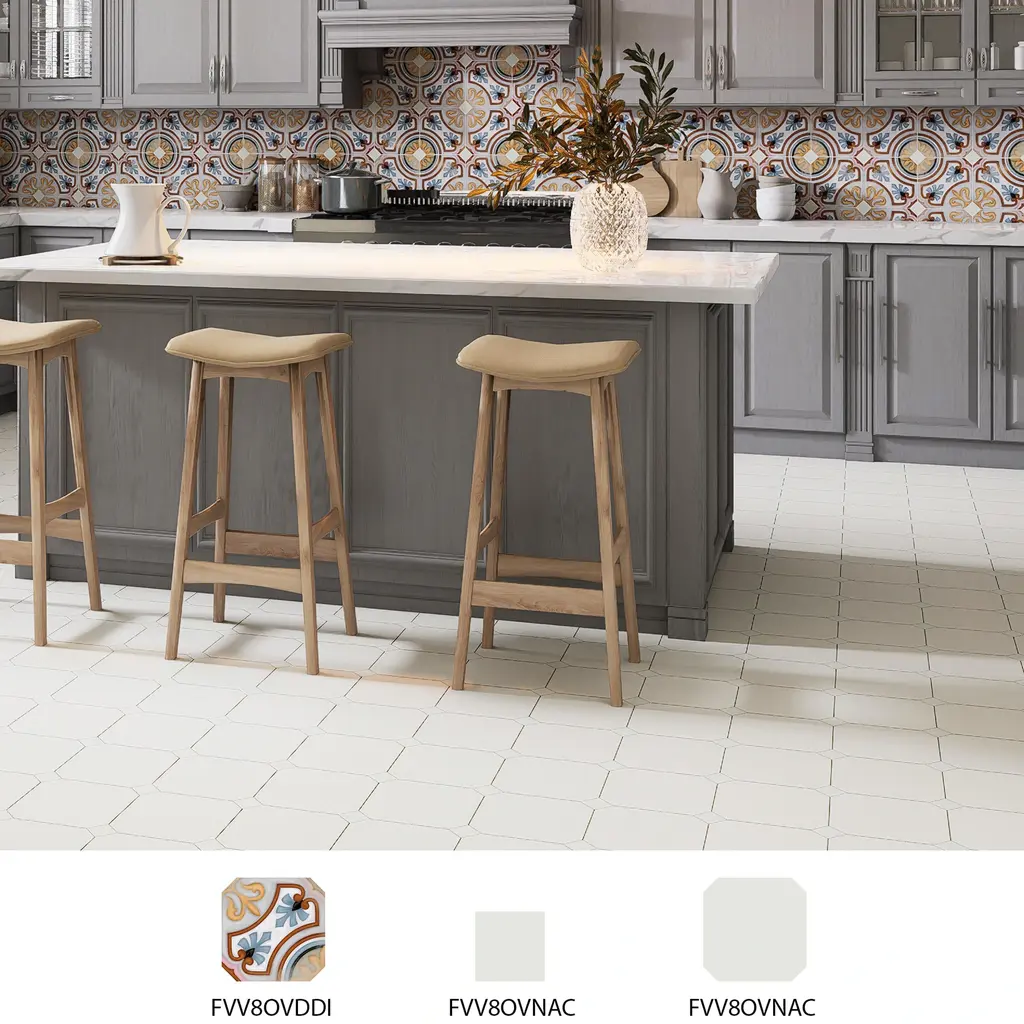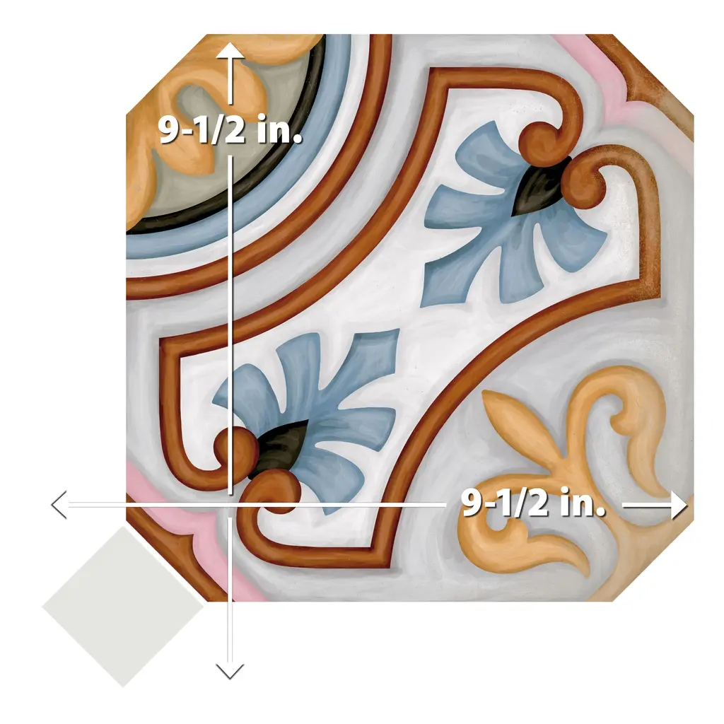 Inspired by a hand painted look, our Vaudeville Octagon Deco Diglas with Taco Nacar Porcelain Floor and Wall Tile features a slightly textured, matte finish, providing decorative appeal that adapts to a variety of stylistic contexts. Inspired by Victorian-era Vaudeville, these geometric octagon tiles with a matte finish and customizable vibrant colors capture timeless elegance and vintage charm, creating a sophisticated, lively space reminiscent of the colorful variety acts of Vaudeville theatres. Containing 5 different print variations that are randomly distributed throughout each case, this gray specialty tile offers a one-of-a-kind look. With its impervious, frost-resistant features, this tile is an ideal selection for a variety of spaces including indoor and outdoor commercial and residential installations, kitchens, bathrooms, backsplashes, showers, hallways, entryways, patios, pools and fireplace facades. This tile is a perfect choice on its own or with other products in the Merola Tile, Vaudeville Collection. To ensure optimal results, please consult with your installer and review the product specifications to confirm that this tile meets the specific needs of your project.