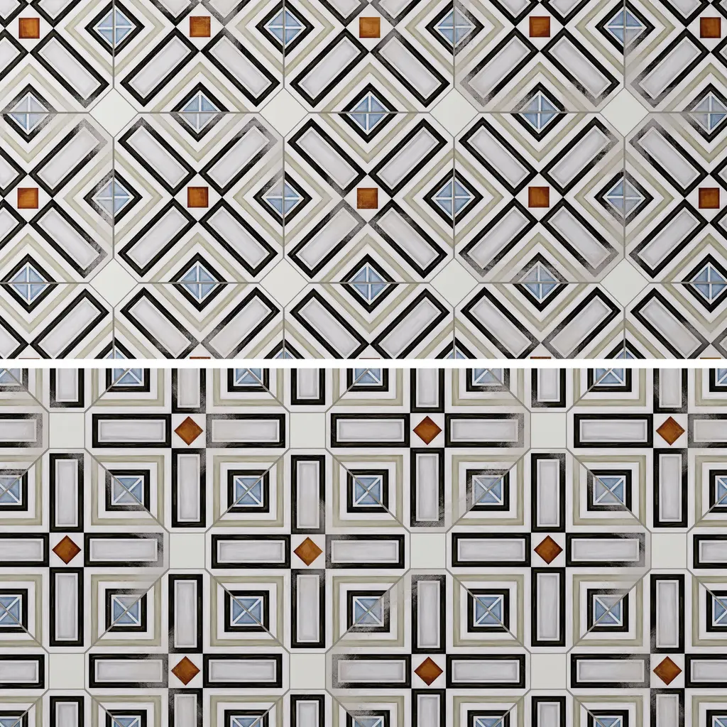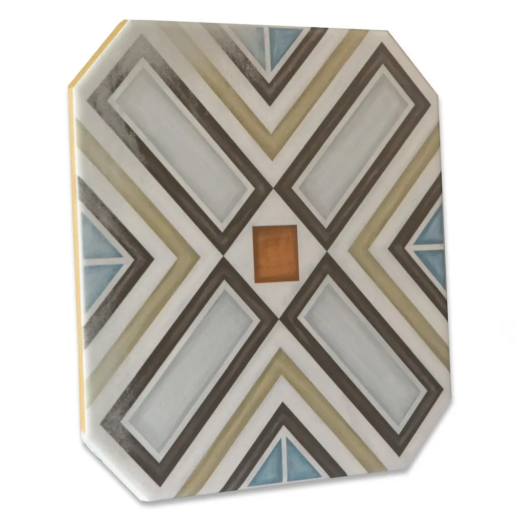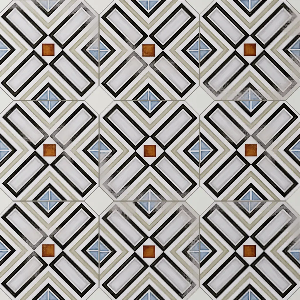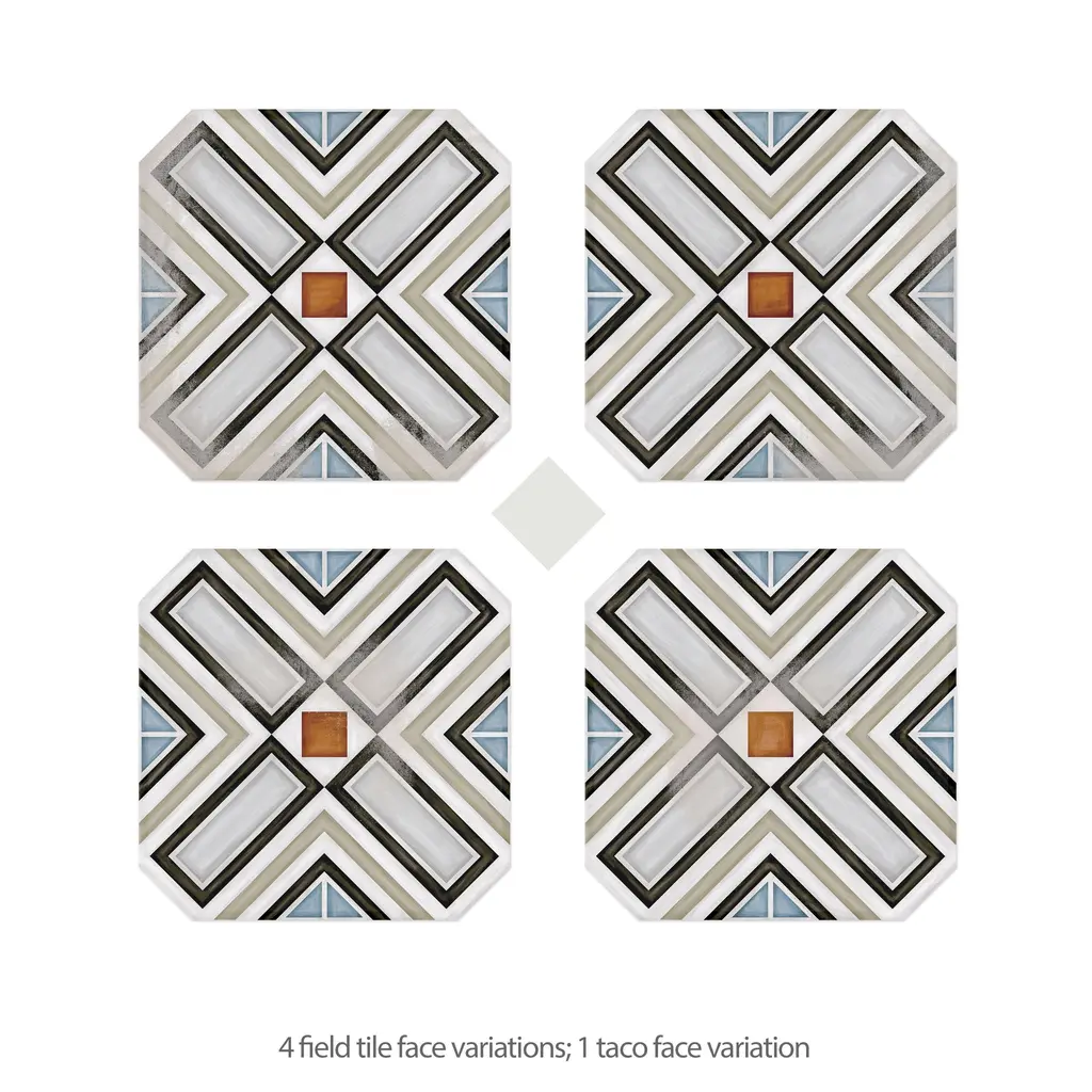 Inspired by a hand painted look, our Vaudeville Octagon Deco Ritter with Taco Nacar Porcelain Floor and Wall Tile features a slightly textured, matte finish, providing decorative appeal that adapts to a variety of stylistic contexts. Inspired by Victorian-era Vaudeville, these geometric octagon tiles with a matte finish and customizable vibrant colors capture timeless elegance and vintage charm, creating a sophisticated, lively space reminiscent of the colorful variety acts of Vaudeville theatres. Containing 5 different print variations that are randomly distributed throughout each case, this white specialty tile offers a one-of-a-kind look. With its impervious, frost-resistant features, this tile is an ideal selection for a variety of spaces including indoor and outdoor commercial and residential installations, kitchens, bathrooms, backsplashes, showers, hallways, entryways, patios, pools and fireplace facades. This tile is a perfect choice on its own or with other products in the Merola Tile, Vaudeville Collection. To ensure optimal results, please consult with your installer and review the product specifications to confirm that this tile meets the specific needs of your project.