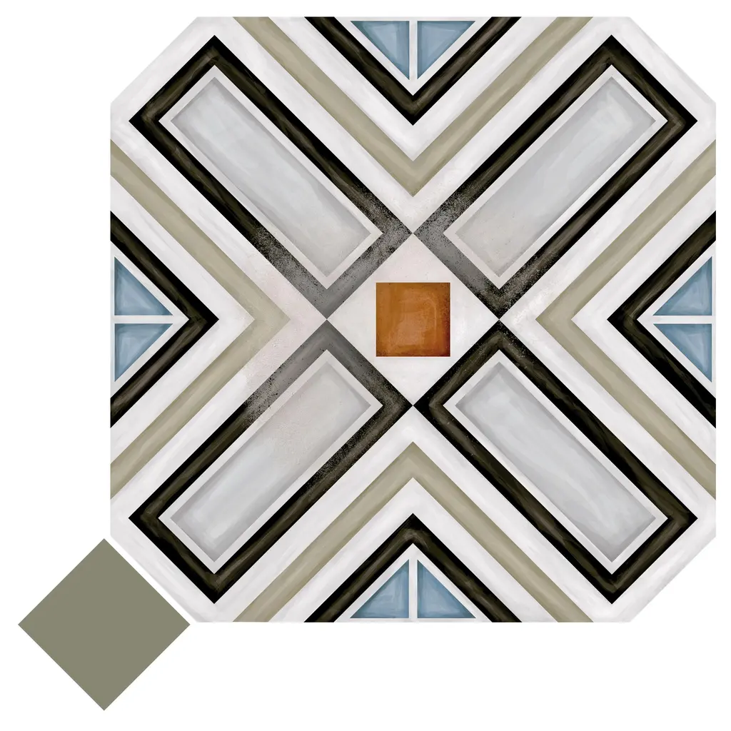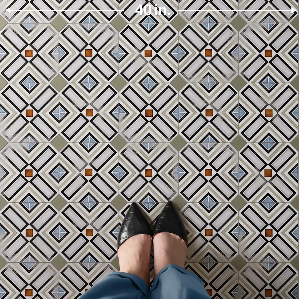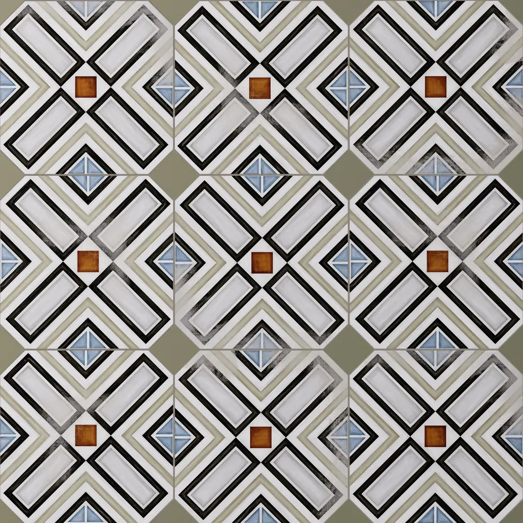 Inspired by a hand painted look, our Vaudeville Octagon Deco Ritter with Taco Oliva Porcelain Floor and Wall Tile features a slightly textured, matte finish, providing decorative appeal that adapts to a variety of stylistic contexts. Inspired by Victorian-era Vaudeville, these geometric octagon tiles with a matte finish and customizable vibrant colors capture timeless elegance and vintage charm, creating a sophisticated, lively space reminiscent of the colorful variety acts of Vaudeville theatres. Containing 5 different print variations that are randomly distributed throughout each case, this white specialty tile offers a one-of-a-kind look. With its impervious, frost-resistant features, this tile is an ideal selection for a variety of spaces including indoor and outdoor residential installations, kitchens, bathrooms, backsplashes, showers, hallways, pools and fireplace facades. This tile is a perfect choice on its own or with other products in the Merola Tile, Vaudeville Collection. To ensure optimal results, please consult with your installer and review the product specifications to confirm that this tile meets the specific needs of your project.