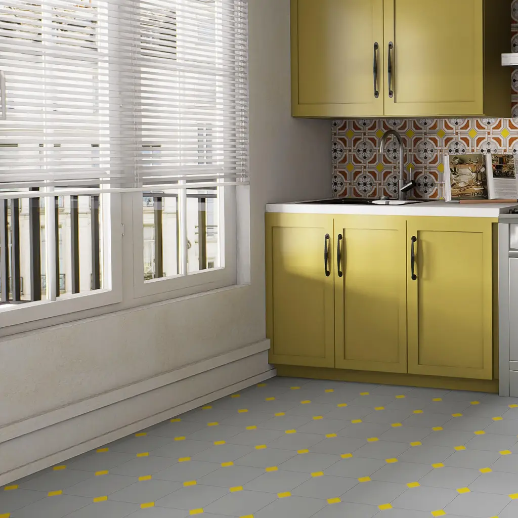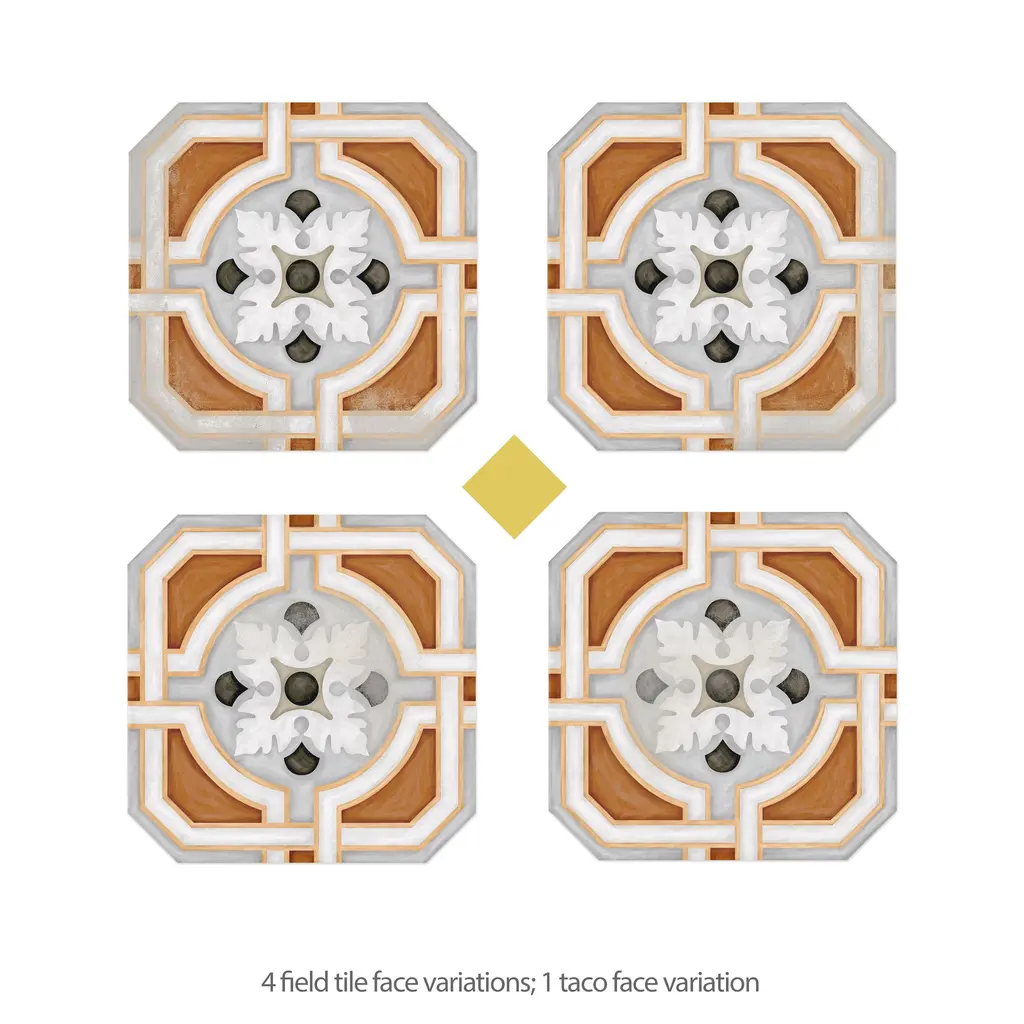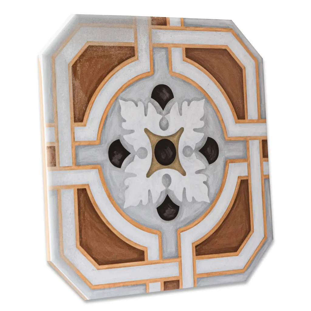 Inspired by a hand painted look, our Vaudeville Octagon Deco Zimmer with Taco Lima Porcelain Floor and Wall Tile features a slightly textured, matte finish, providing decorative appeal that adapts to a variety of stylistic contexts. Inspired by Victorian-era Vaudeville, these geometric octagon tiles with a matte finish and customizable vibrant colors capture timeless elegance and vintage charm, creating a sophisticated, lively space reminiscent of the colorful variety acts of Vaudeville theatres. Containing 5 different print variations that are randomly distributed throughout each case, this brown specialty tile offers a one-of-a-kind look. With its impervious, frost-resistant features, this tile is an ideal selection for a variety of spaces including indoor and outdoor residential installations, bathrooms, backsplashes, showers, hallways, pools and fireplace facades. This tile is a perfect choice on its own or with other products in the Merola Tile, Vaudeville Collection. To ensure optimal results, please consult with your installer and review the product specifications to confirm that this tile meets the specific needs of your project.