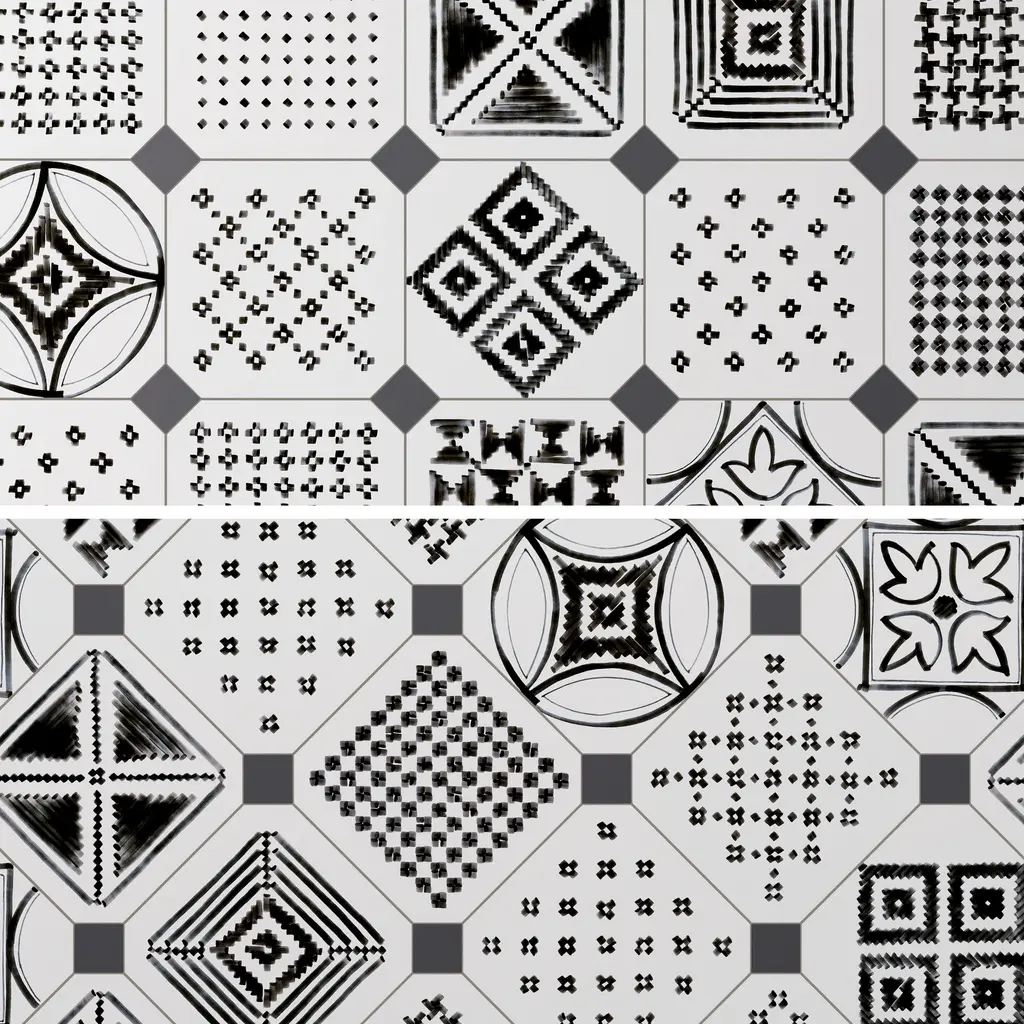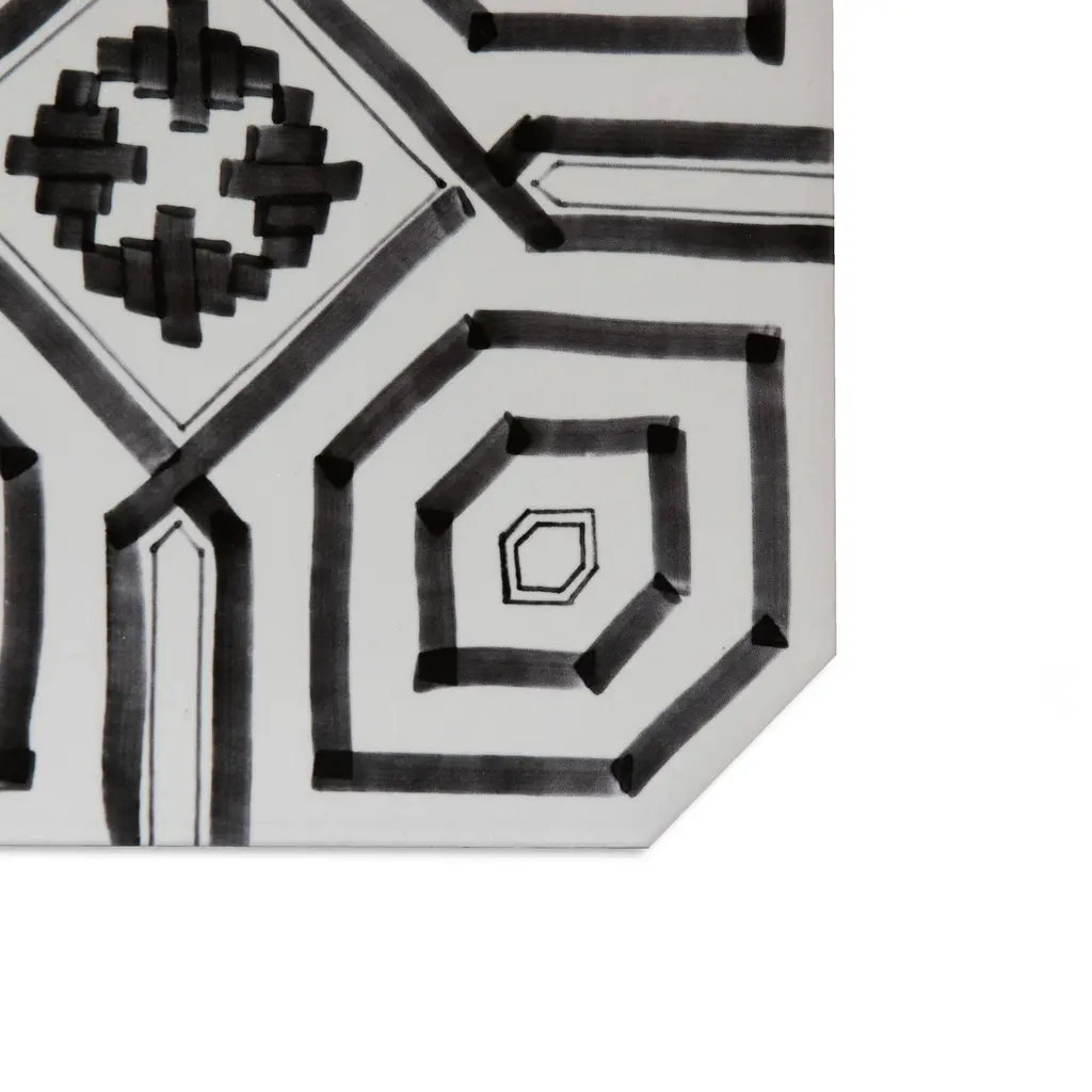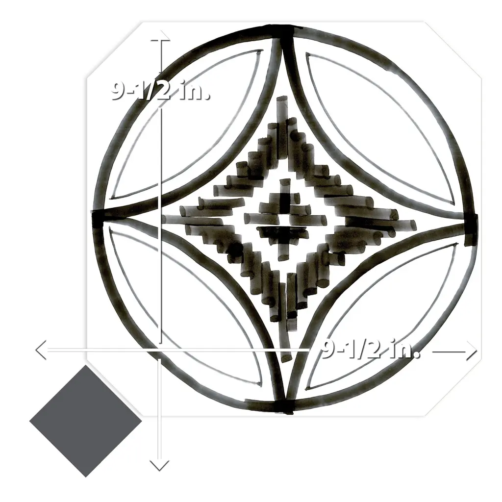 Inspired by a hand painted look, our Vaudeville Octagon Sombra with Taco Antracita Porcelain Floor and Wall Tile features a slightly textured, matte finish, providing decorative appeal that adapts to a variety of stylistic contexts. Inspired by Victorian-era Vaudeville, these geometric octagon tiles with a matte finish and customizable vibrant colors capture timeless elegance and vintage charm, creating a sophisticated, lively space reminiscent of the colorful variety acts of Vaudeville theatres. Containing 37 different print variations that are randomly distributed throughout each case, this white specialty tile offers a one-of-a-kind look. With its impervious, frost-resistant features, this tile is an ideal selection for a variety of spaces including indoor and outdoor residential installations, bathrooms, backsplashes, showers, hallways, pools and fireplace facades. This tile is a perfect choice on its own or with other products in the Merola Tile, Vaudeville Collection. To ensure optimal results, please consult with your installer and review the product specifications to confirm that this tile meets the specific needs of your project.