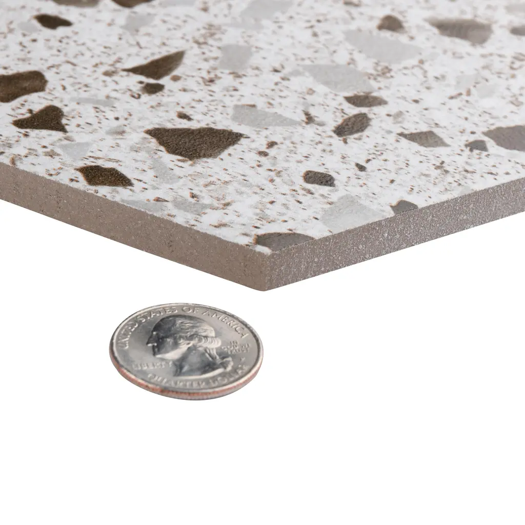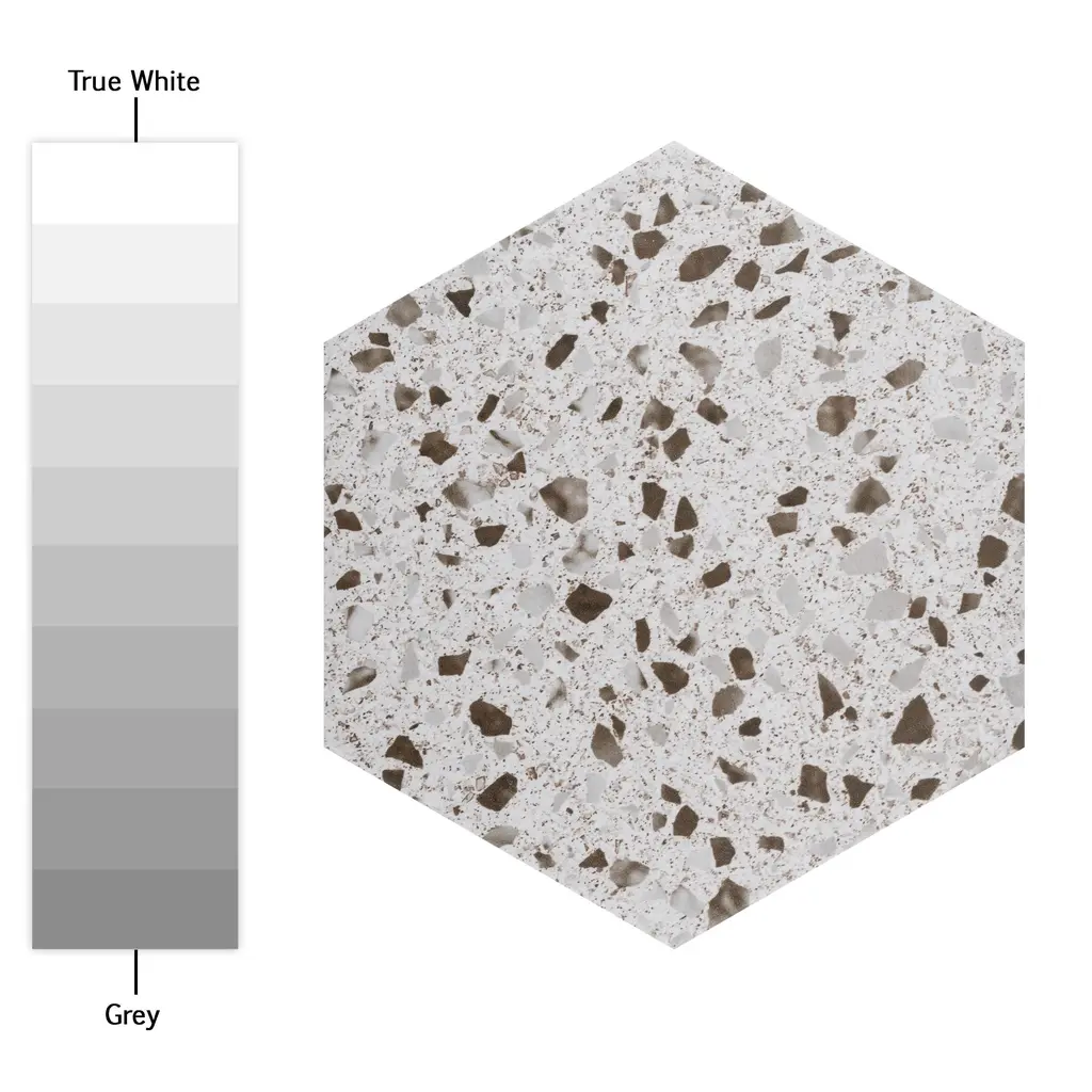 Replicating a terrazzo look, our Venice Hex XT White Porcelain Floor and Wall Tile features a slightly textured, matte finish, providing decorative appeal that adapts to a variety of stylistic contexts. Containing 21 different print variations that are randomly distributed throughout each case, this white hexagon tile offers a one-of-a-kind look. With its impervious, frost-resistant features, this tile is an ideal selection for a variety of spaces including indoor and outdoor commercial and residential installations, kitchens, bathrooms, backsplashes, showers, hallways, entryways, patios, pools and fireplace facades. This tile is a perfect choice on its own or with other products in the Merola Tile, Venice Collection. To ensure optimal results, please consult with your installer and review the product specifications to confirm that this tile meets the specific needs of your project.