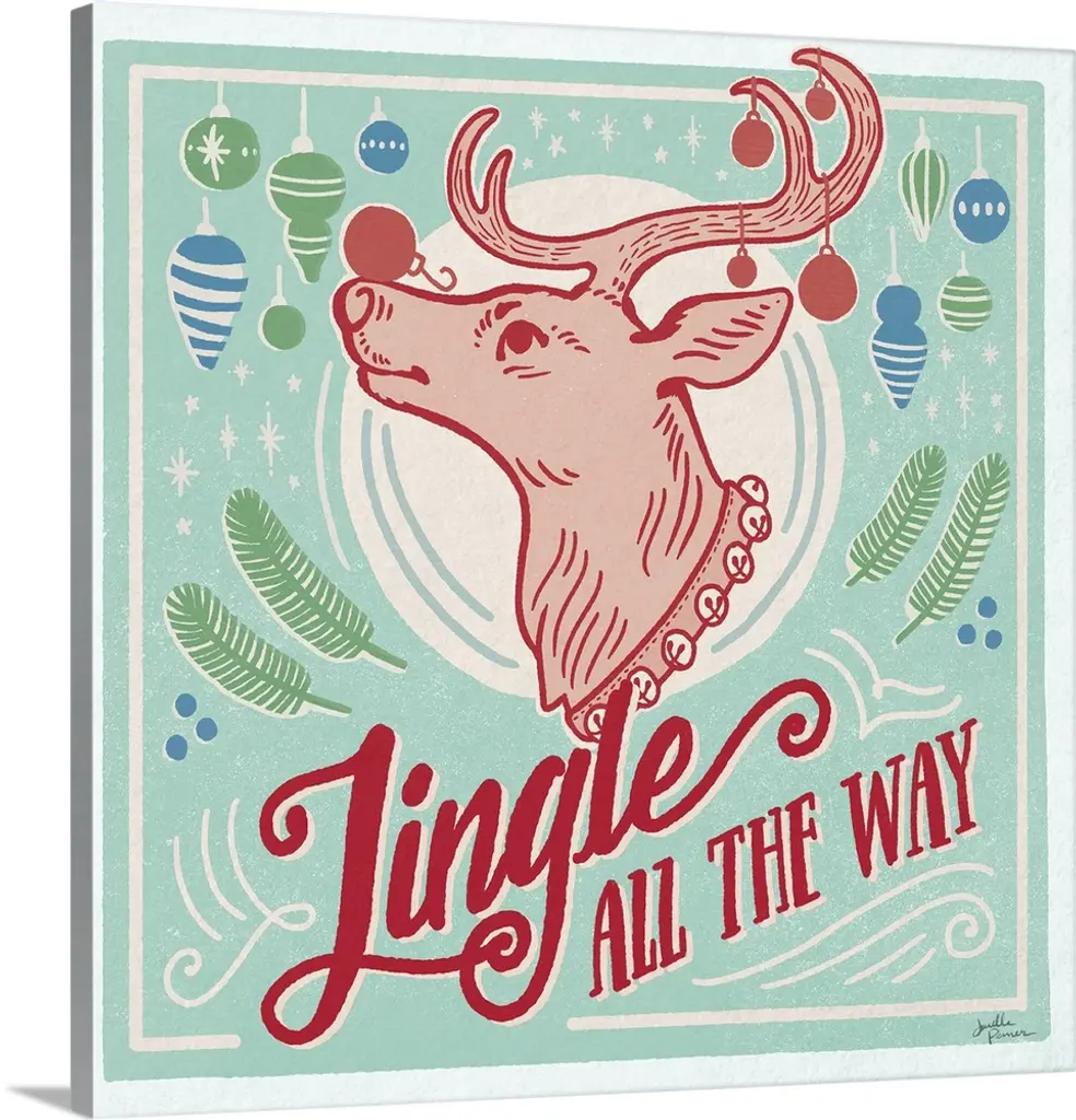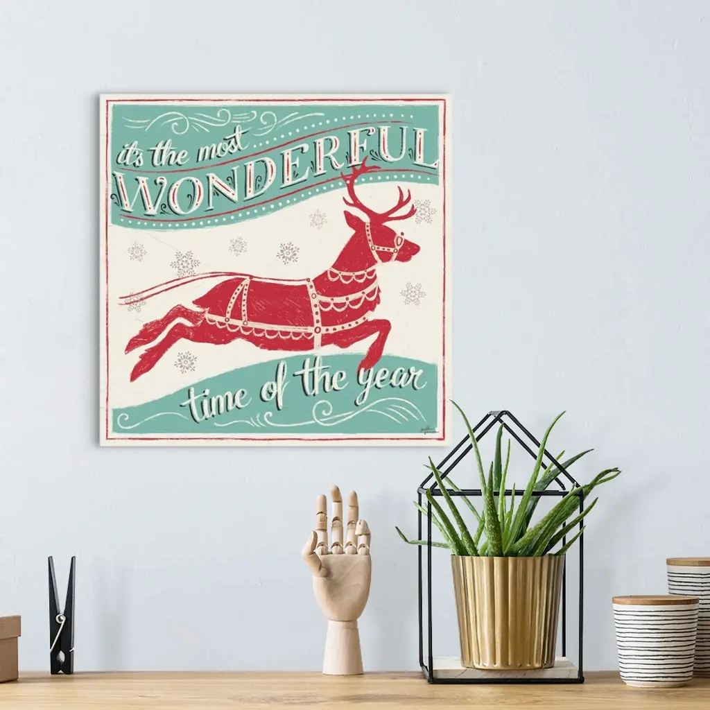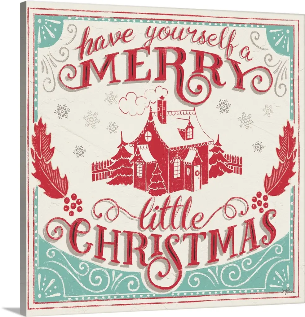 A modern decorative design in teal and red of a couple holding hands in the snow with the text "Walking in a Winter Wonderland".