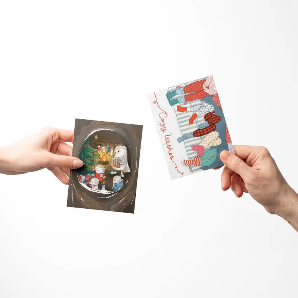 This 3-pack of assorted Winter/Holiday/Christmas greeting cards is elegantly illustrated by artist Ingrid Ramus, founder and owner of the Ramus & Co brand. The cards are blank inside. All greeting cards are made in the USA on heavyweight uncoated and locally-manufactured card stock. Each card is individually wrapped in TUV Austria certified-compostable PLA sleeves that meet both ASTM D6400 & EN 13432 standards. Each card is accompanied by a hand-embossed envelope made with heavyweight 95lb paper and a peel-and-stick flap - no licking envelopes here! All Ramus & Co. greeting cards are printed on FSC¬¨¬ and SFI¬¨¬ certified paper sourced from a regional mill that harnesses 66% of its energy from on-site sustainable sources, such as emission-free hydroelectricity and biomass co-generation from wood waste. Additionally, our greeting cards are thoughtfully packaged in bags made from certified compostable PLA material. Husband-and-wife team Calvin and Ingrid Ramus founded Ramus & Company in 2019, in New England, USA. Ingrid, the creative designer behind the brand, originates from Mexico, where she cultivated her skills in fashion and textile design. Drawing from her unique and inquisitive perspective on preppy style, Ingrid prolifically designs whimsical yet classic stationery and lifestyle items.